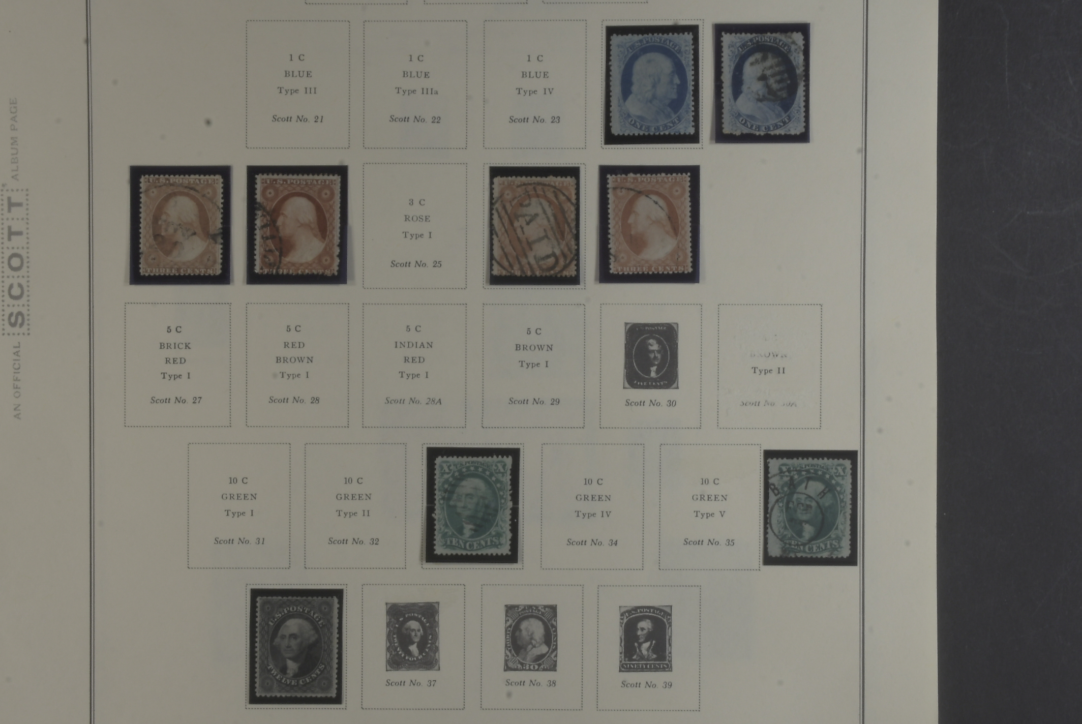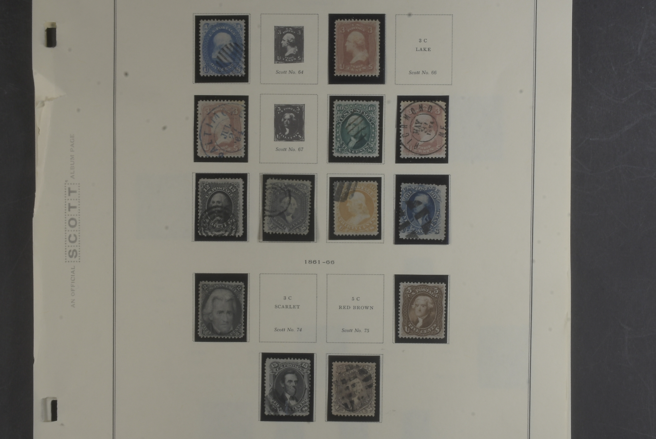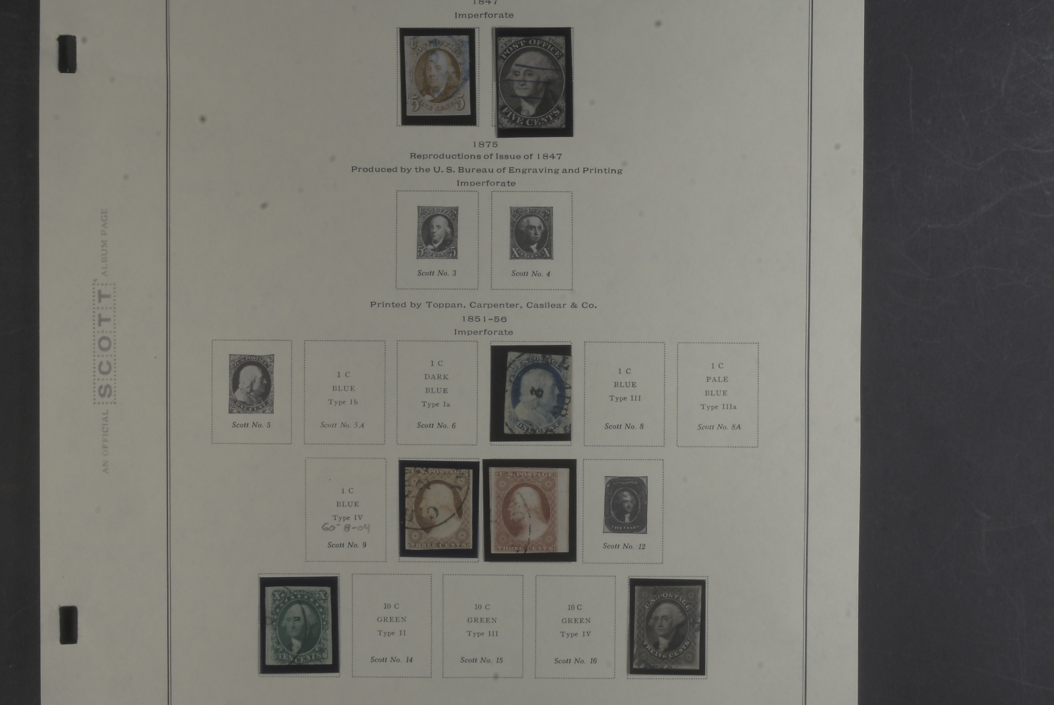 U.S.A. Mostly used on two leaves. Useful mostly used collection, mostly used including Washington #1, New York 5ct #9X1, various imperfs to 12cts of the 1851 issue, then 1857/61 inc unused 12cts Scott #36, 1861/62 virtually complete to 90cts, 1861/66 to 24cts with unused 5cts Jefferson (Scott #76) and 2cts Blackjack (Scott #73). Very high cat. Mostly fine quality.