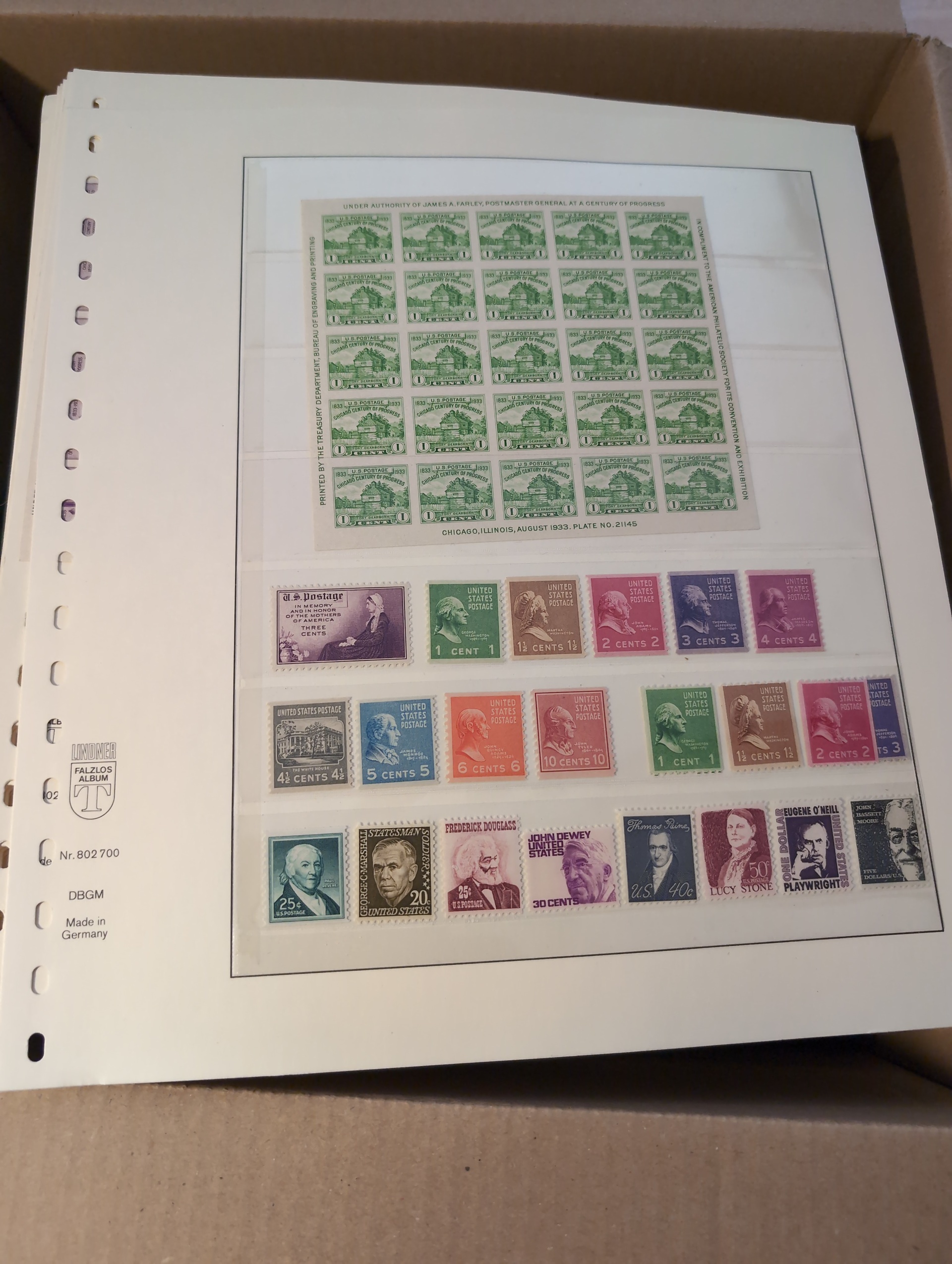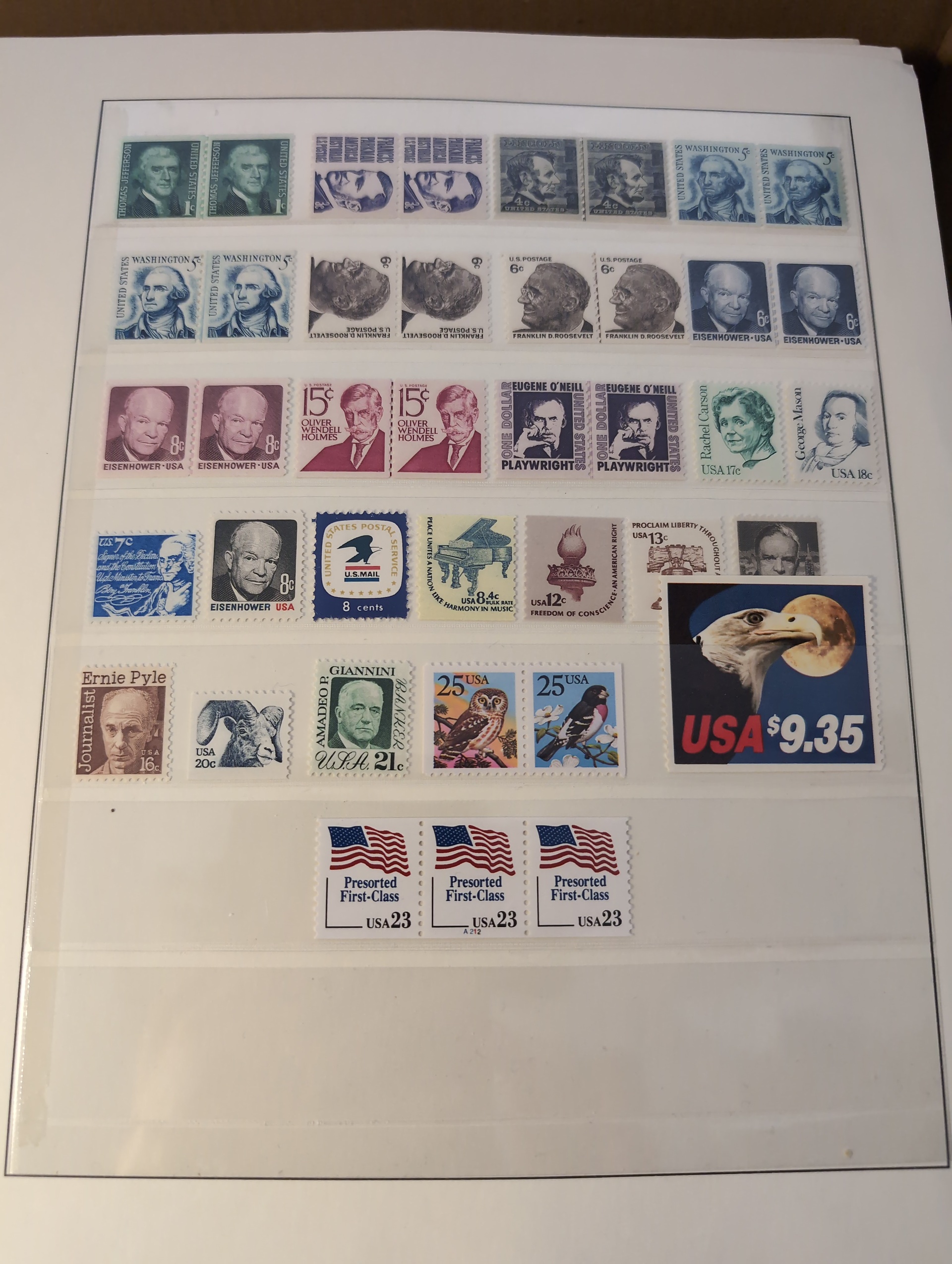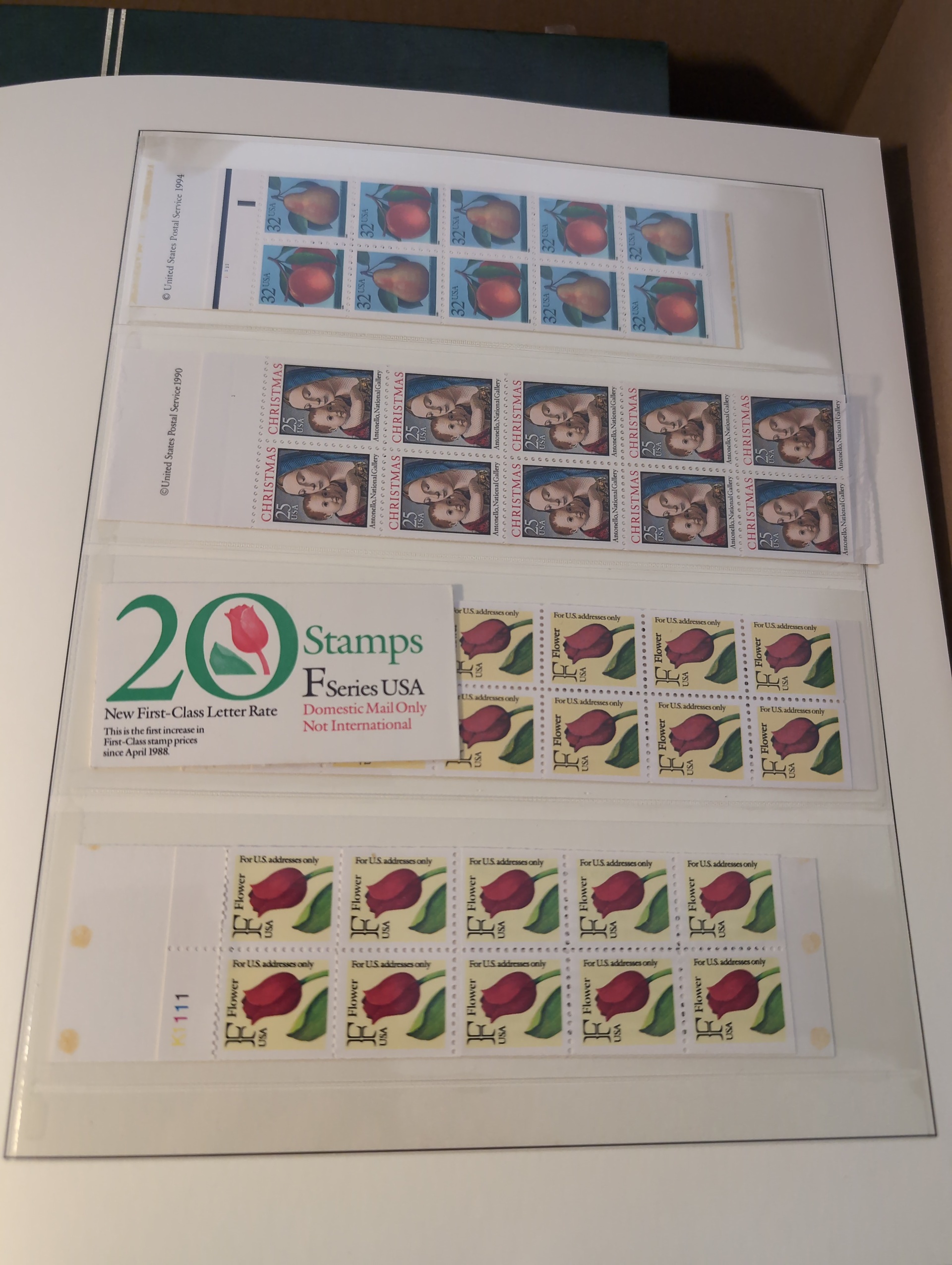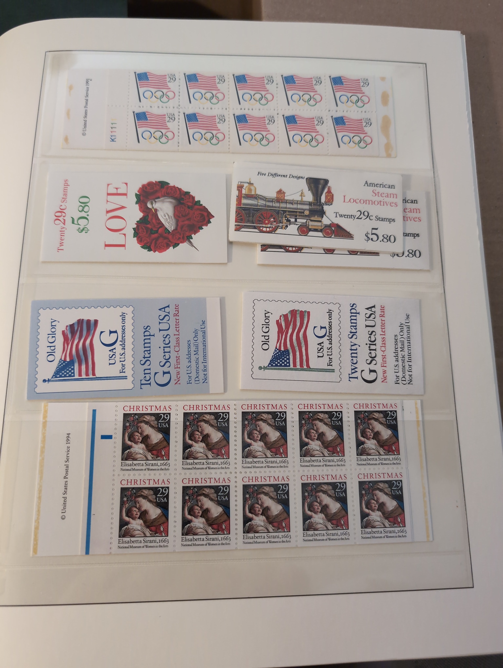 U.S.A. Accumulation ★★ 1930s–c2015 in box. One album with modern sheets, stockbook with modern stamps and booklets 1990s–early 2000s. 2 Albums with blocks of six all with "post early" tabs. Pages with booklets 1970s–1990s and some assorted stamps 1930s–1960s. Mostly fine quality. Approx. 13 kg. (1000s)