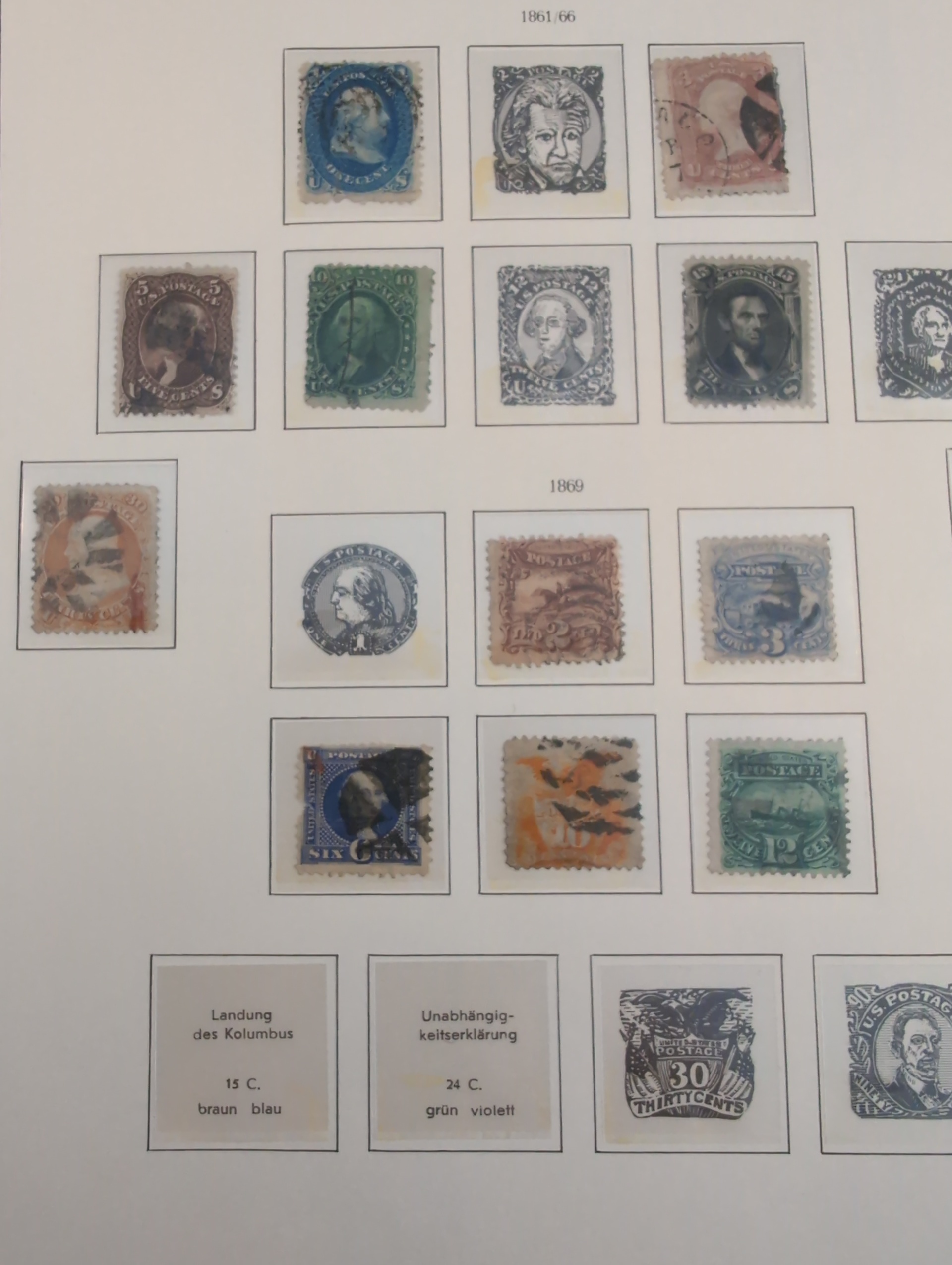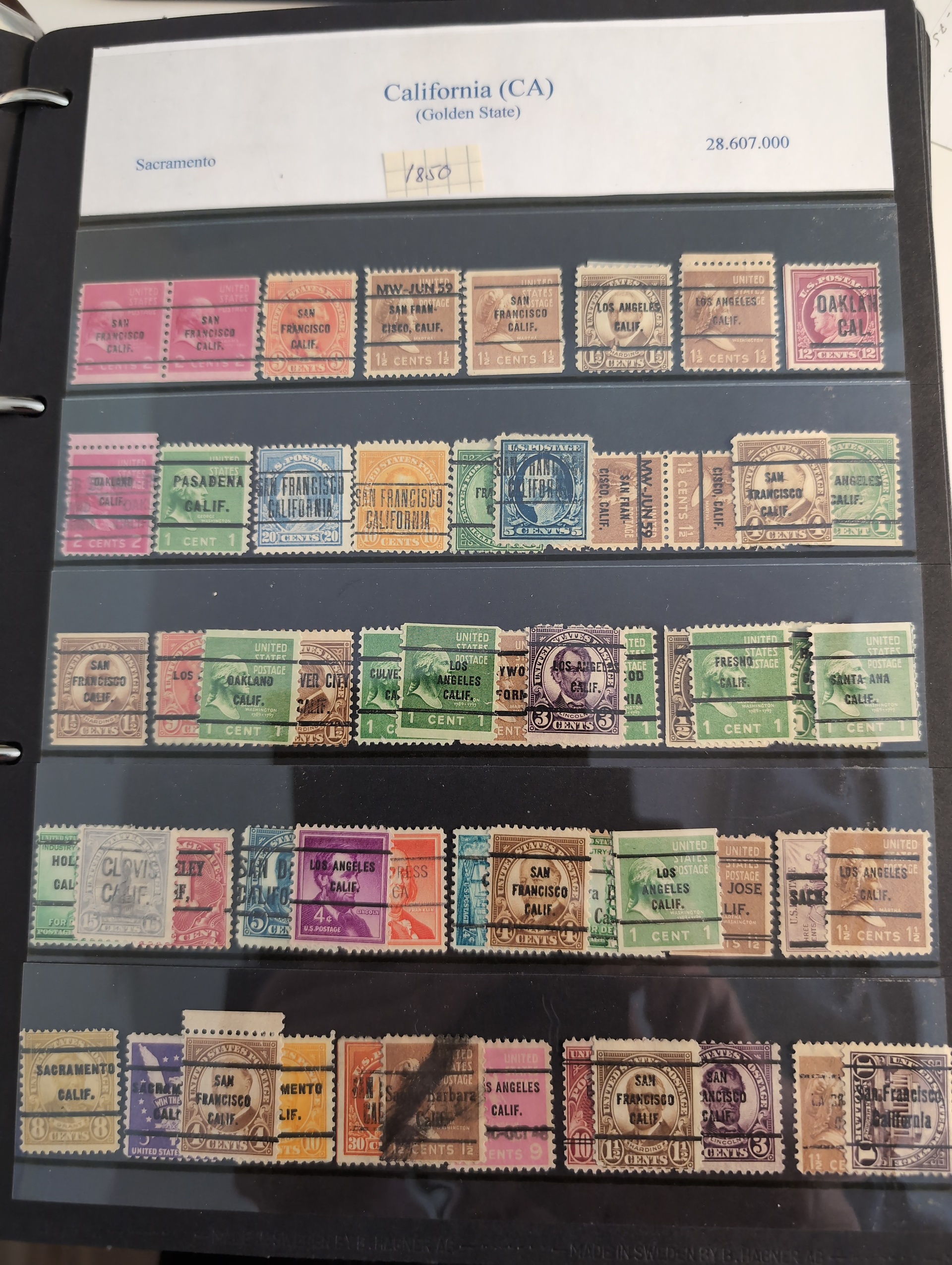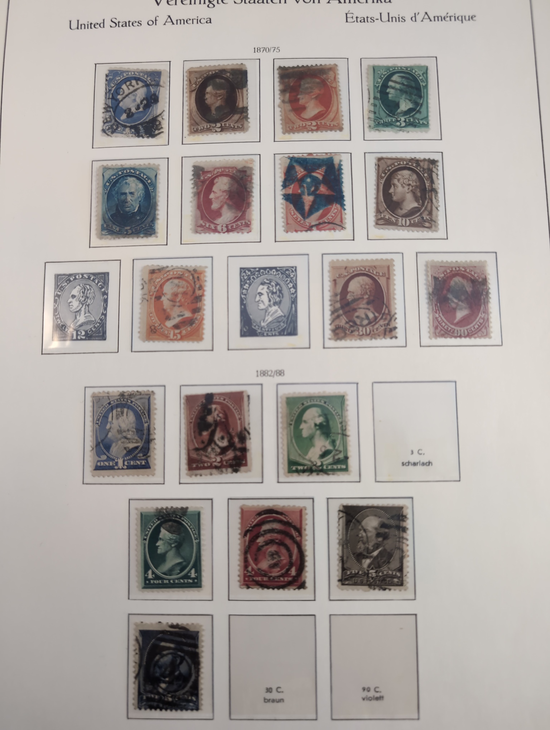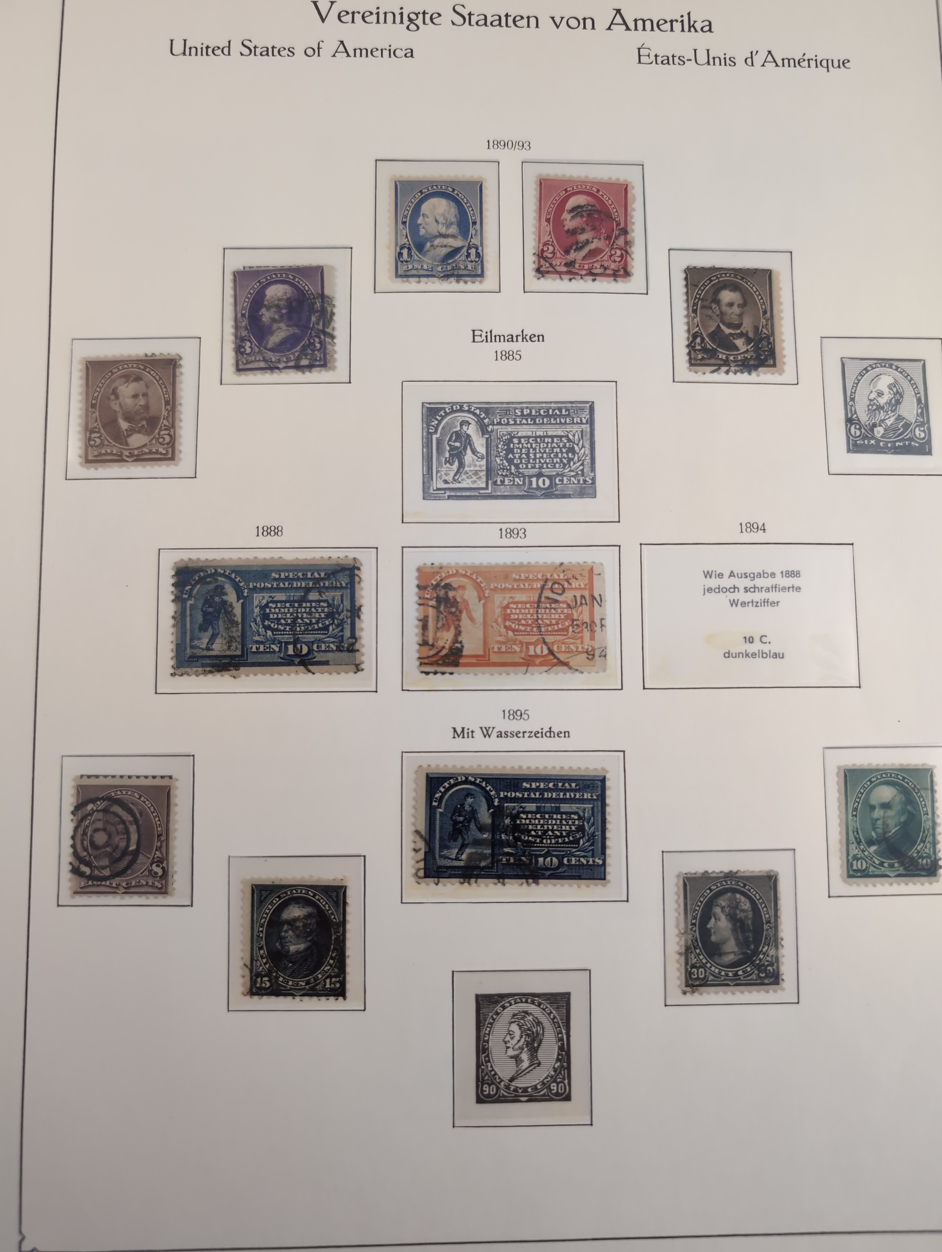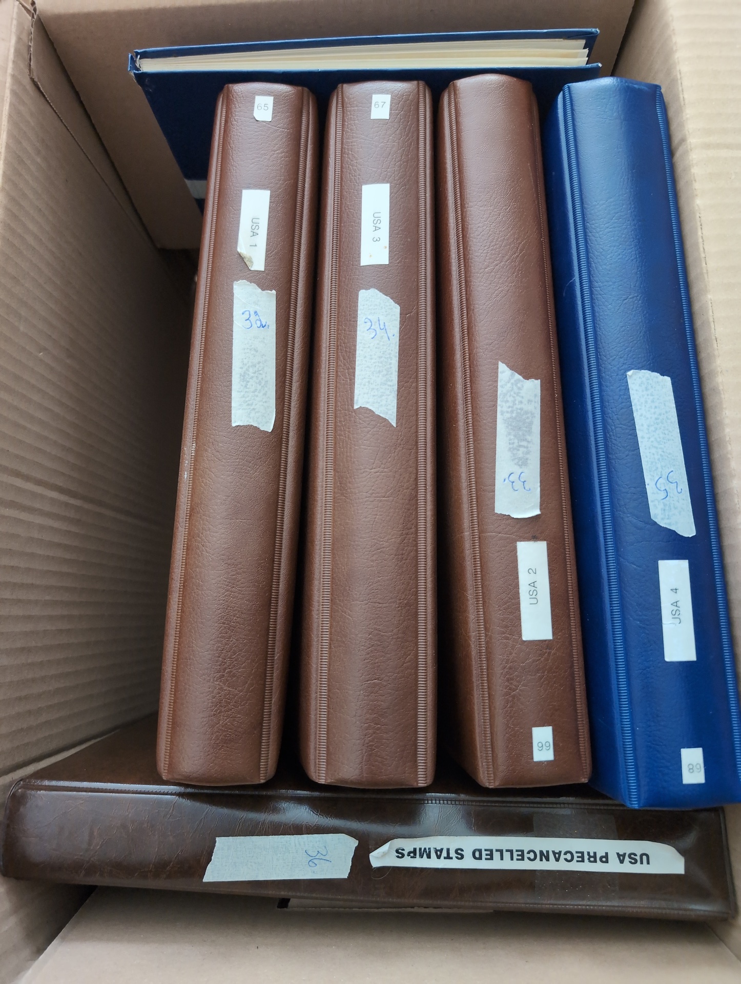U.S.A. Collection/accumulation ★★/★/⊙ 1851–1996 in box. Four Ka-be albums (1847–1993) with a few better stamps. e.g. Jefferson 5 c 1861, Lincoln 15 c w. grill, Perry 1870 and Colombus up to 30 c. From 1920s mixed mint and used and well filled. Also included album with pre-cancels (1750 pcs) but mostly common good spread of different stamps. One stockbook mostly mint duplicates. Please see a selection of scans at www.philea.se. Mostly fine quality. Approx. 13 kg. (3000+)