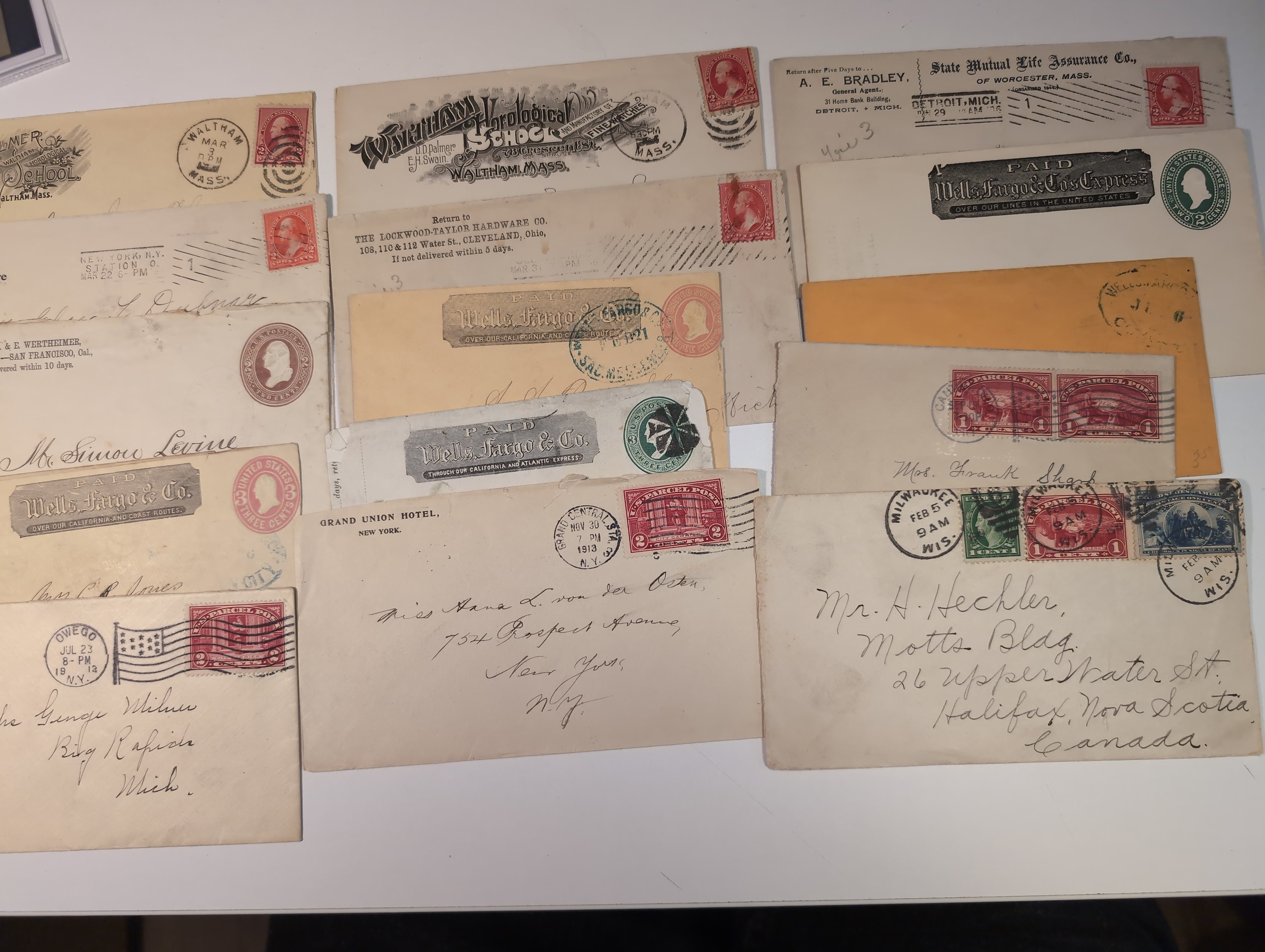 U.S.A. Lot covers 1860s–1920s. Incl. seven with parcel post stamps and five Wells fargo stamped envelopes. Please see a selection of scans at www.philea.se. Mostly good quality. (20)
