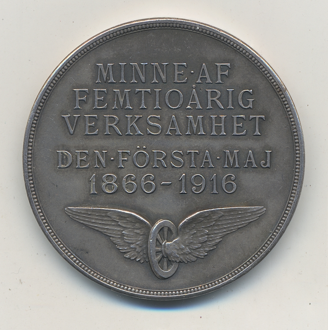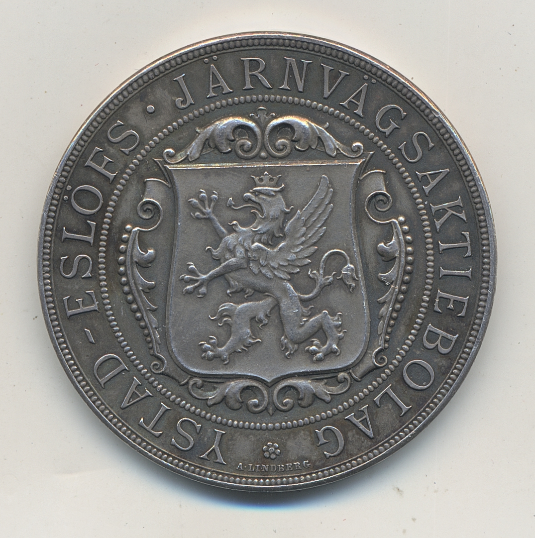 Medals, non-regal, Sweden. YSTAD-ESLÖFS JÄRNVÄGSAKTIEBOLAG 1866–1916. Silver medal by A. Lindberg, 29.59 g. 1+.