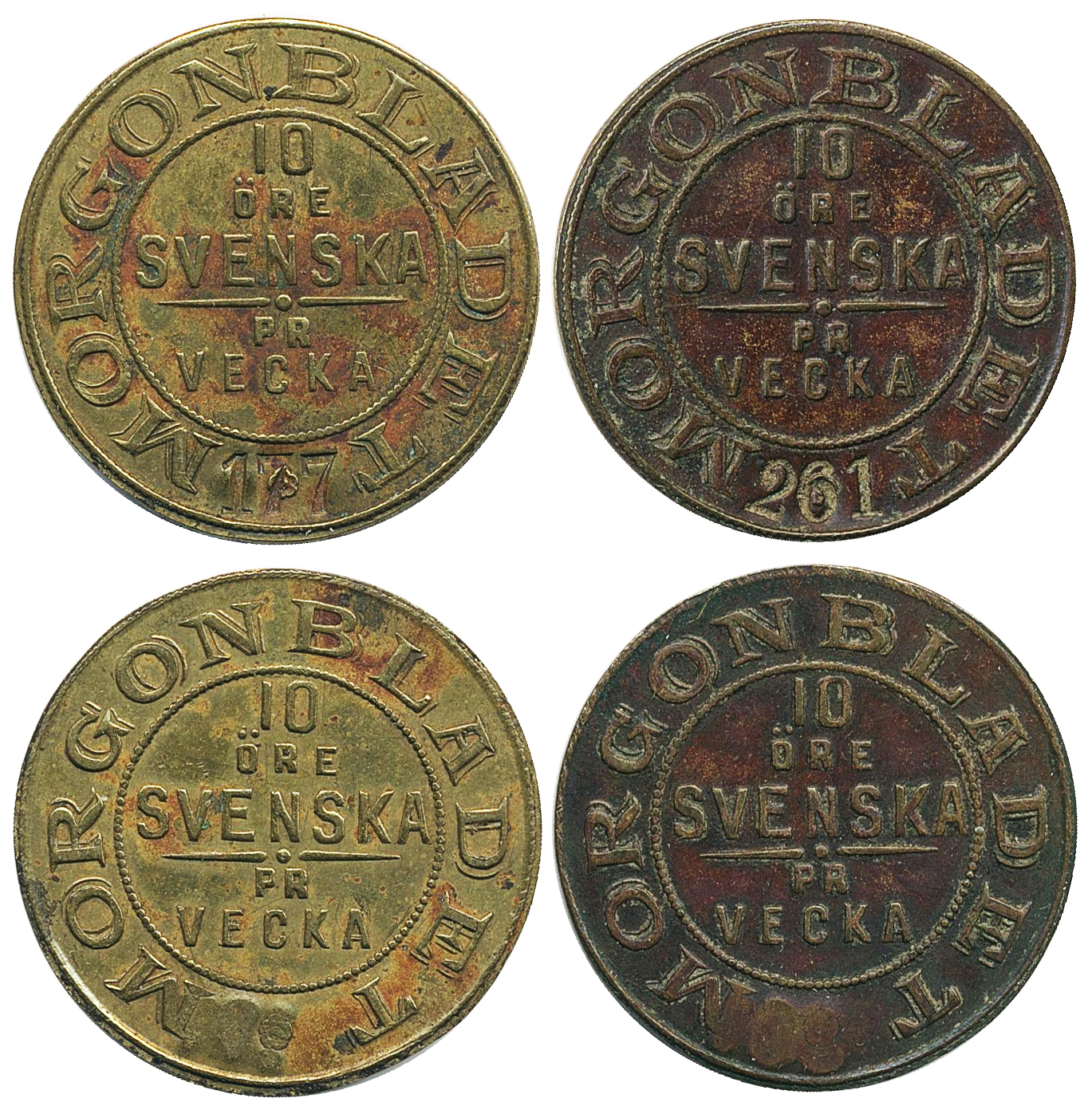 Tokens, Sweden. Two tokens, The Newspaper Morgonbladet, 10 öre Svenska PR veckan (Swedish PR week) No: 177 and 261.27 mm, mixed quality. .