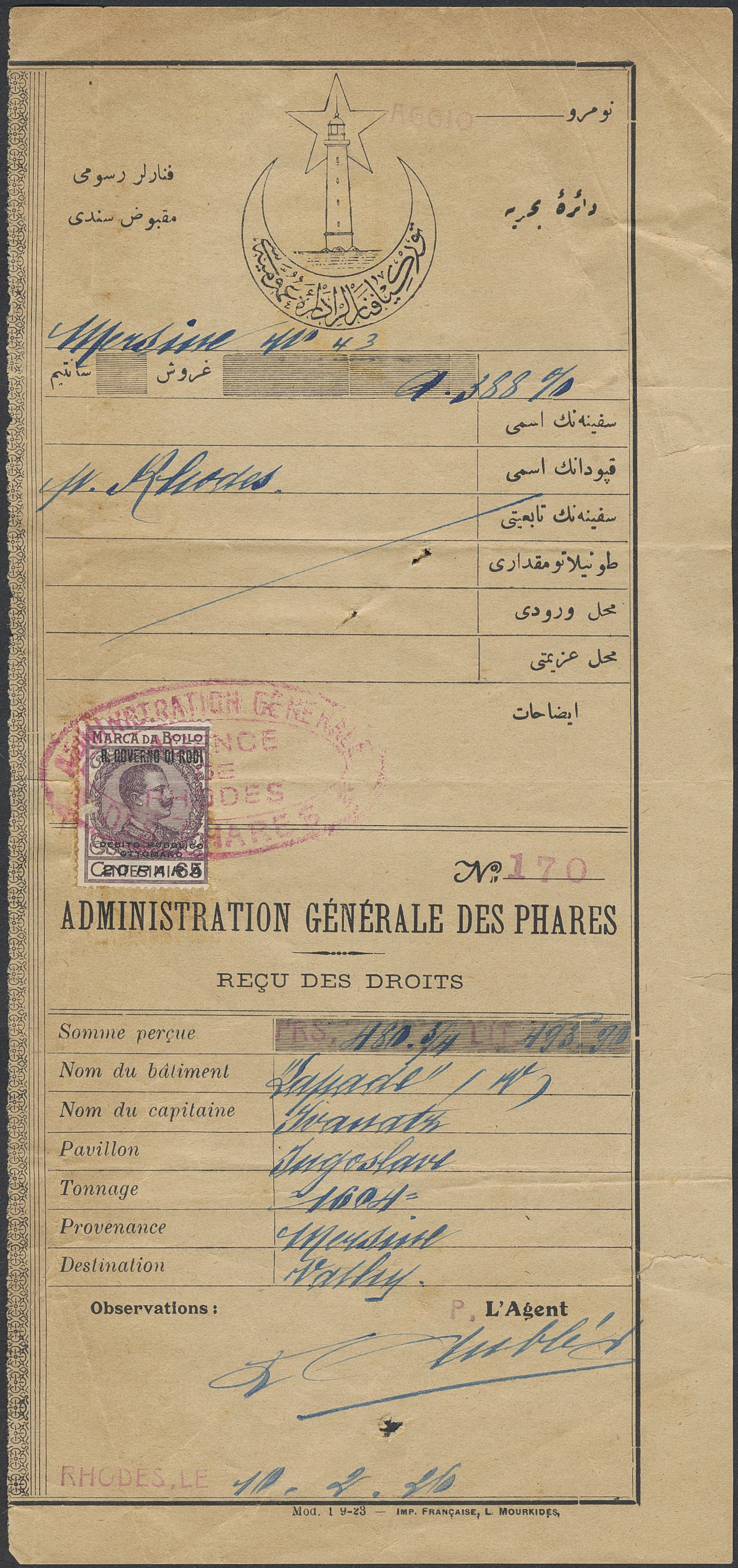 Nautica, Italy. 1926 Lighthouse, old Turkish imprint document with Italian revenue 20 para on 65 centimes ("Governo di Rodi" overprinted), tied by a red cds "General administraition of the lighthouses on Rhodos". Minor defects on the document. Extremely scarce!