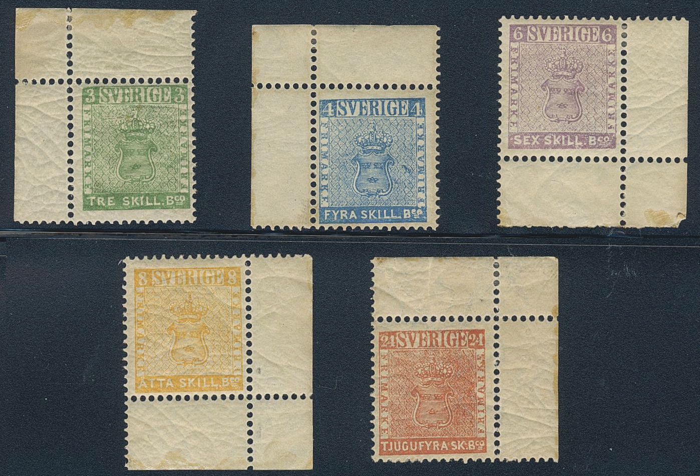 Sweden. Facit 1–5 E4 ★★/★, SET reprint perf 13 (5). 3, 4 and 24 skill bco ** and 6, 8 skill bco *. Slightly yellowed paper. SEK 25000