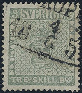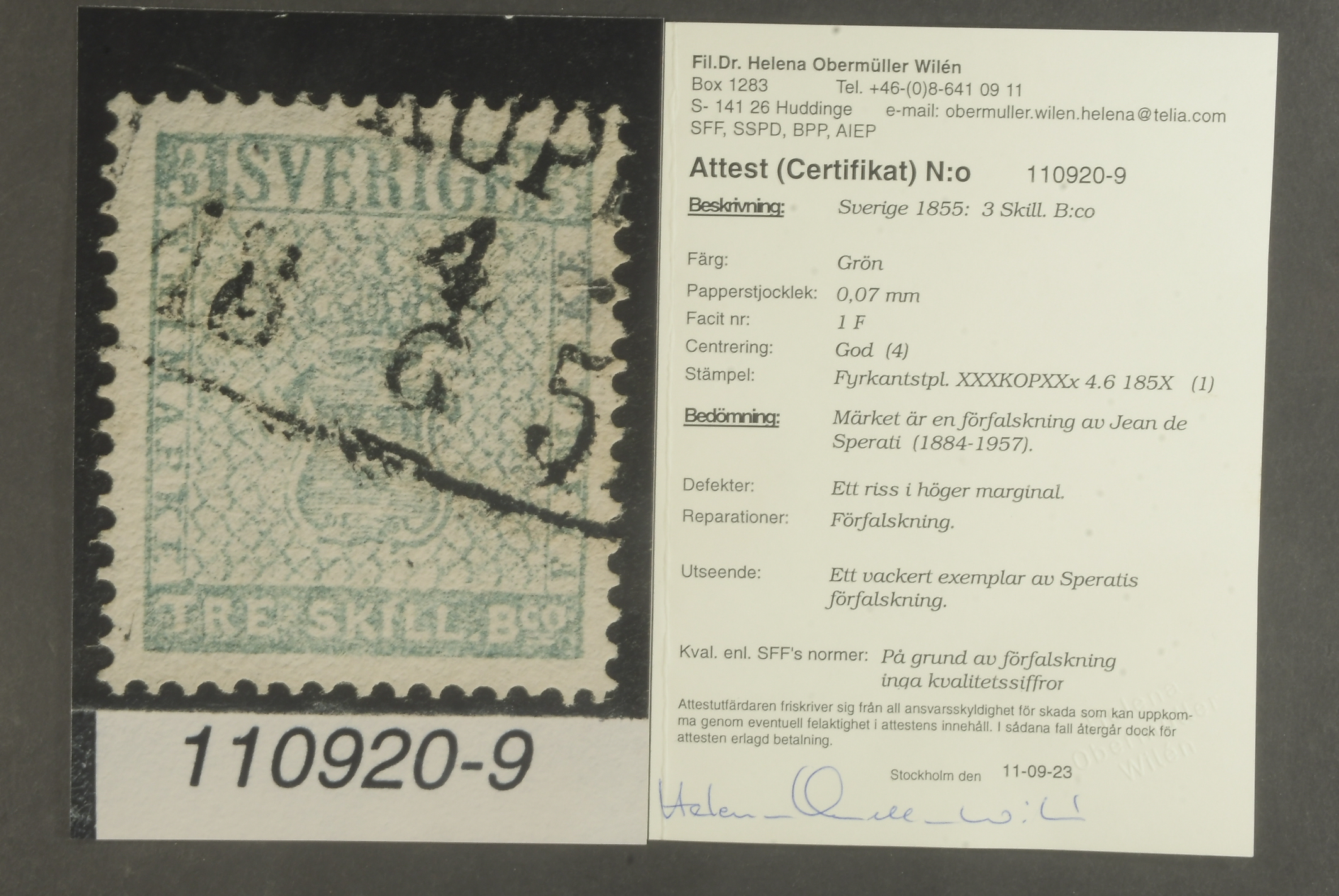 Sweden. Facit 1F used, 3 skill green. Sperati forgery, cancelled 4.6.185x. Cert. HOW tear.
