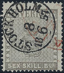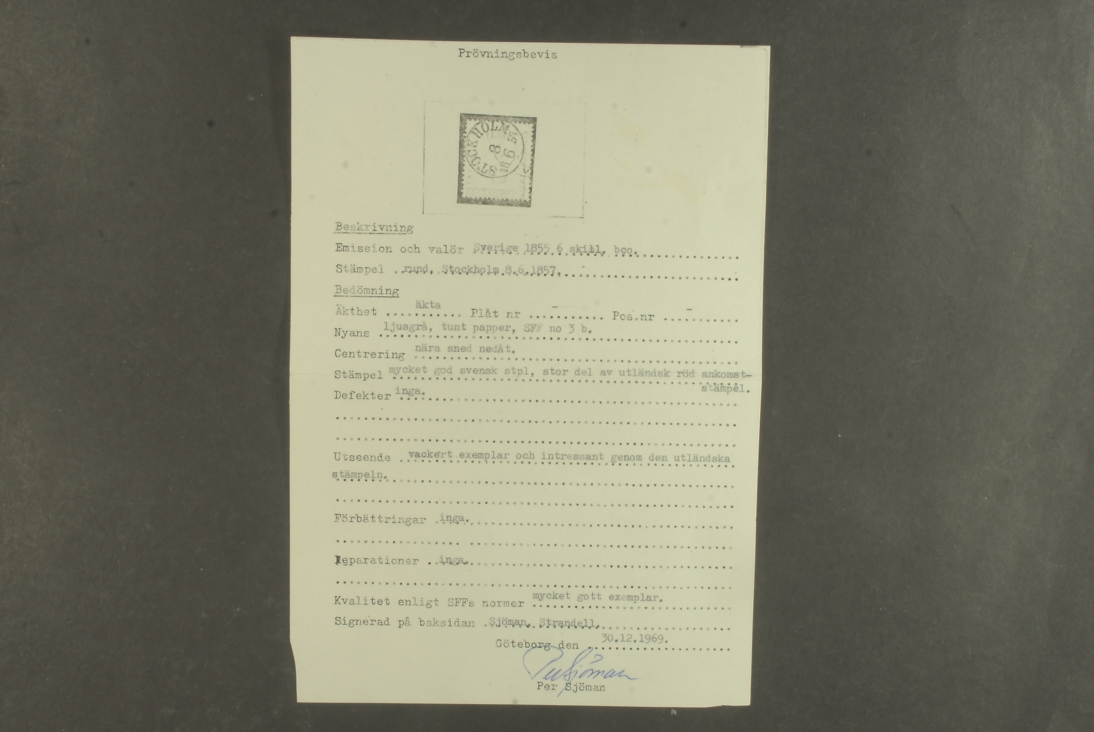Sweden. Facit 3b used, 6 skill light grey on thin paper. Nice canc. STOCKHOLM 8.6.1857 and a red arrival canc. Cert. Per Sjöman and sign. Strandell.