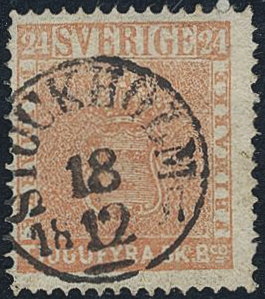 Sweden. Facit 5 used, 24 skill red. Very nice ex canc. STOCKHOLM 18.12.1857.