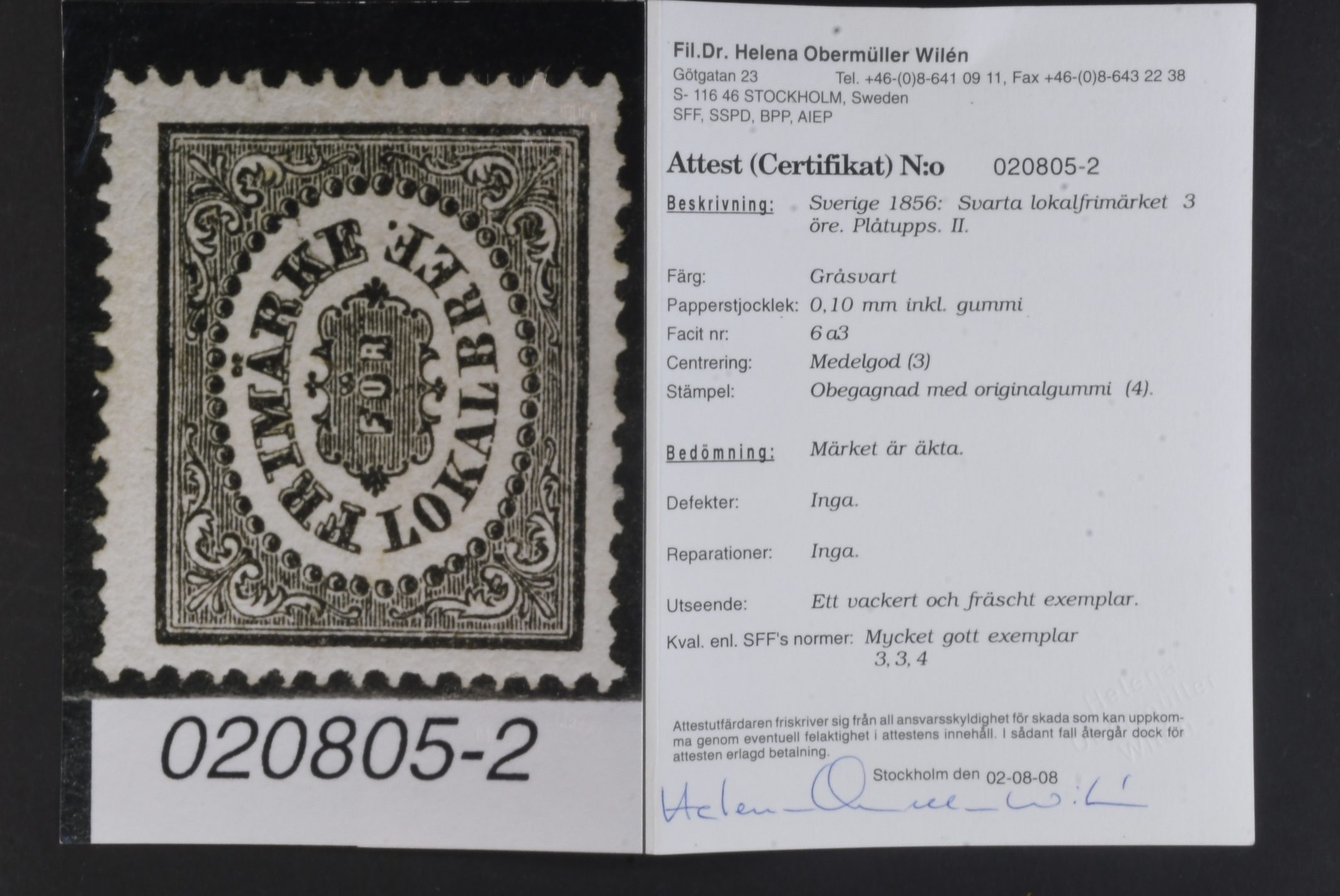 Sweden. Facit 6Ba ★, (3 öre) grey-black – black. With cert. HOW 3,3,4. 'Ett vackert och fräscht exemplar. Mycket gott exemplar'. SEK 7000