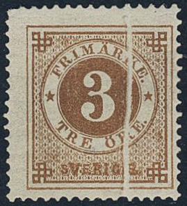 Sweden. Facit 17v6 ★, 3 öre brown, paper folded before printing. Small imperfectins of less importancance. Very rare variety in mint condition, unknown according to Facit.
