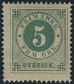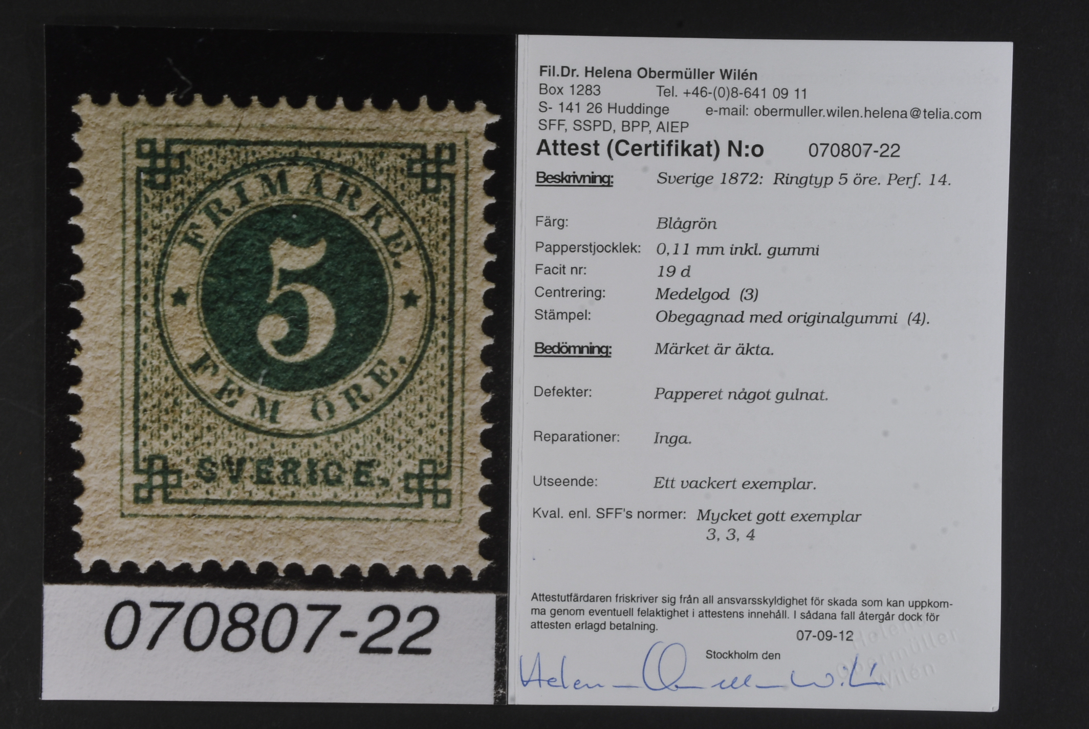 Sweden. Facit 19d ★, 5 öre blue-green. Certificate HOW 3, 3, 4 (2007). SEK 3500
