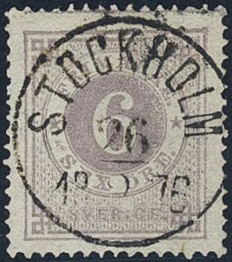 Sweden. Facit 20j v8 used, 6 öre lilac, coloured line in margin variety. EXCELLENT cancellation STOCKHOLM 26.2.1876. SEK 700