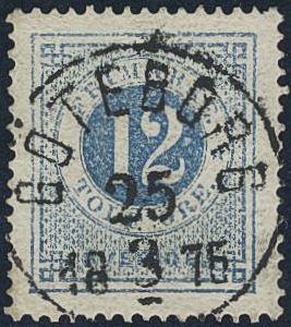 Sweden. Facit 21m used, 12 öre blue. EXCELLENT cancellation GÖTEBORG 25.3.1875. Signed by O.P.
