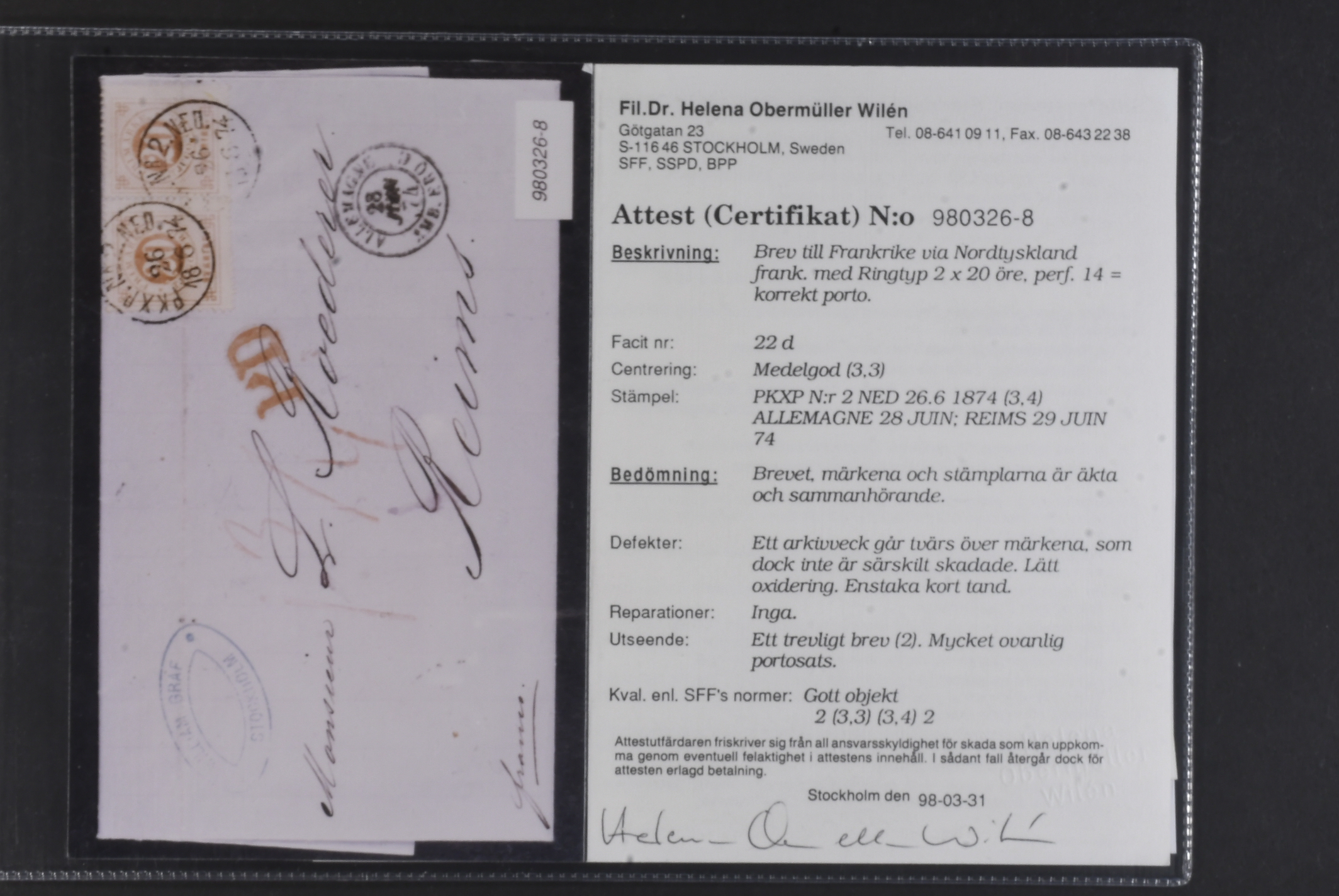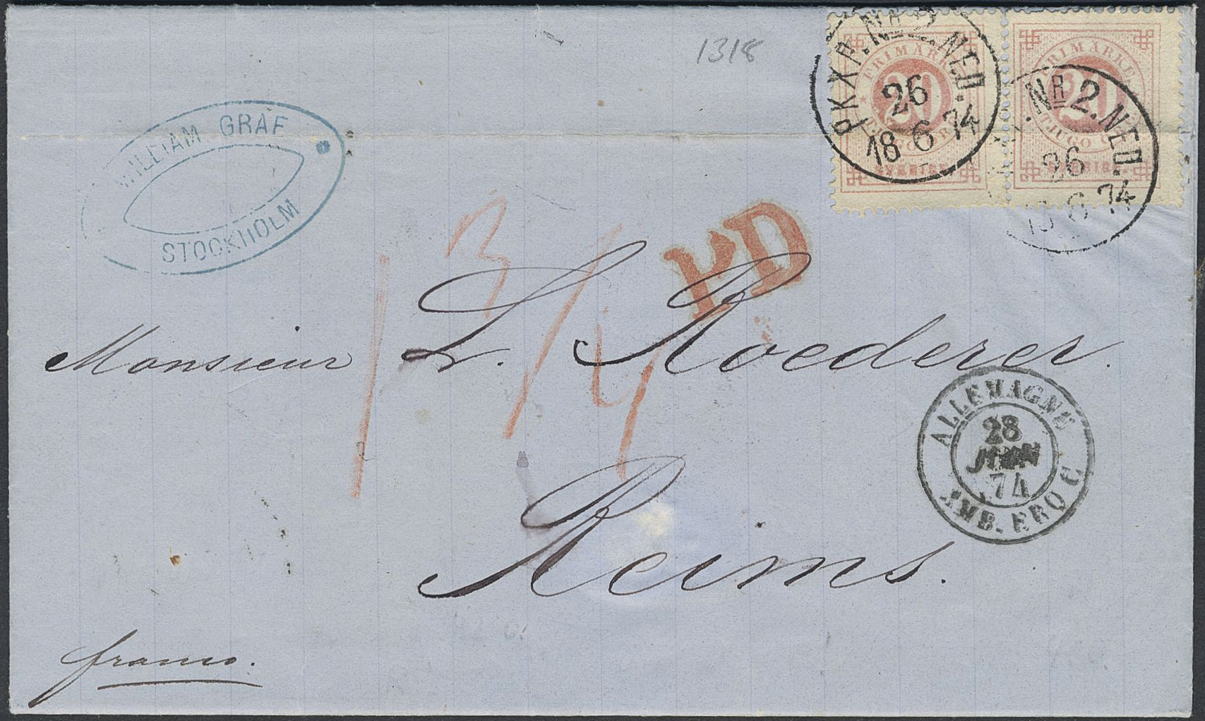 Sweden. Facit 22d on cover, 2×20 öre pale red on beautiful cover sent pre-GPU from PKXP No 2 NED 26.6.18. 74 via Germany to France, with arrival pmk REIMS 29.JUIN.74. Light archive fold through the stamps. Nice cover with a very scarce rate. Certificate HOW 2 (3,3), (3,4) 2 (1998). Ex. Gunnar Nilsson. SEK 16000