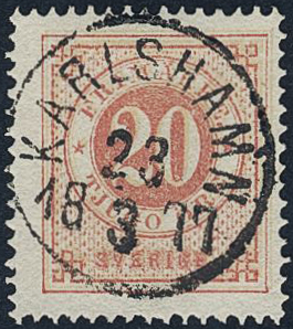 Sweden. Facit 23c used, 20/20 öre dull red on pale orange. EXCELLENT cancellation KARLSHAMN 23.3.1877.