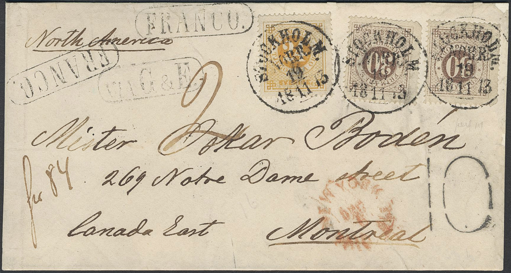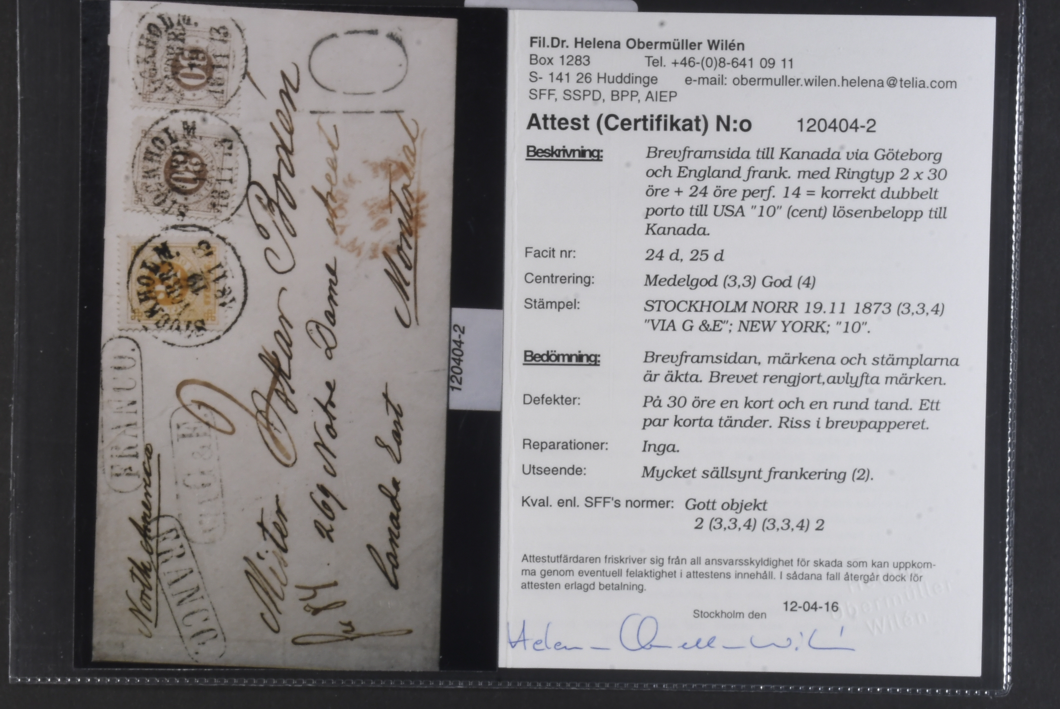 Sweden. Facit 24d, 25d on cover, 24+2×30 öre on nice double rate cover front sent from STOCKHOLM 19.11.1873 to Canada, with the scarce routing mark VIA G&E (P: 10000). Only recorded mail with this rate. Certificate HOW 2 (3,3,4) (3,3,4) 2 (2012). EXHIBITION item. Ex. Feldman 1992 (CHF 3450).