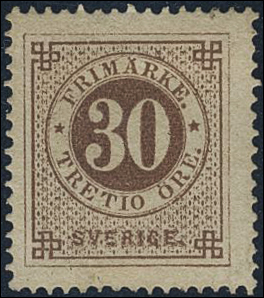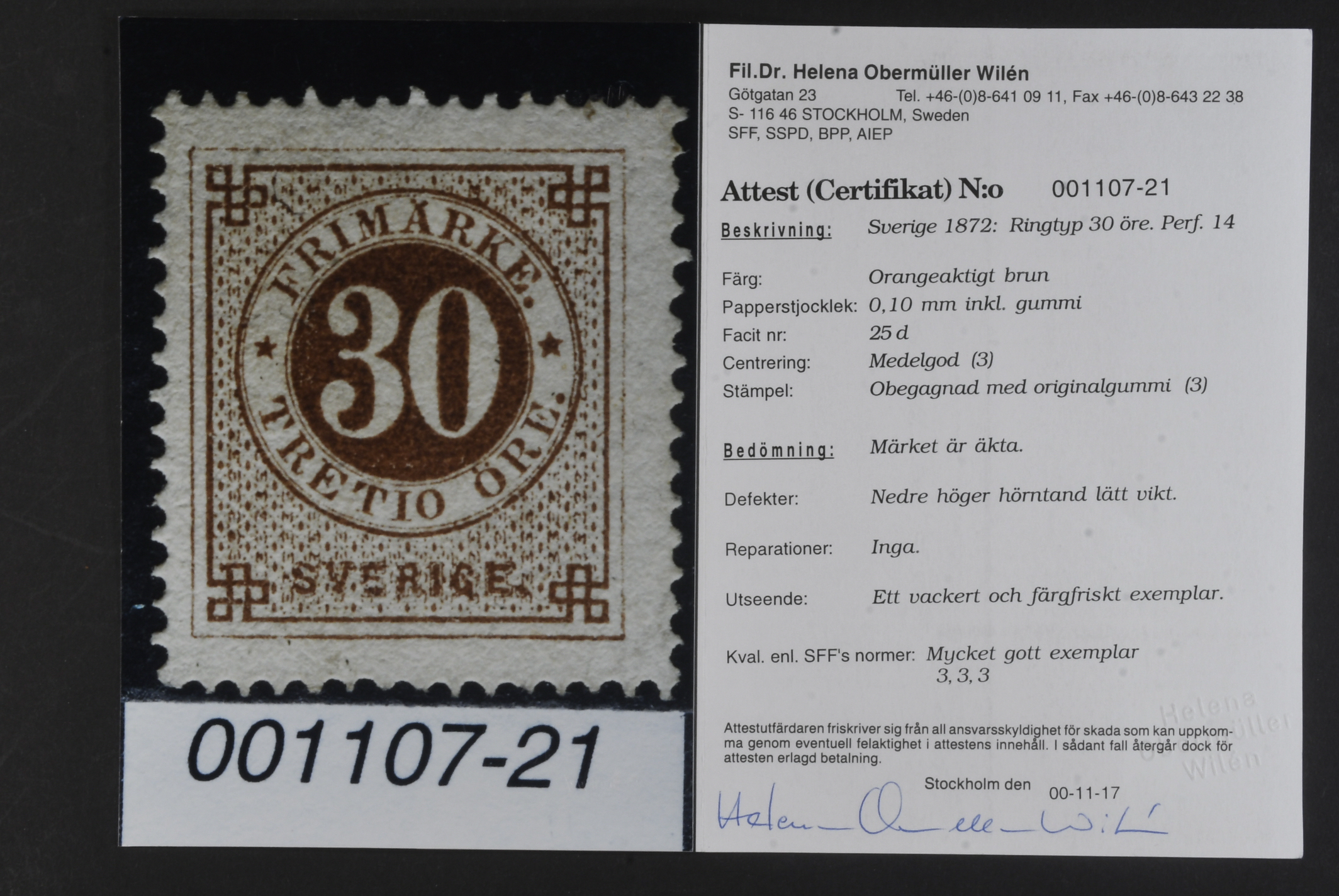 Sweden. Facit 25d1 ★, 30 öre orange-brown on yellowish paper. Very scarce shade, without price in Facit. Certificate HOW 3,3,3 (2000).