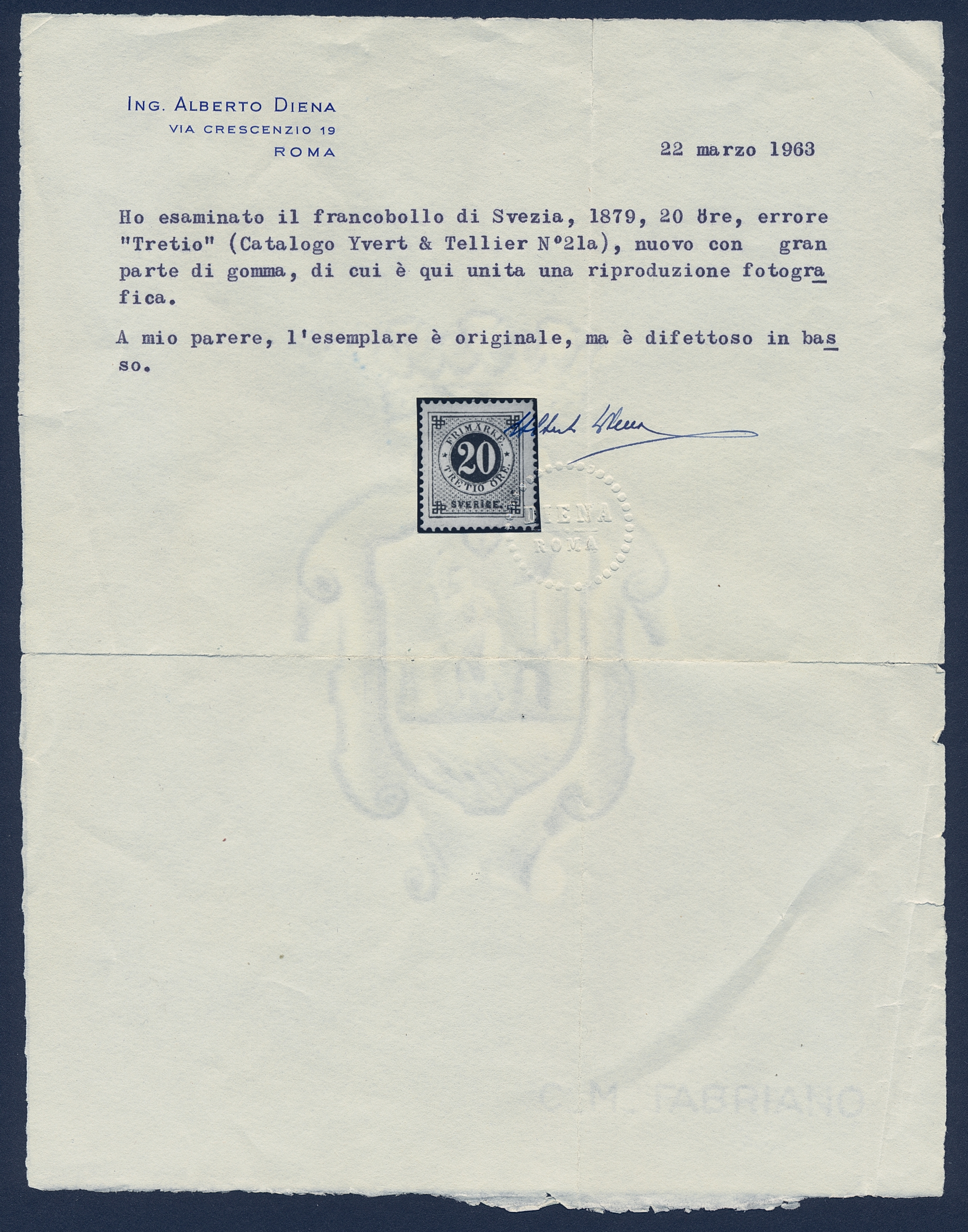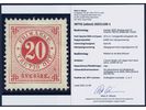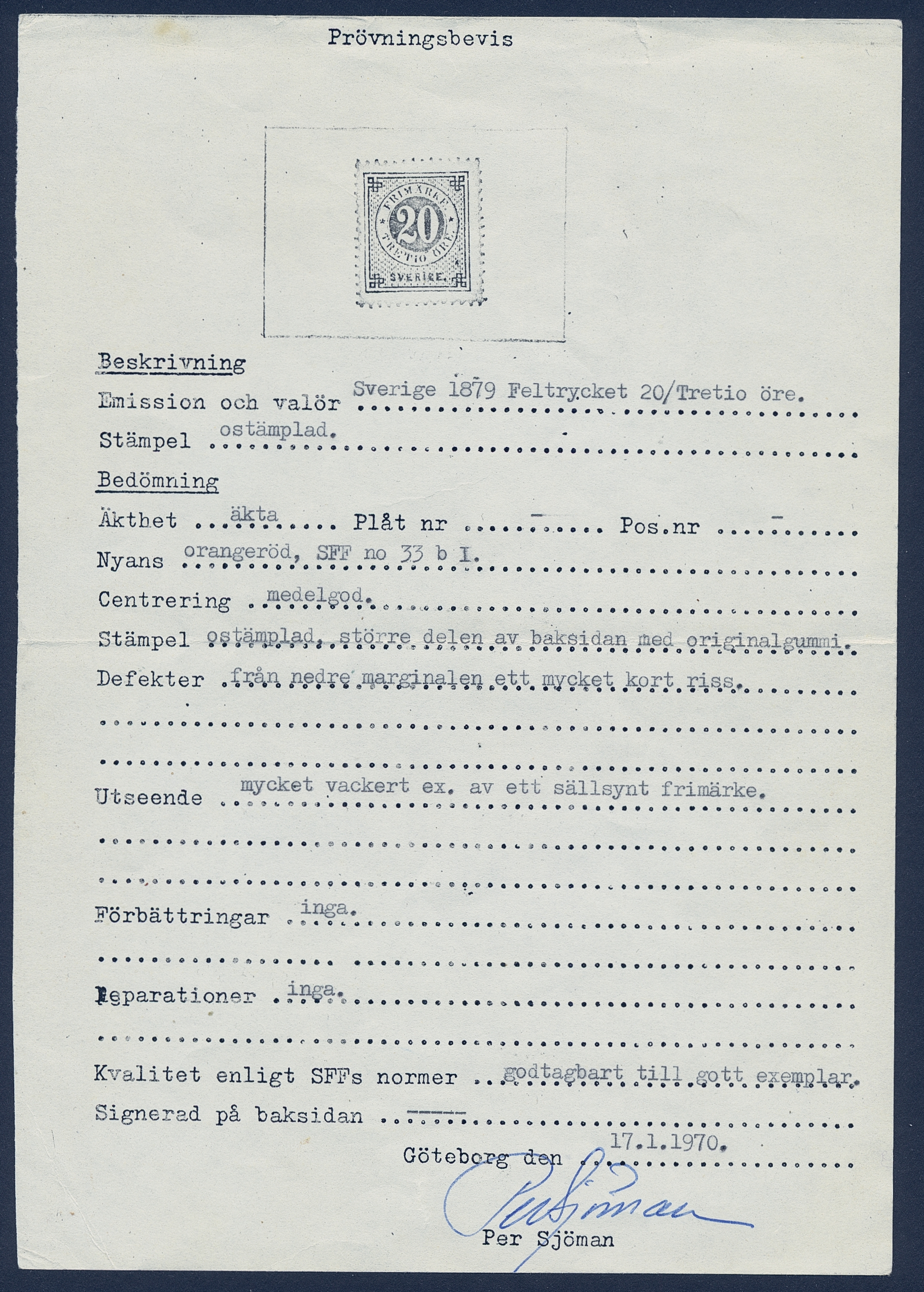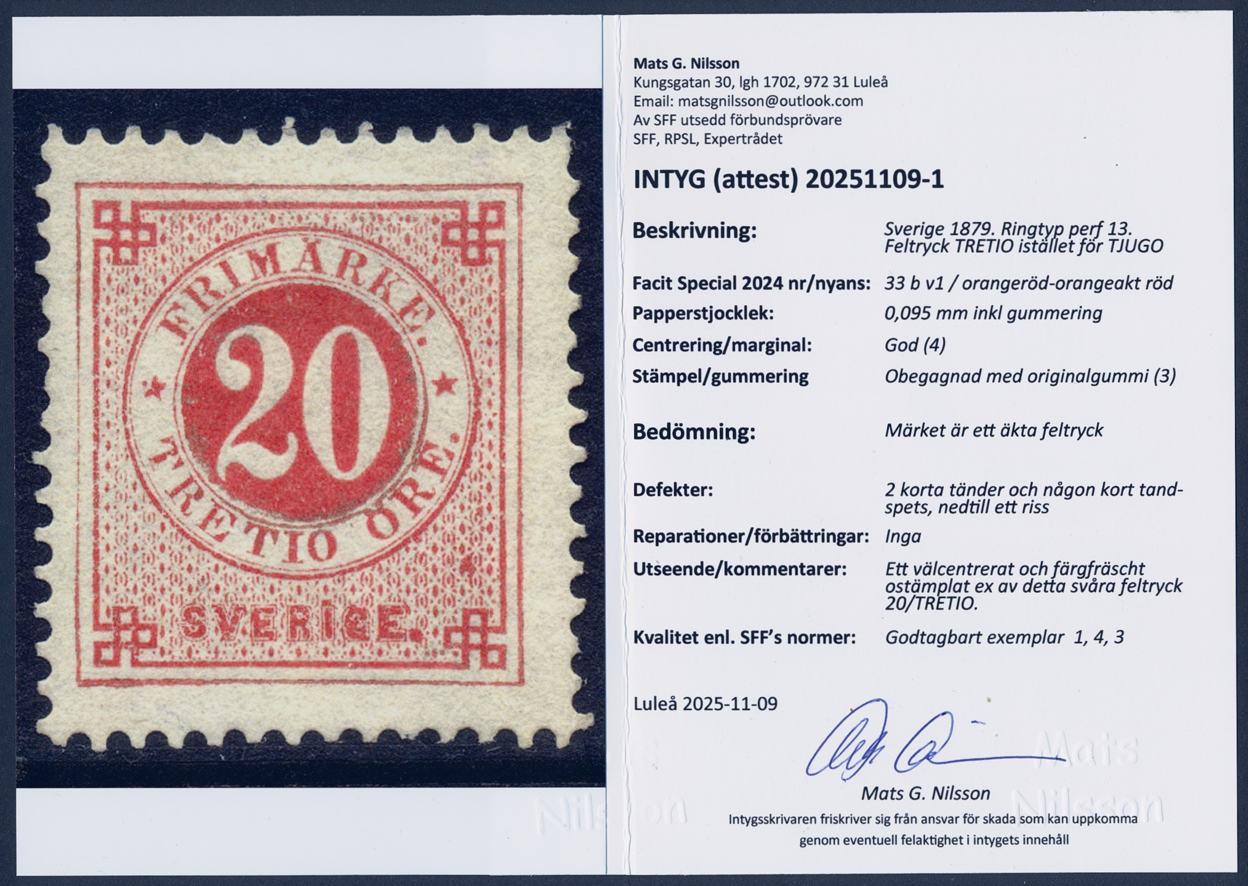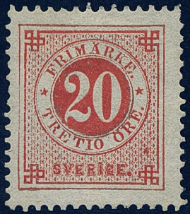 Sweden. Facit 33v1 ★, 20 öre red with “TRETIO” instead of “TJUGO” variety. Two short perfs and a small tear at bottom. Certificate Mats Nilsson (2025). SEK 100000