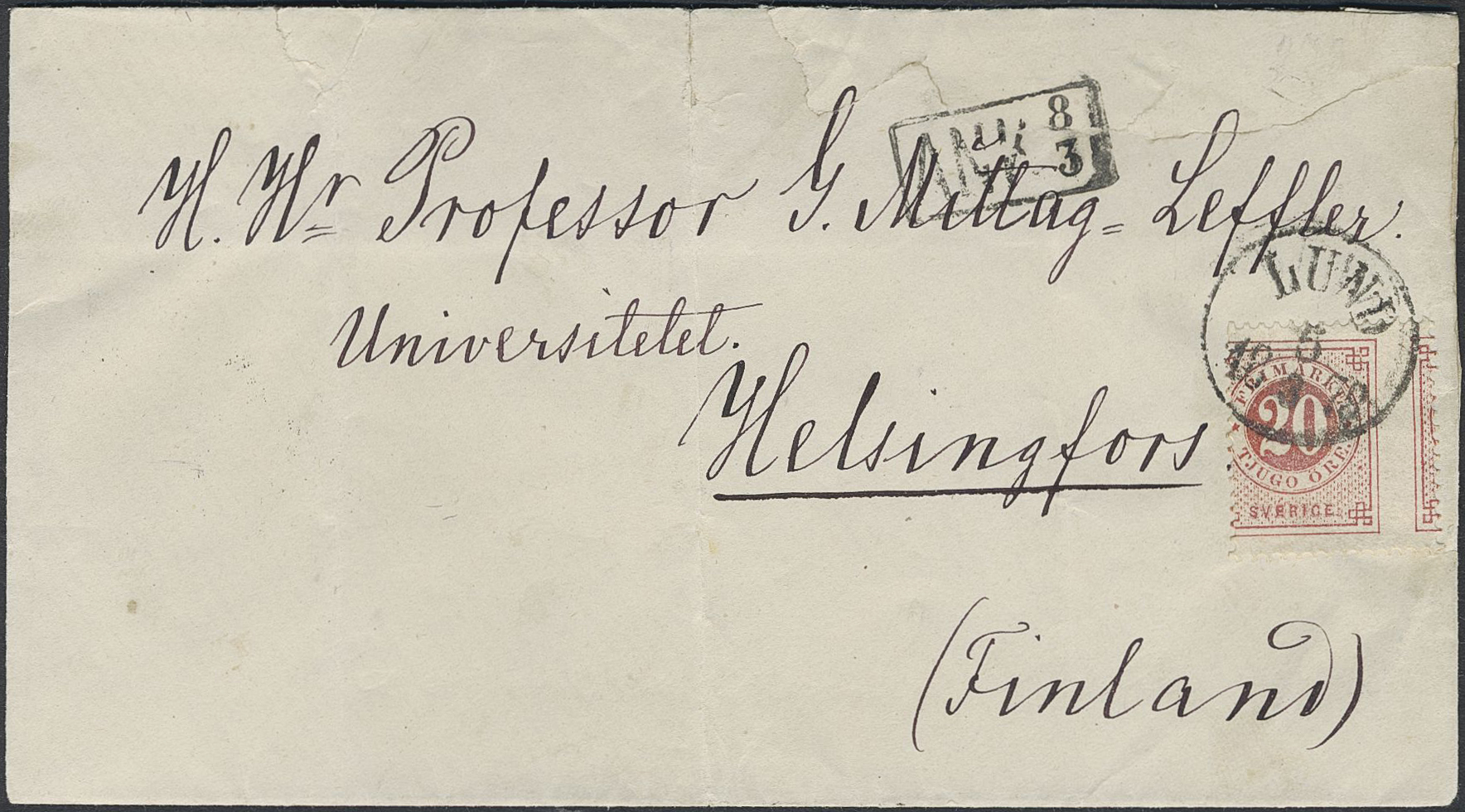 Sweden. Facit 33v8 on cover, 20 öre red, extremely displaced perf. Exceptional variety on cover (somewhat carelessly opened) sent from LUND 5.31878 via STOCKHOLM K.E. 6.3.1878 to Finland, with arrival pmk ANK 8.3.