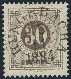 Sweden. Facit 35h used, 30 öre black-brown on soft paper. EXCELLENT cancellation KUNGSBACKA 15.11.1884.