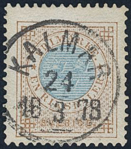 Sweden. Facit 37 used, 1 Riksdaler brown/blue. EXCELLENT cancellation KALMAR 24.3.1878.