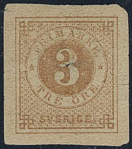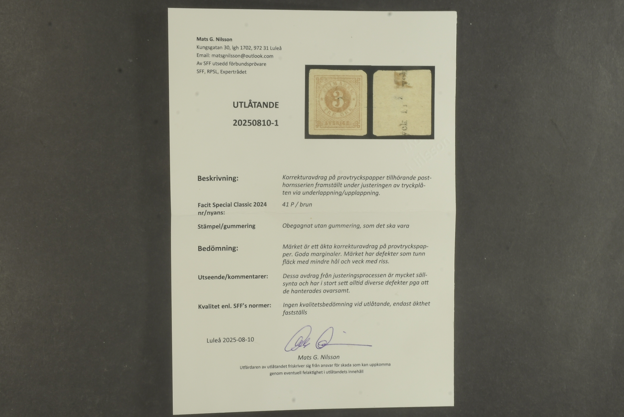 Sweden. Facit 41P used, 3 öre brown. Proof, imperforate. Cert. Mats G. Nilsson 'Korrekturavdrag på provtryckspapper tillhörande posthornsserien framställt under justeringen av tryckplåten via underlappning/upplappning'. Defective.