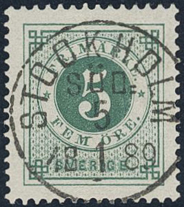 Sweden. Facit 43a used, 5 öre dull blue-green. EXCELLENT cancellation STOCKHOLM SÖD 5.1.1889.