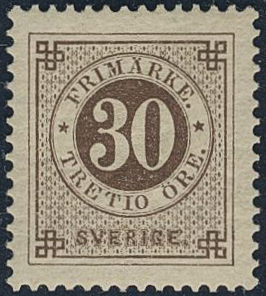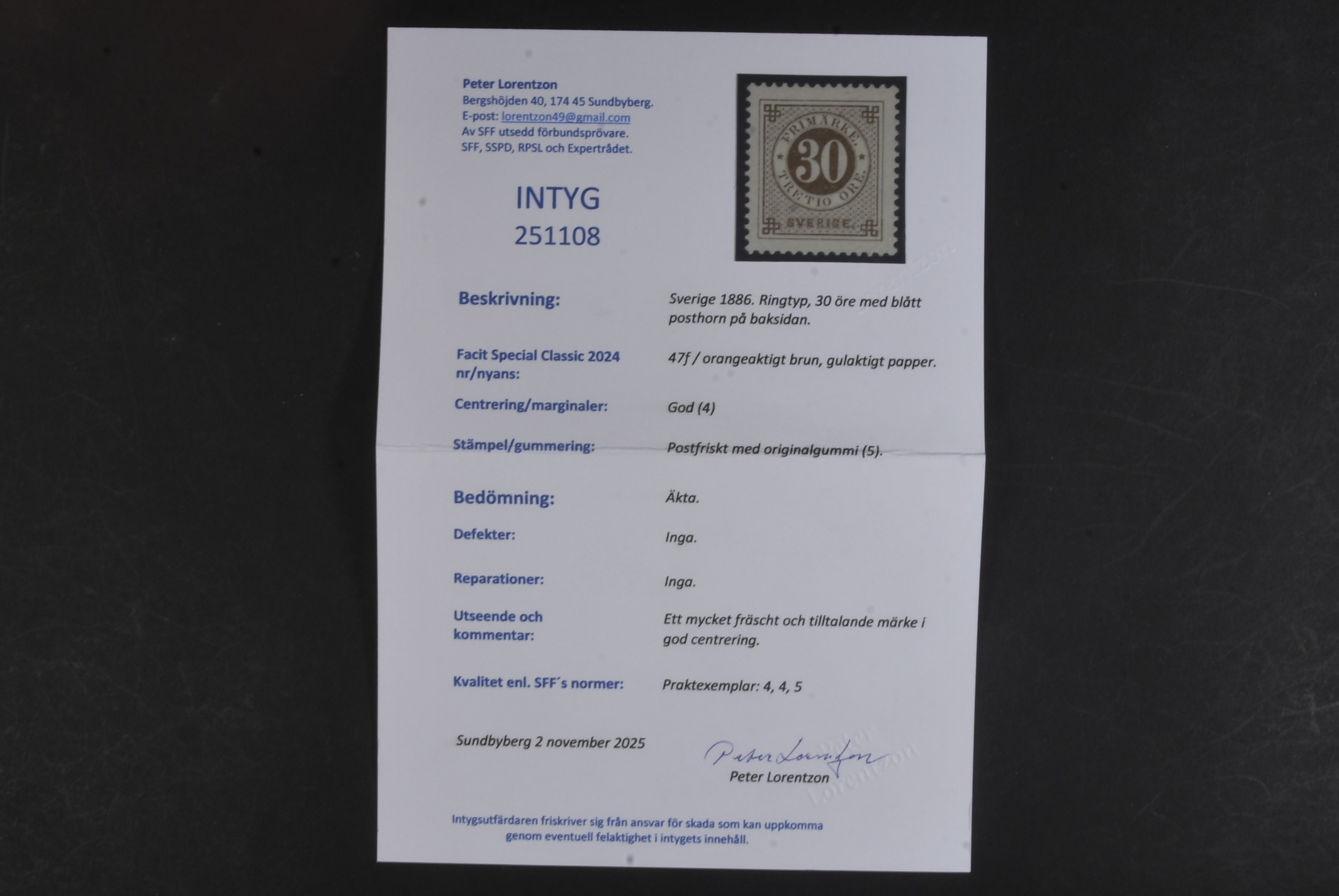 Sweden. Facit 47f ★★, 30 öre orange-brown. Superb and very fresh example. Certificate Lorentzon 4, 4, 5 (2025). SEK 8000