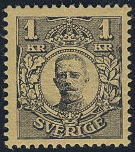 Sweden. Facit 77vm9 ★, 1 Krona black with parts of two inverted crowns horizontally. Extremely rare – according to Facit only one known.