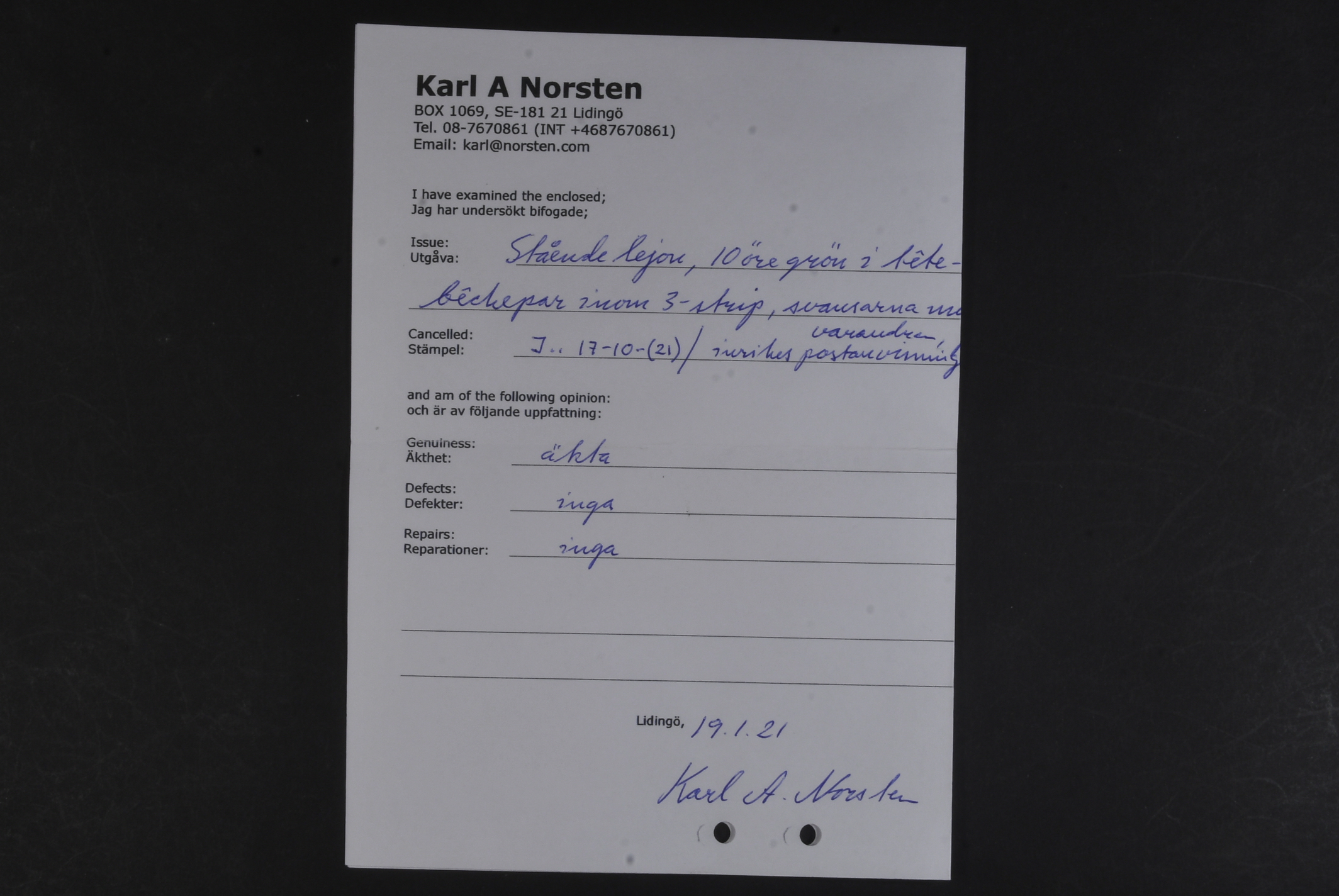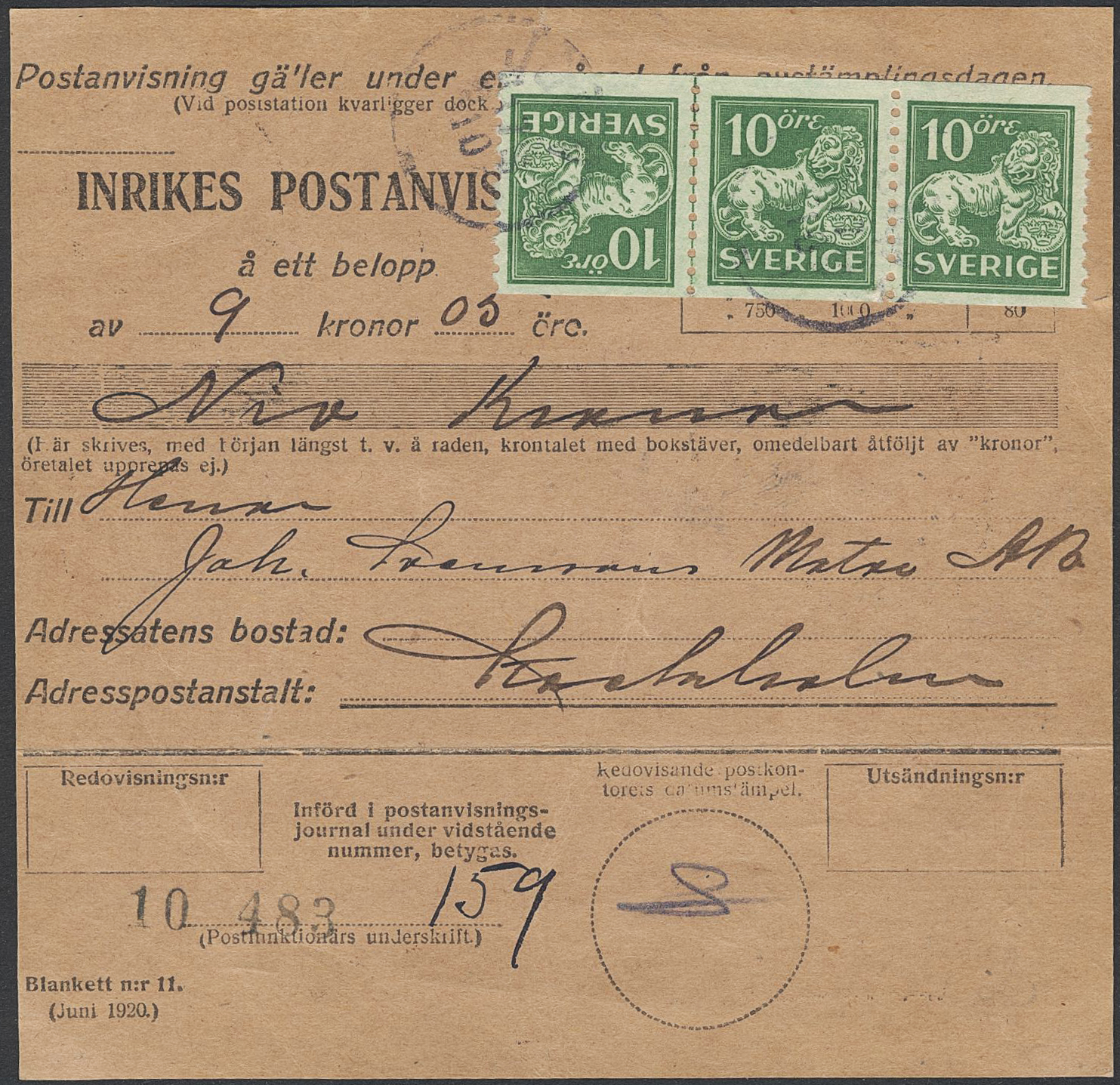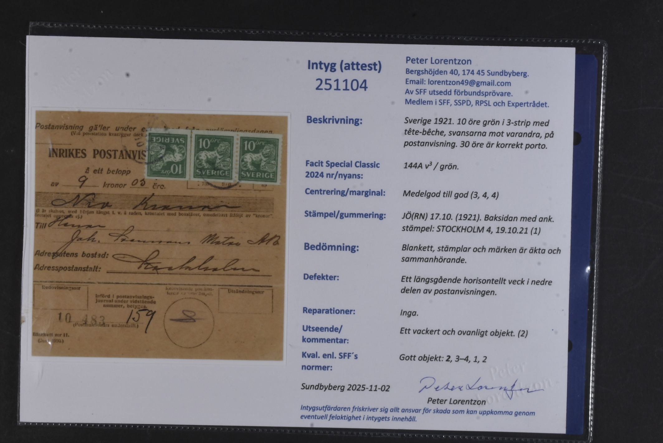 Sweden. Facit 144Av3 on cover, 10 öre green, tête-bêche tails against each other. Money order sent from JÖRN 17.10.1921 to STOCKHOLM 19.10.21. Certificate KAN (2019) and Lorentzon 2, 3–4, 1, 2 (2025). SEK 32000