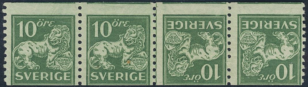 Sweden. Facit 144Av4 ★★/★, 10 öre green, tête-bêche heads against each other with vm KPV in strip of four.Sign. BG. SEK 18000