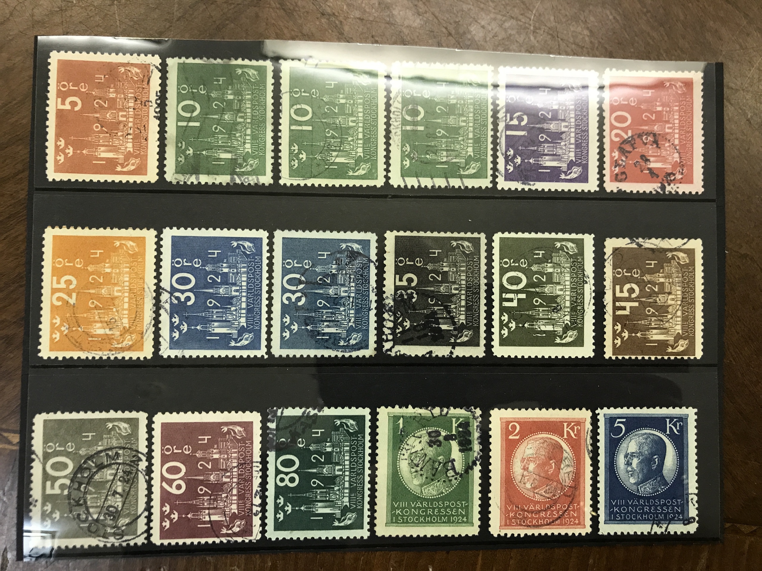 Sweden. Facit 196–210 used, Cpl. set (18) with good perforation incl. cx, cxz and 30 öre dull greenish blue. SEK 13100