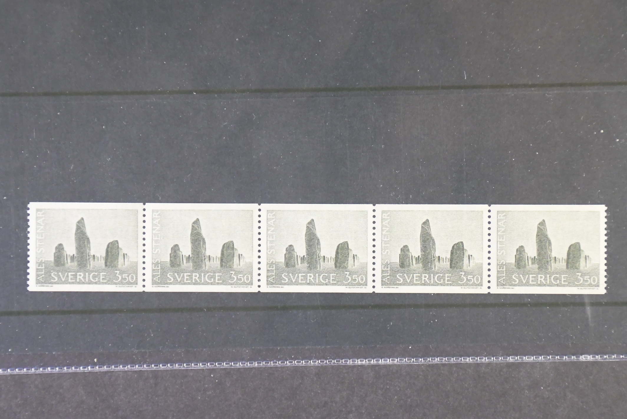 Sweden. Facit 579 VI ★★, 1966 Ale´s Stones 3.50 kr olive-green with yellow flour in strip-of five. Superb.