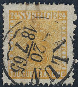 Sweden. Facit 10, W county. FALUN 20.7.1865, circle cancellation. Type 4 with 'arabesk'. Ink from envelope on the reverse of the stamp. Few known.