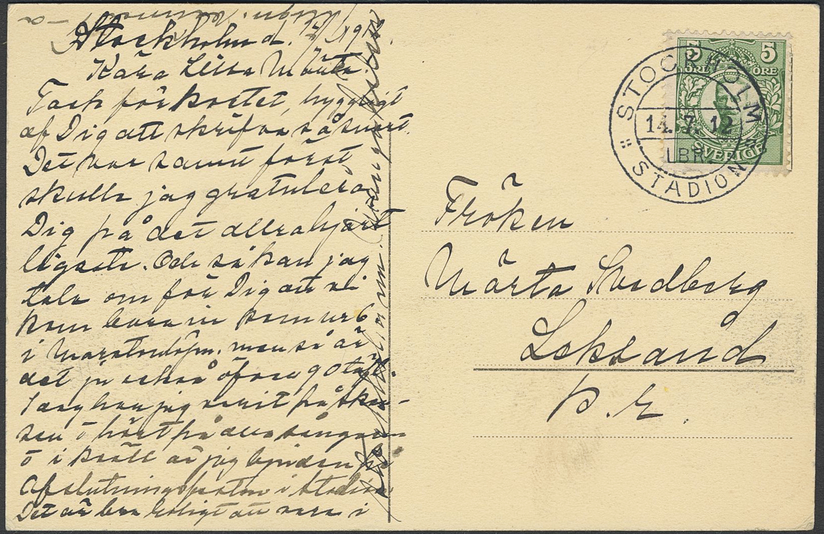 Sweden. A county. STOCKHOLM STADION LBR 14.7.12. Temporary post office 28.6–27.7.1912. Postcard ('Gymnastikuppvisning i Stadion') sent to Leksand. Sacrce and sought-after. Postal: 3500:-
