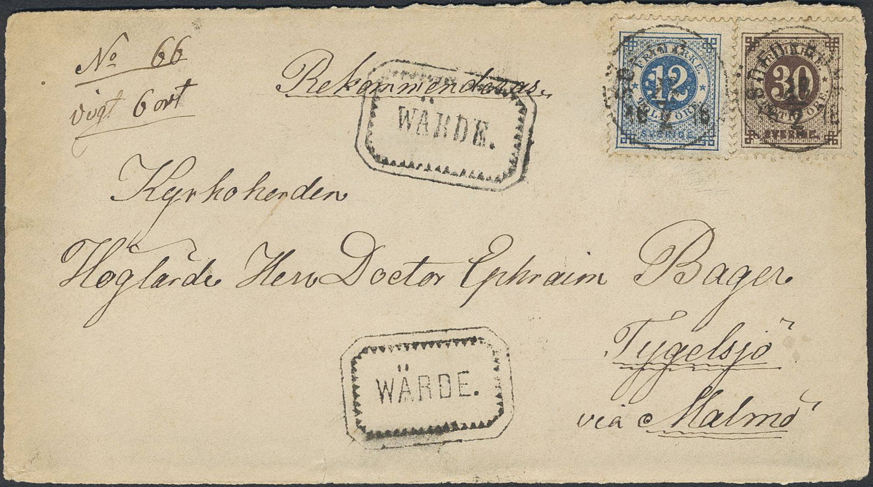 Sweden. Facit 32, 35, M county. SÖFDEBORG 28.2.1878. Superb registered cover front sent to Tygelsjö. Postal: 1500+:-