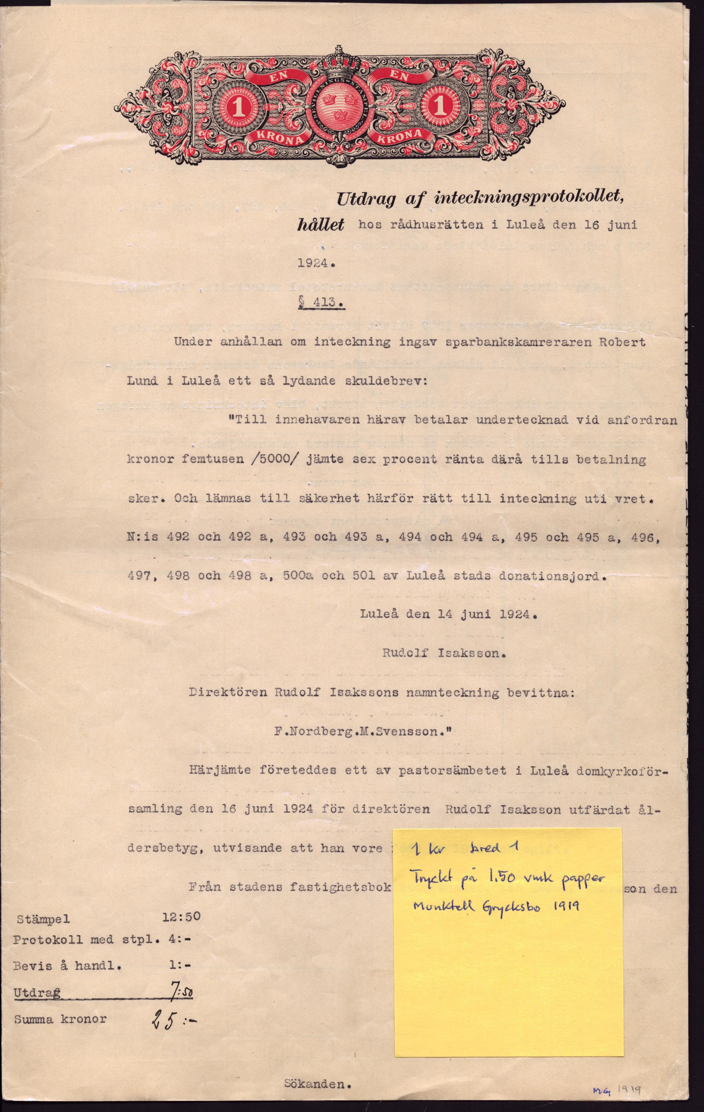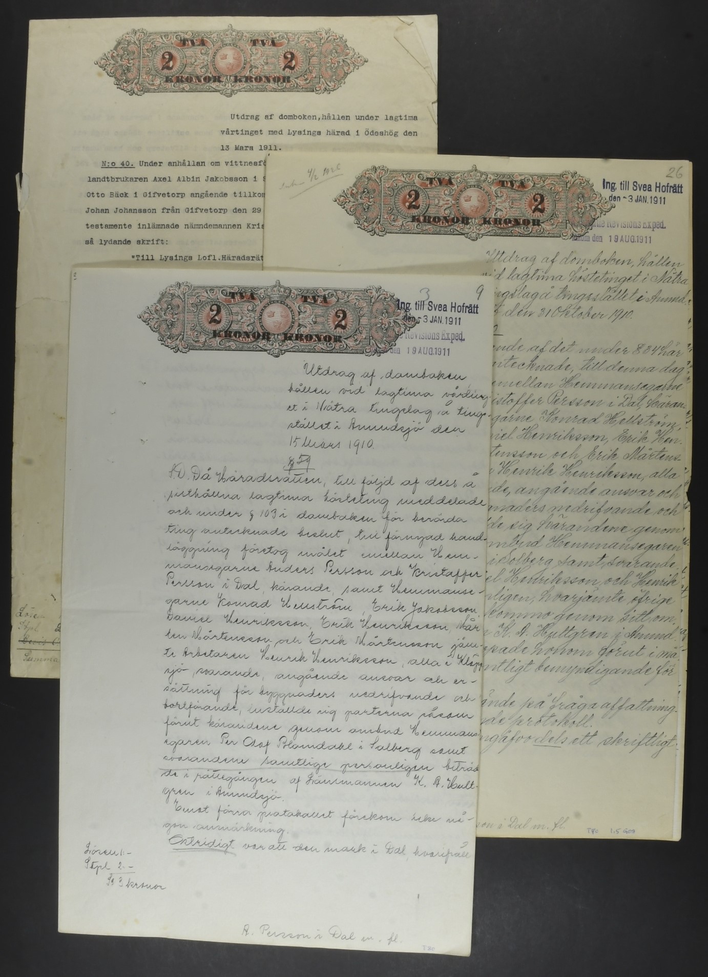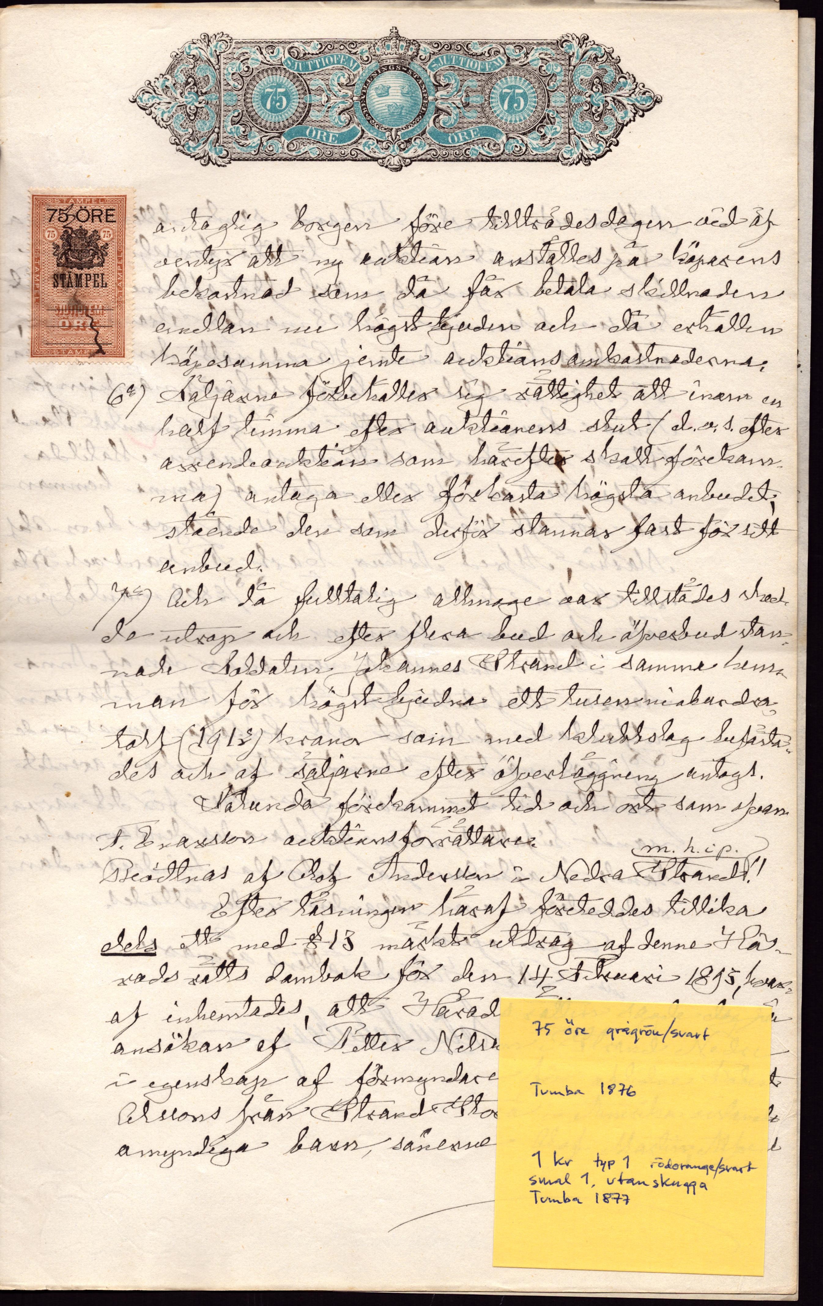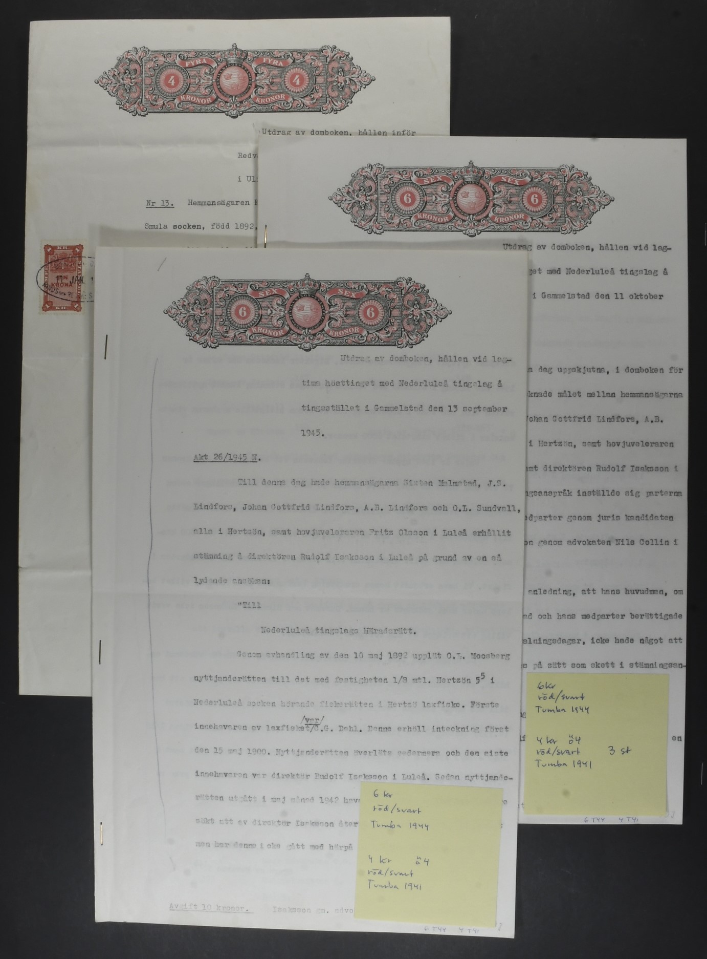 Sweden. Revenue stamped papers, collection/accumulation in box. An extensive and highly specialized compilation of revenue stamped papers from the seventh period (1858–1946). In total 495 documents (a bundle of 19 cm height!) with all denominations from the period, including the rare 75 öre and three 2 kr overprinted on 3 kr. Incl. different paper mills, a great number of different years in watermark, color shades, misprints, various printings, etc. A comprehensive and specialized collection almost impossible to obtain. Condition good to very fine. Some scans are presented at www.philea.se. Approx. 10 kg.