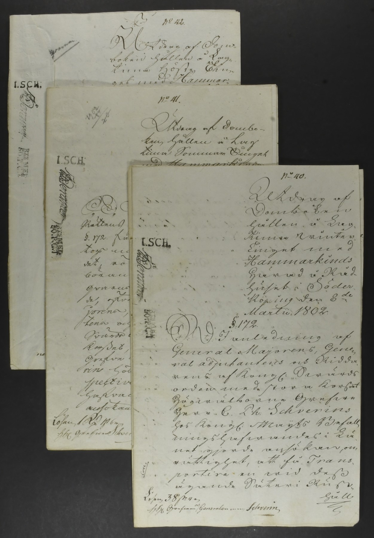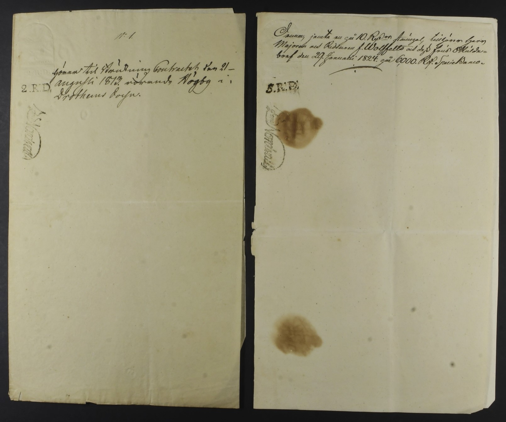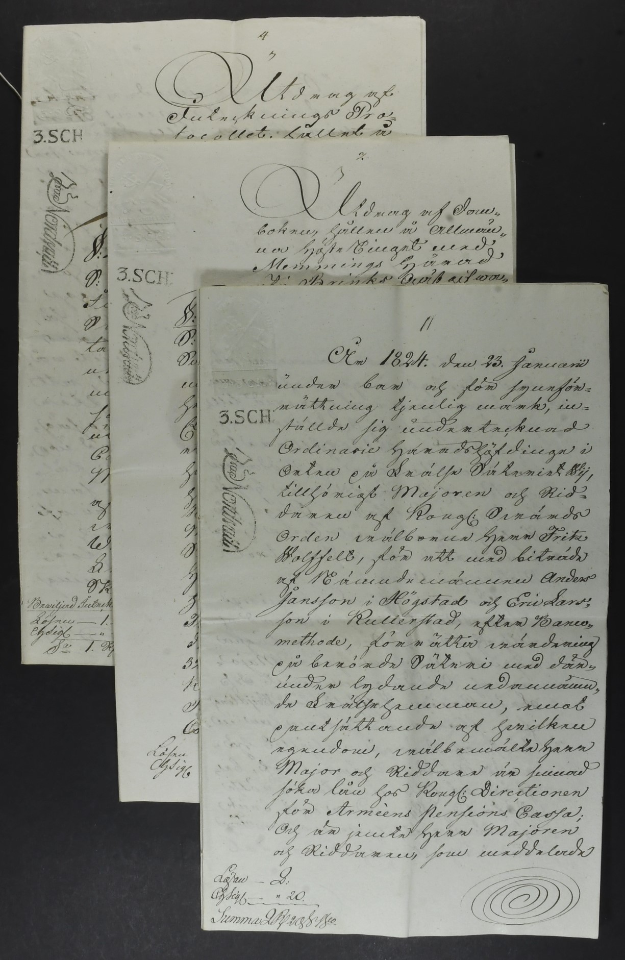 Sweden. Revenue stamped papers, lot 1811–1825. CHARTA SIGILLATA. 1 sk revalued +50% (12), 3 sk restamped on 3 sk (4th issue), 3 sk 1816 (18) Borgstedt, Some different Dutch paper makers watermarks, e.g. I.L.B., G.Brouwer, "Maid of Dort". 2 sk + 2 sk 1825 (wm S&A), 3 sk 1821 (9), 1822 (2), 2 Rd and 5 Rd 1818 (wm "GB" in cartoush) Nordvall. Forty-four cpl two-pages in total, mostly affixed together in fiscal matters. Fine to Very Fine condition. Scans are presented at www.philea.se. (44)