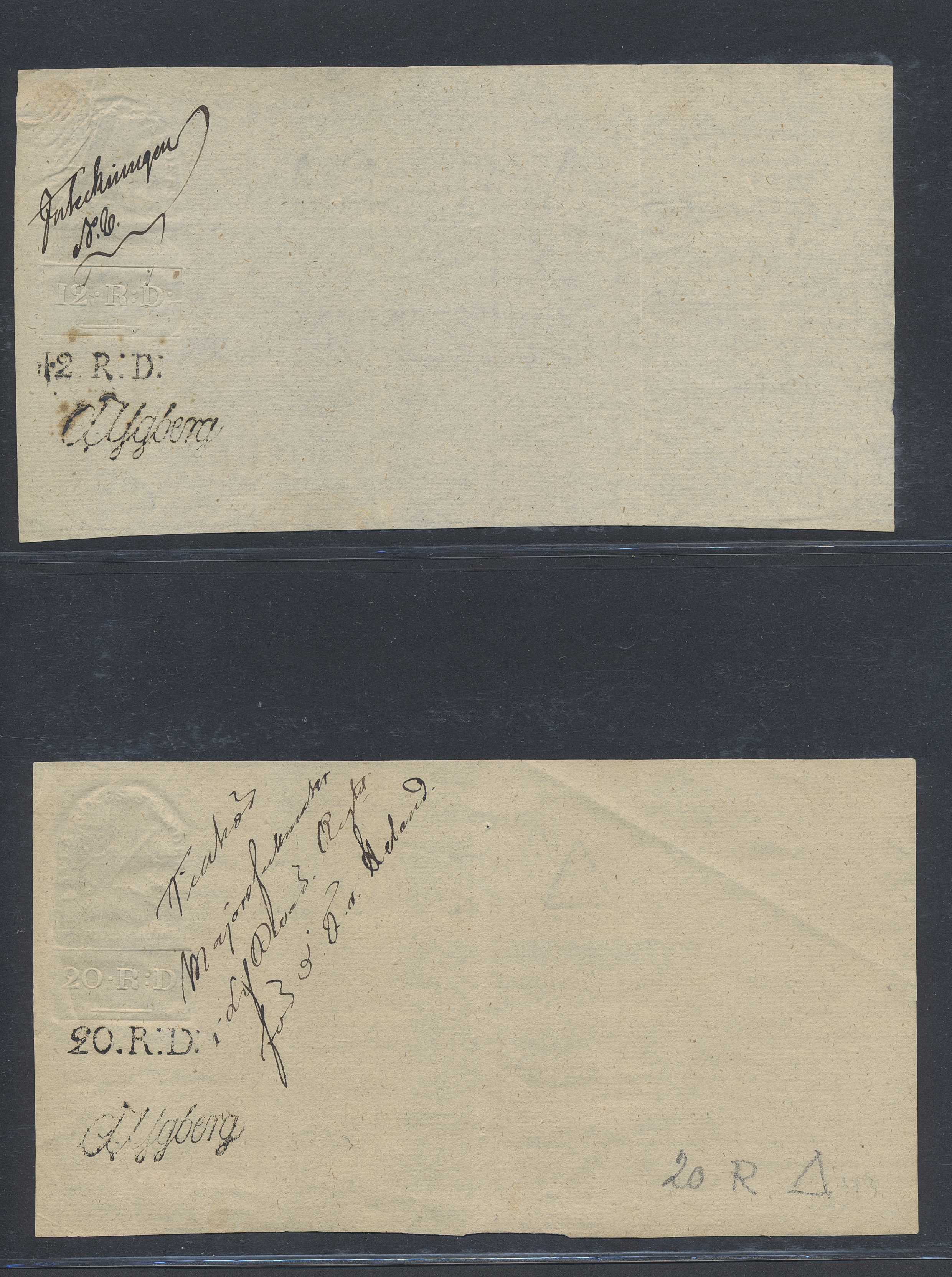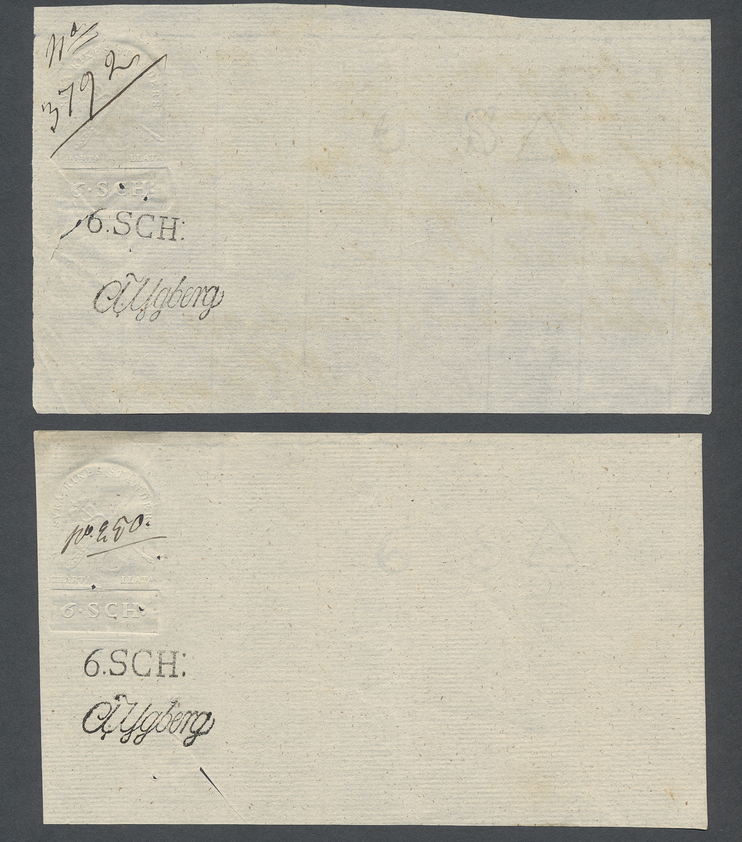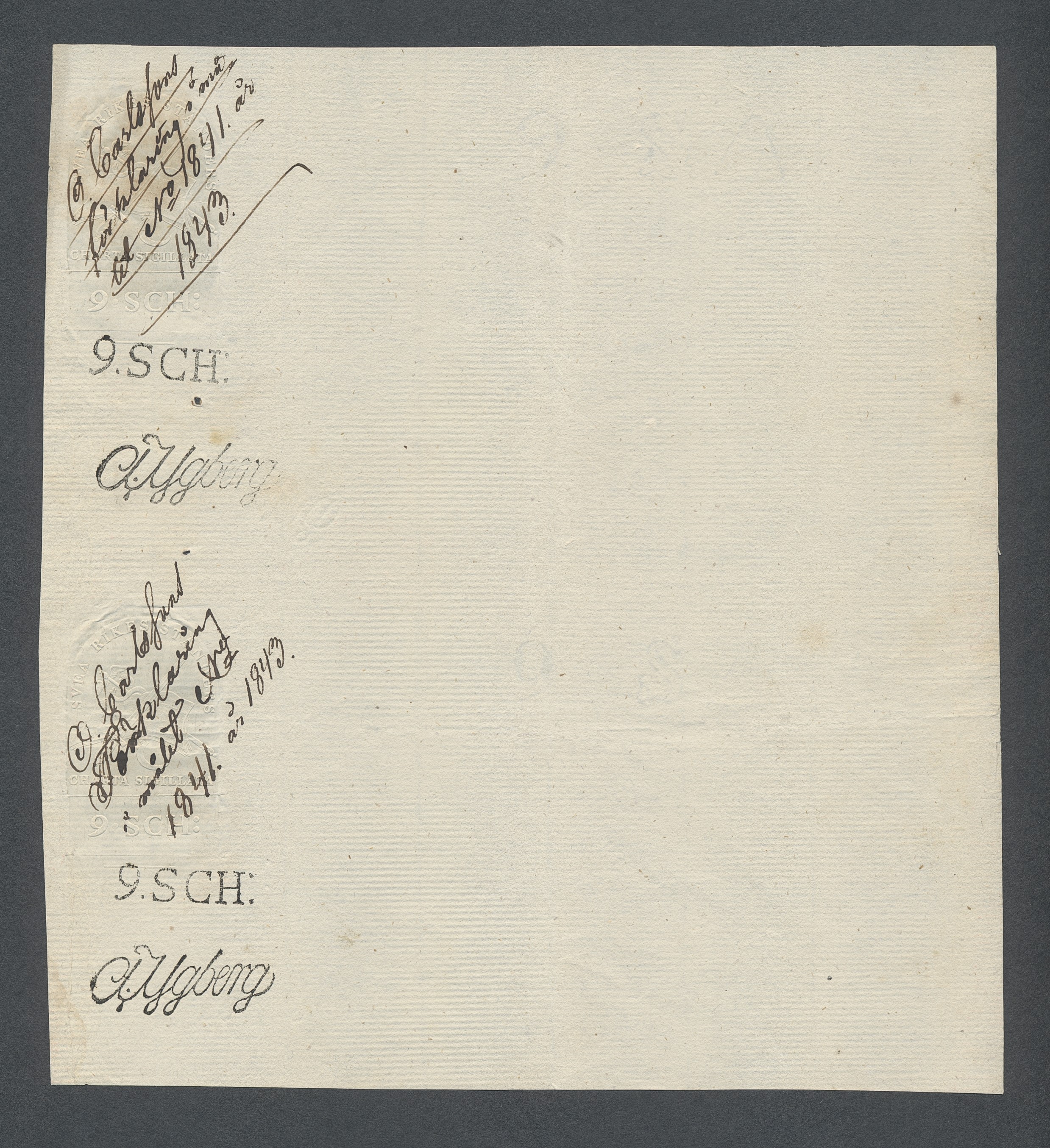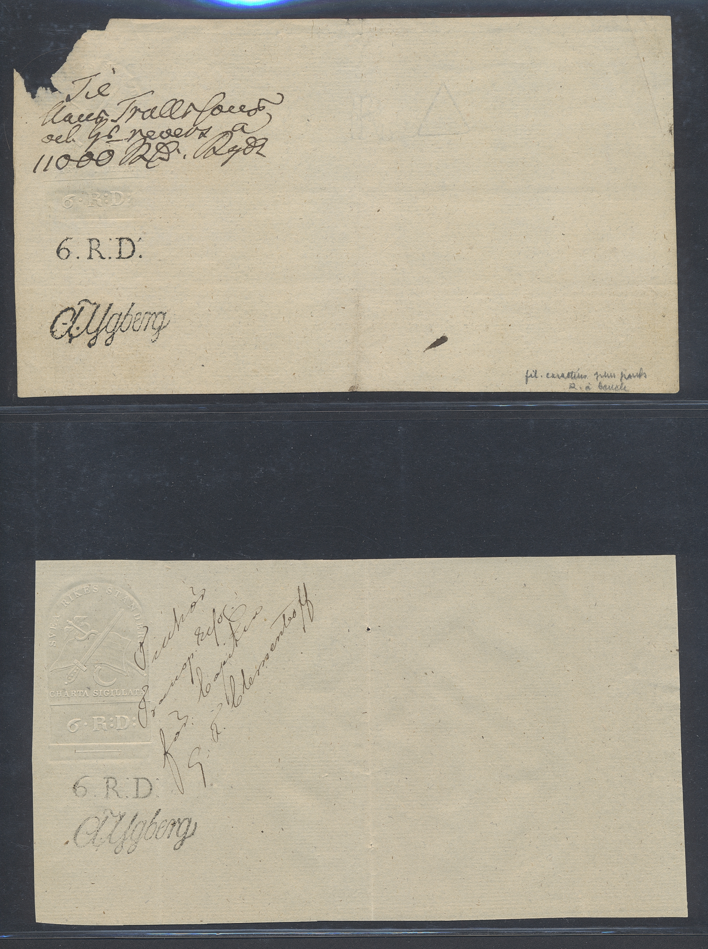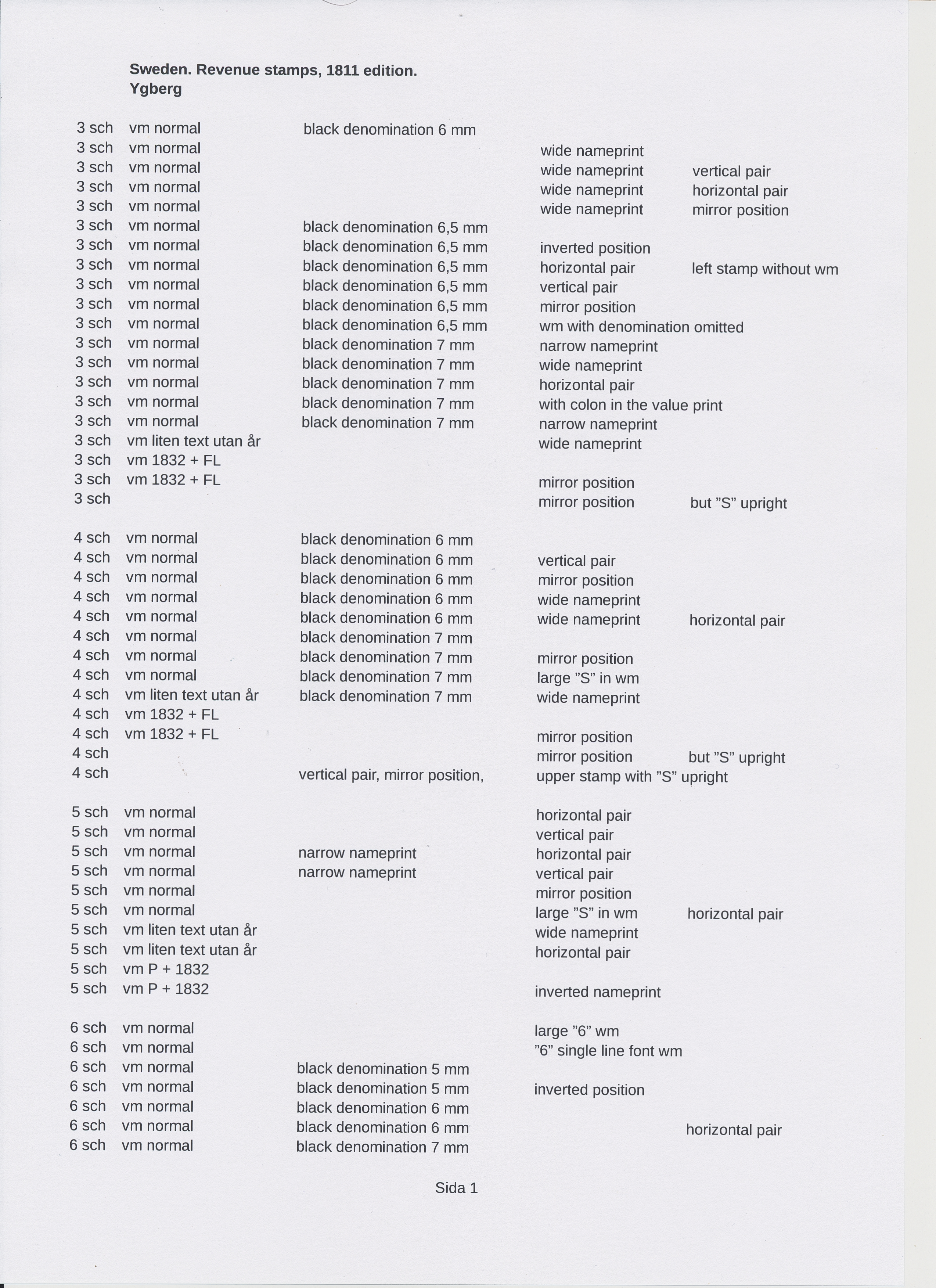 Sweden. Revenues, collection 1811–1844 in two albums. Documentary stamp, 1811 edition. Ygberg nameprint. Extensive collection 3 sch–50 Rd, just missing four denominations (32 sch, 1 1/3, 1 2/3 and 4 Rd). Specialized on watermark and paper with a large number of rare variants, e.g. mirror positions. 176 items in total incl 15 denominations graded as 'R' in Facit 2015. A compilation nearly impossible to obtain. The cat. value exceed 40000 SEK with a substancial premium for the variants. A list of the content and pictures of almost the entire lot are presented at www.philea.se. Ex. Per Sundberg. (176)