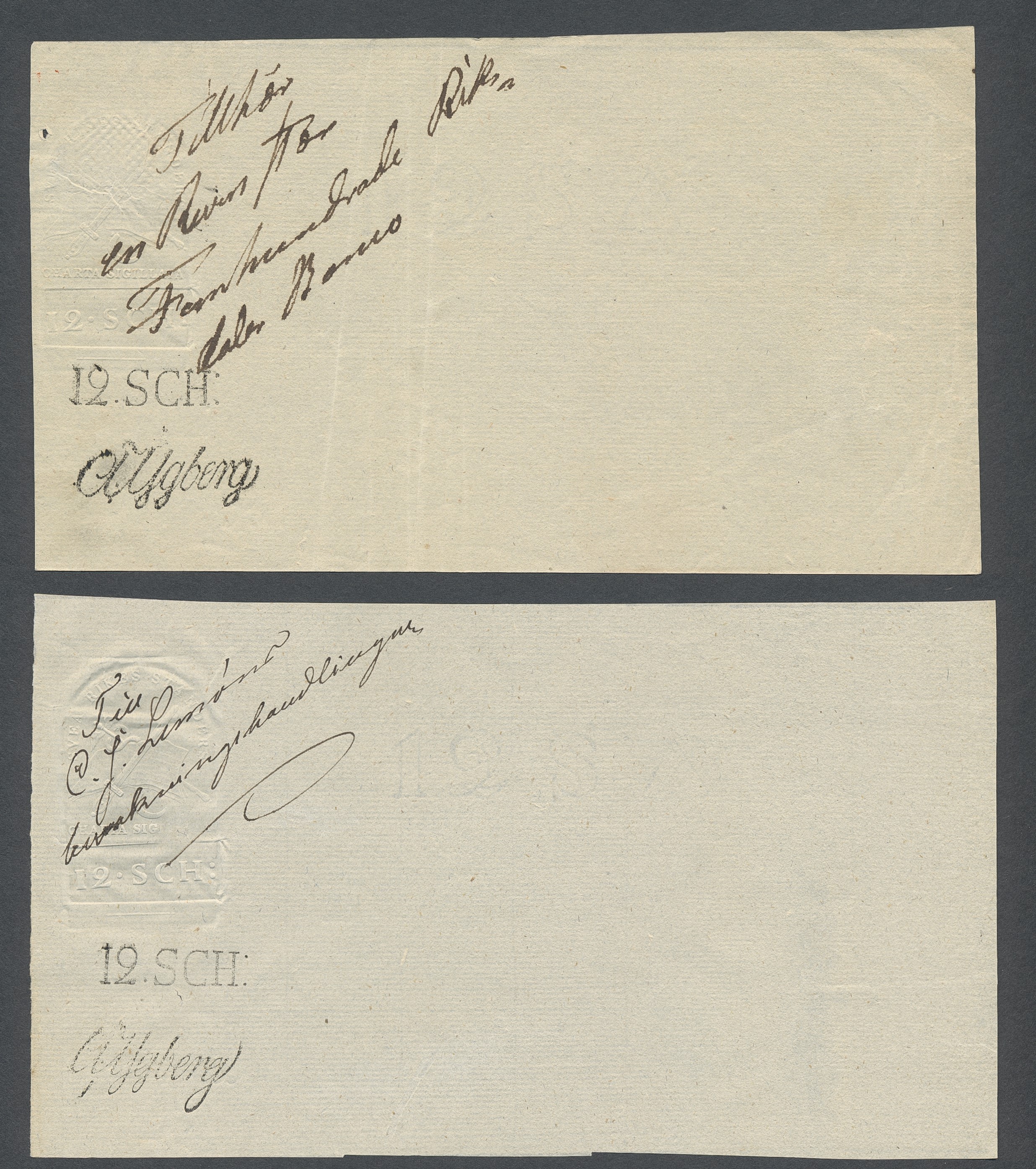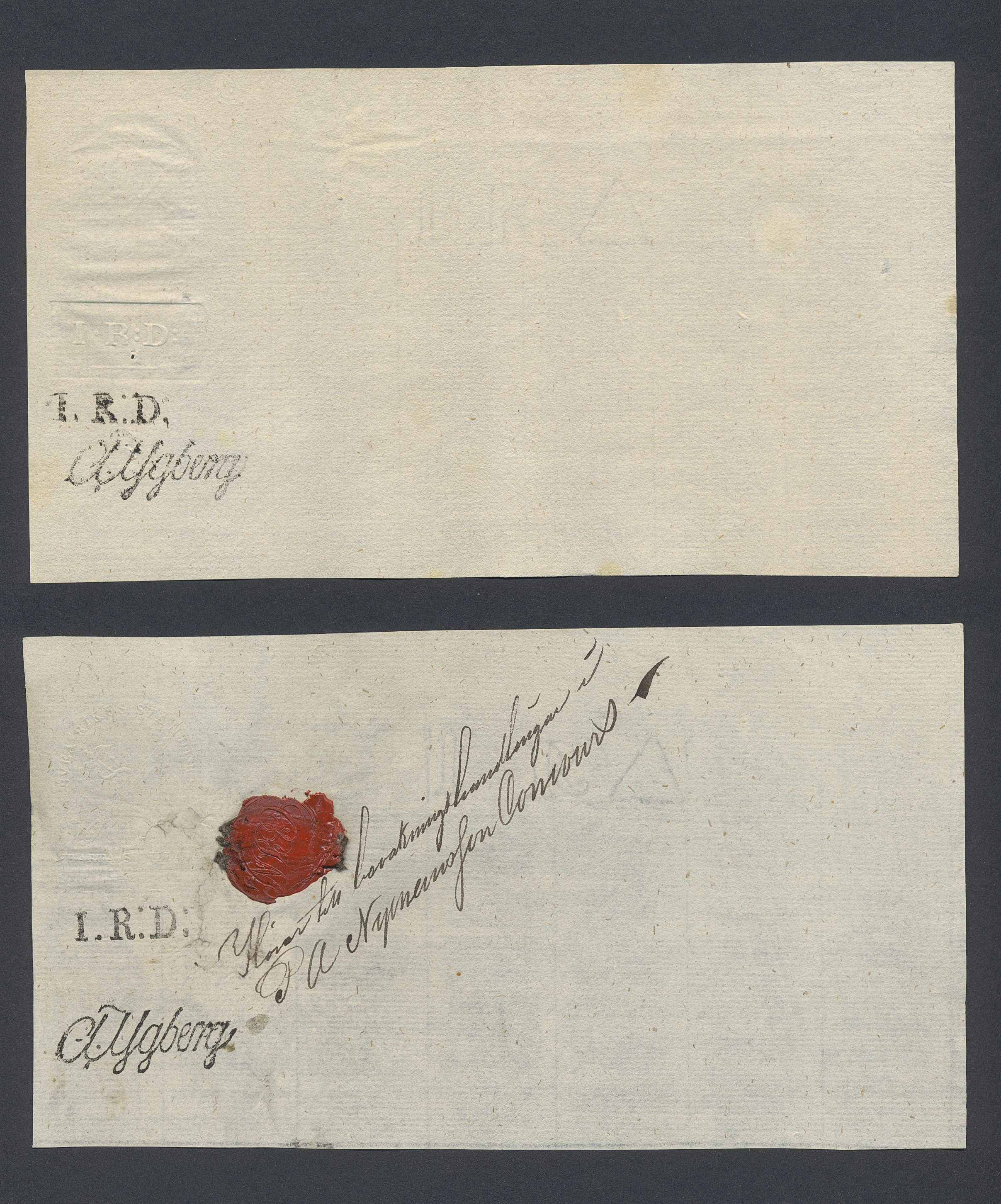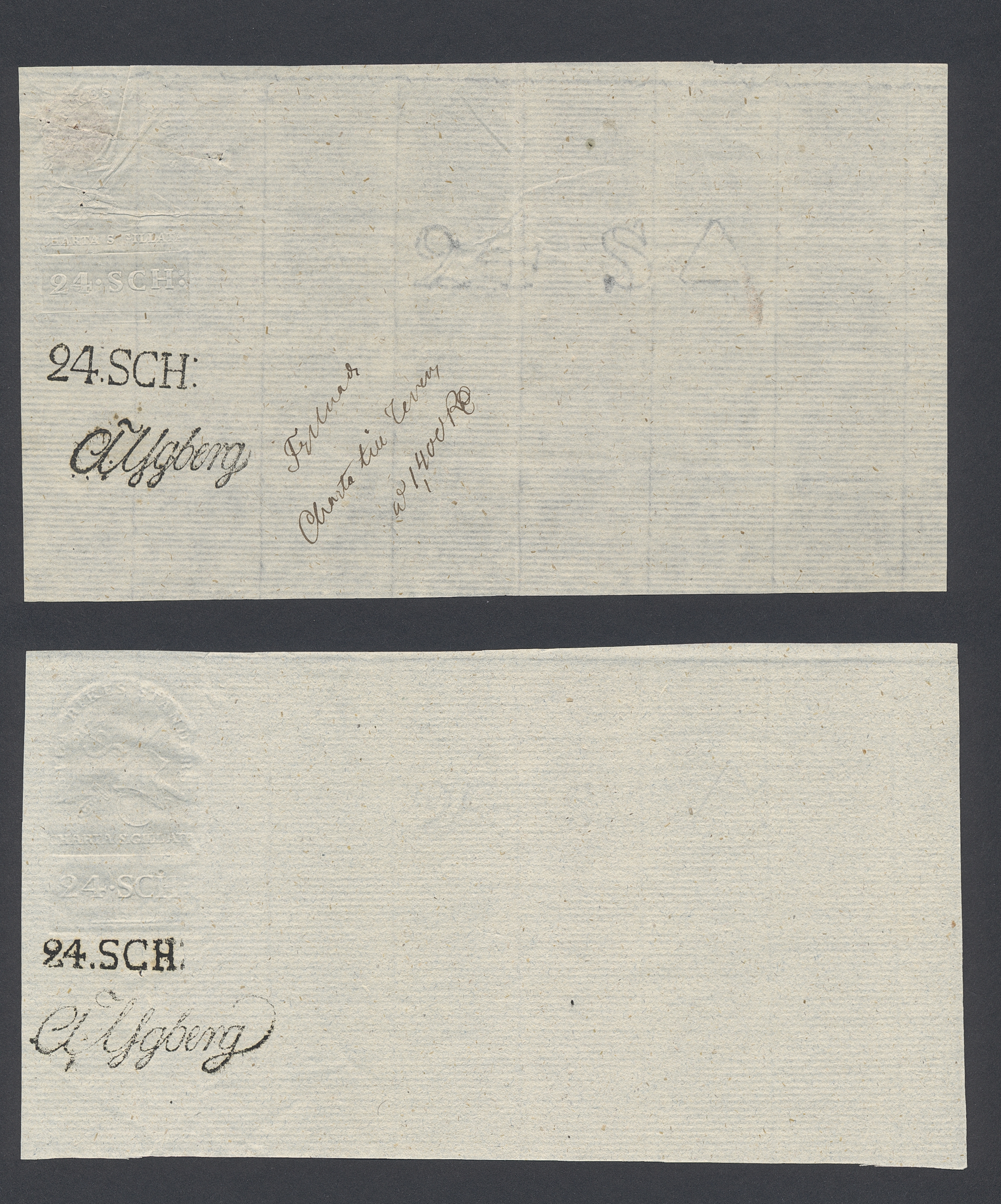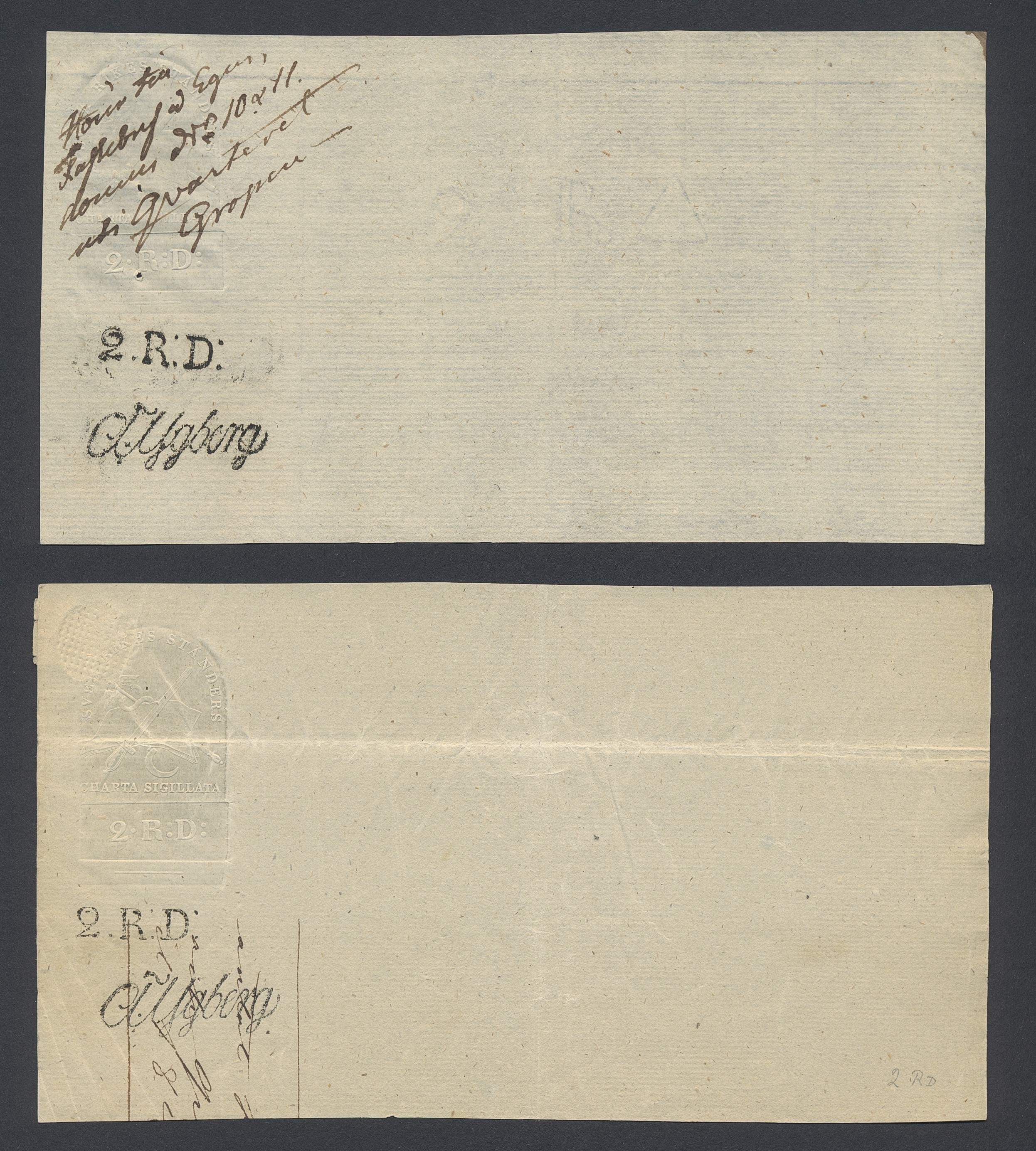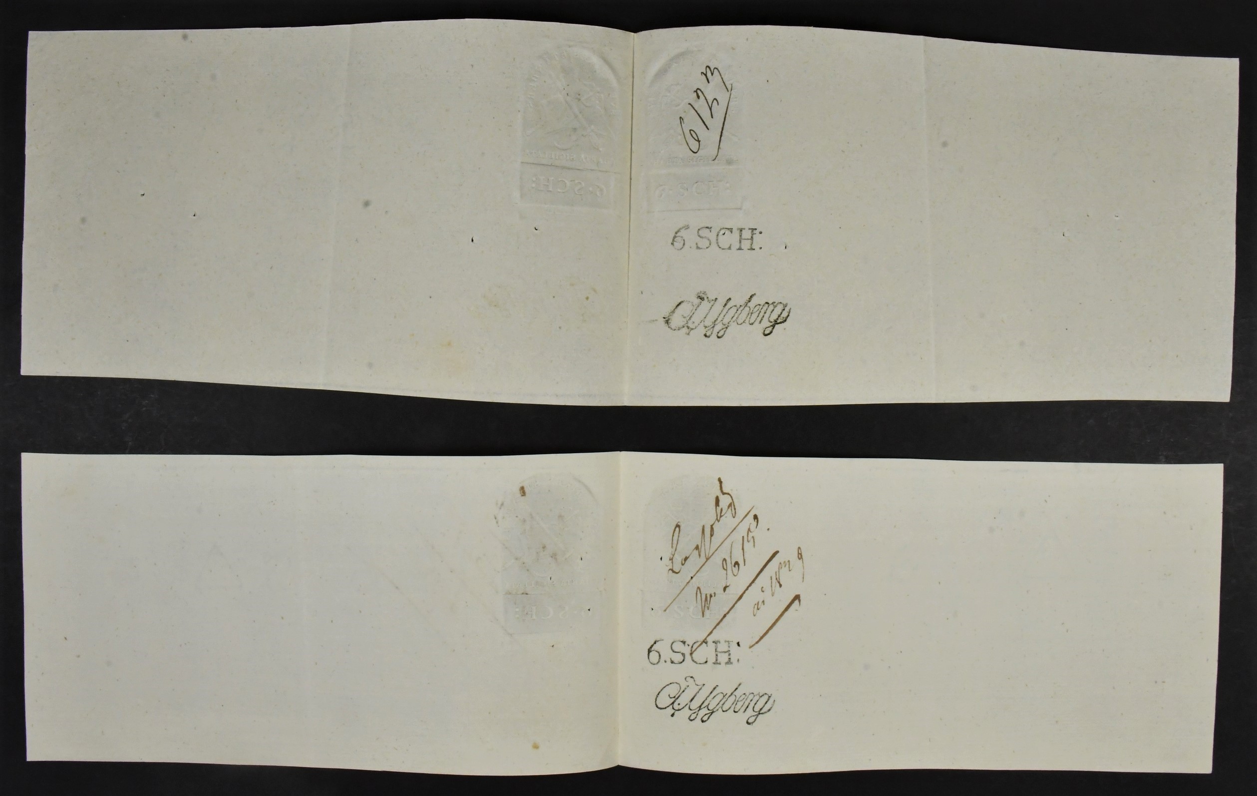Sweden. Revenues, collection 1811–1844 in two albums. Documentary stamp, 1811 edition. Ygberg nameprint. Extensive collection 3 sch–50 Rd, just missing four denominations (32 sch, 1 1/3, 1 2/3 and 4 Rd). Specialized on watermark and paper with a large number of rare variants, e.g. mirror positions. 176 items in total incl 15 denominations graded as 'R' in Facit 2015. A compilation nearly impossible to obtain. The cat. value exceed 40000 SEK with a substancial premium for the variants. A list of the content and pictures of almost the entire lot are presented at www.philea.se. Ex. Per Sundberg. (176)