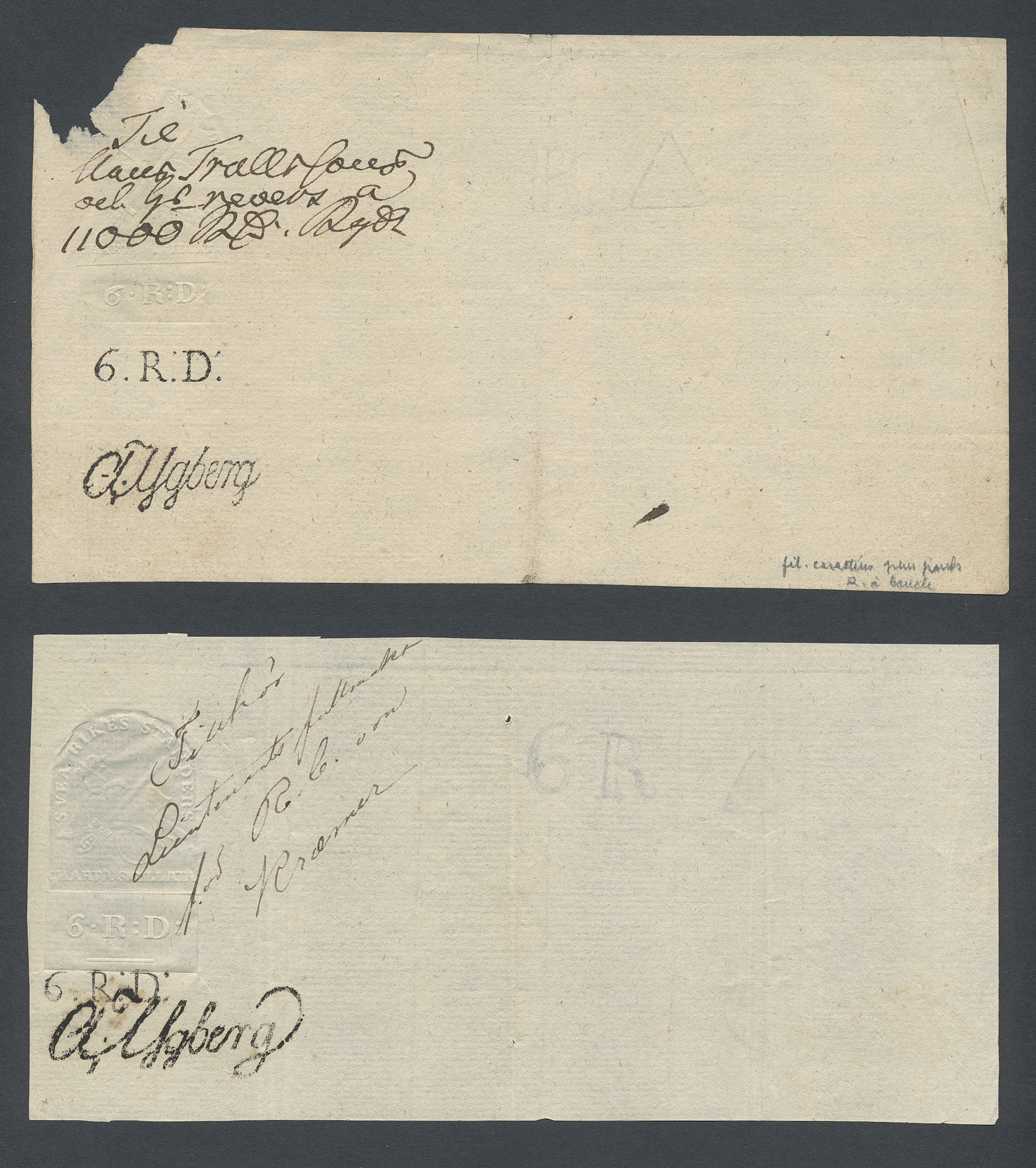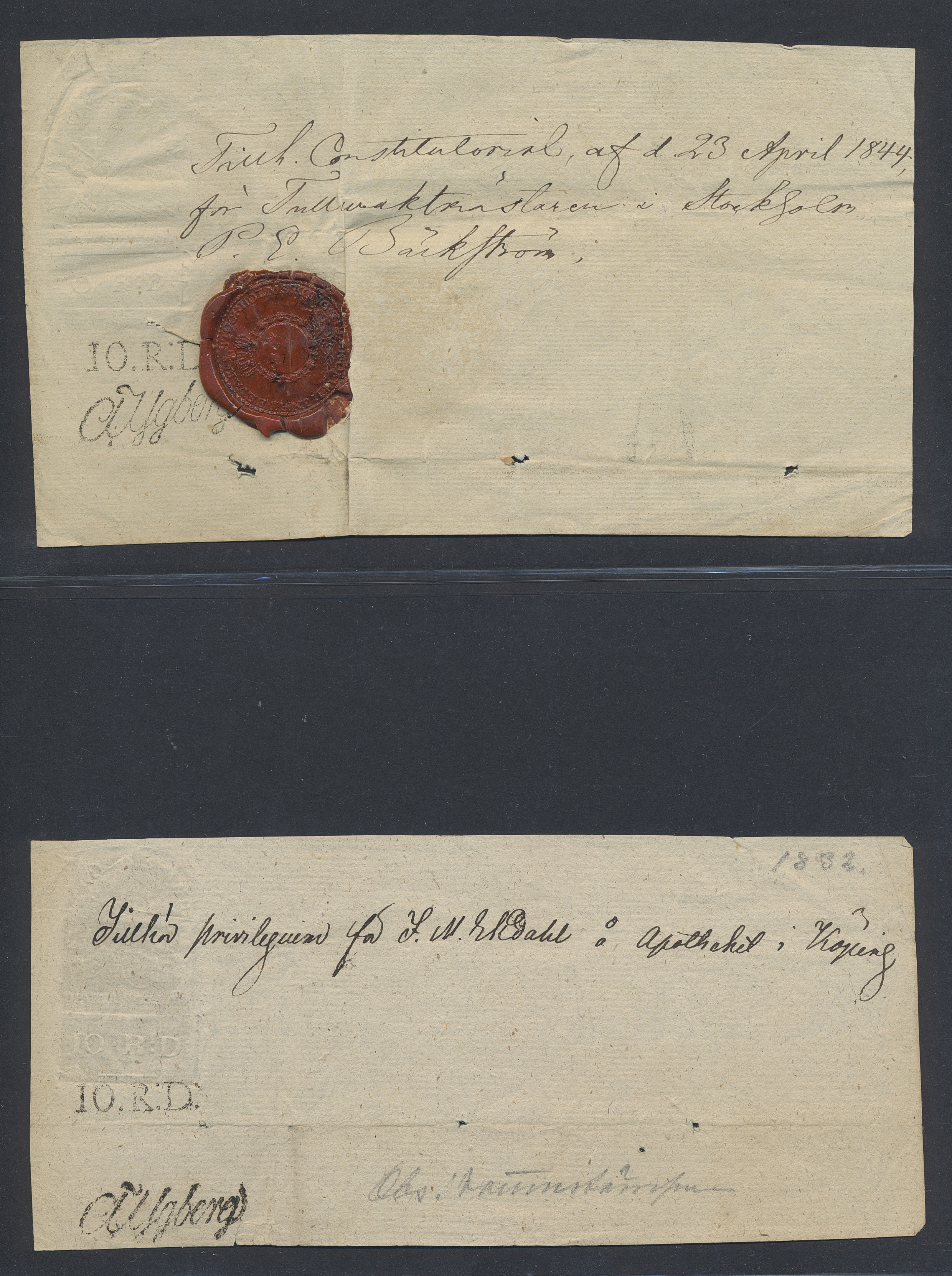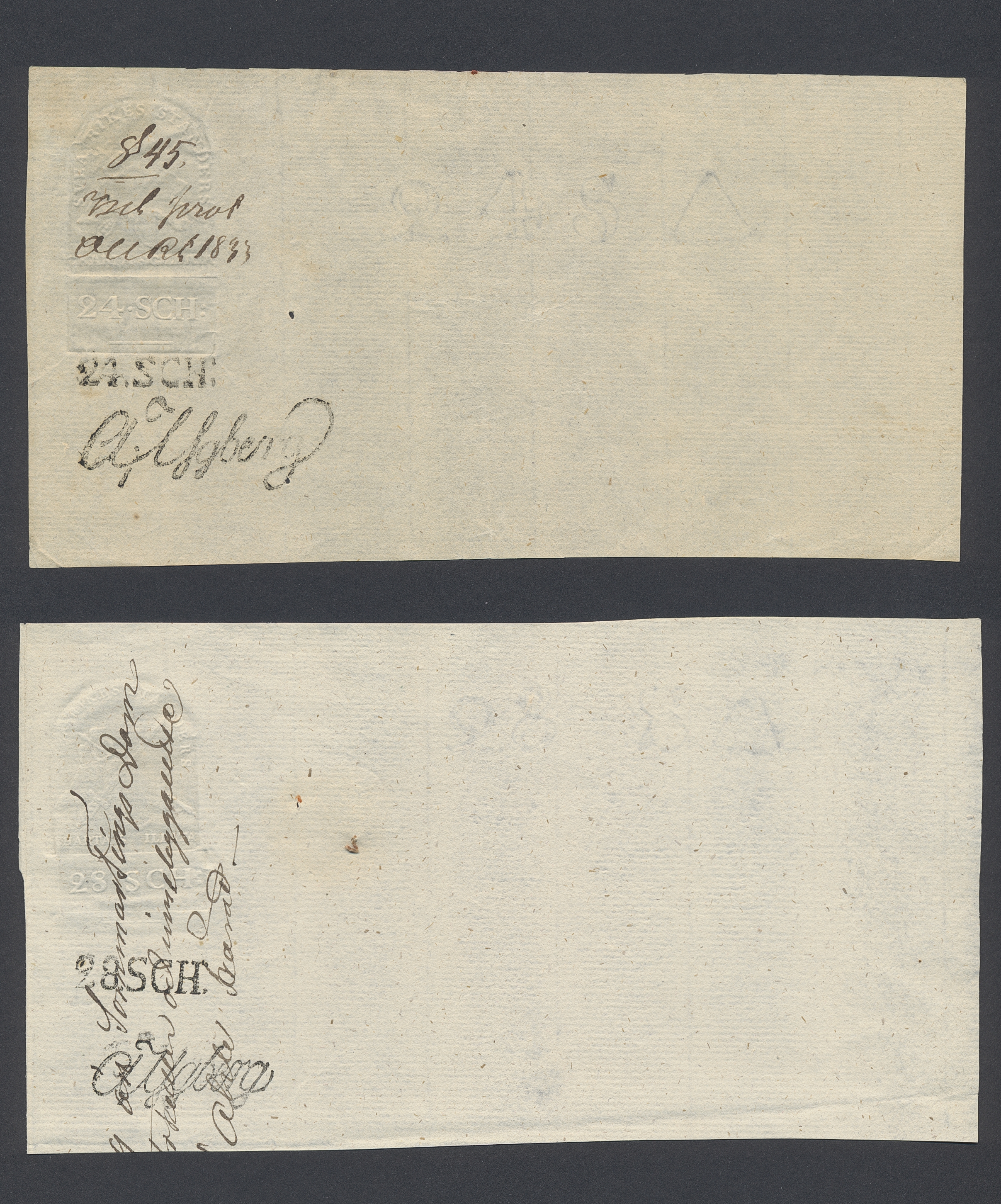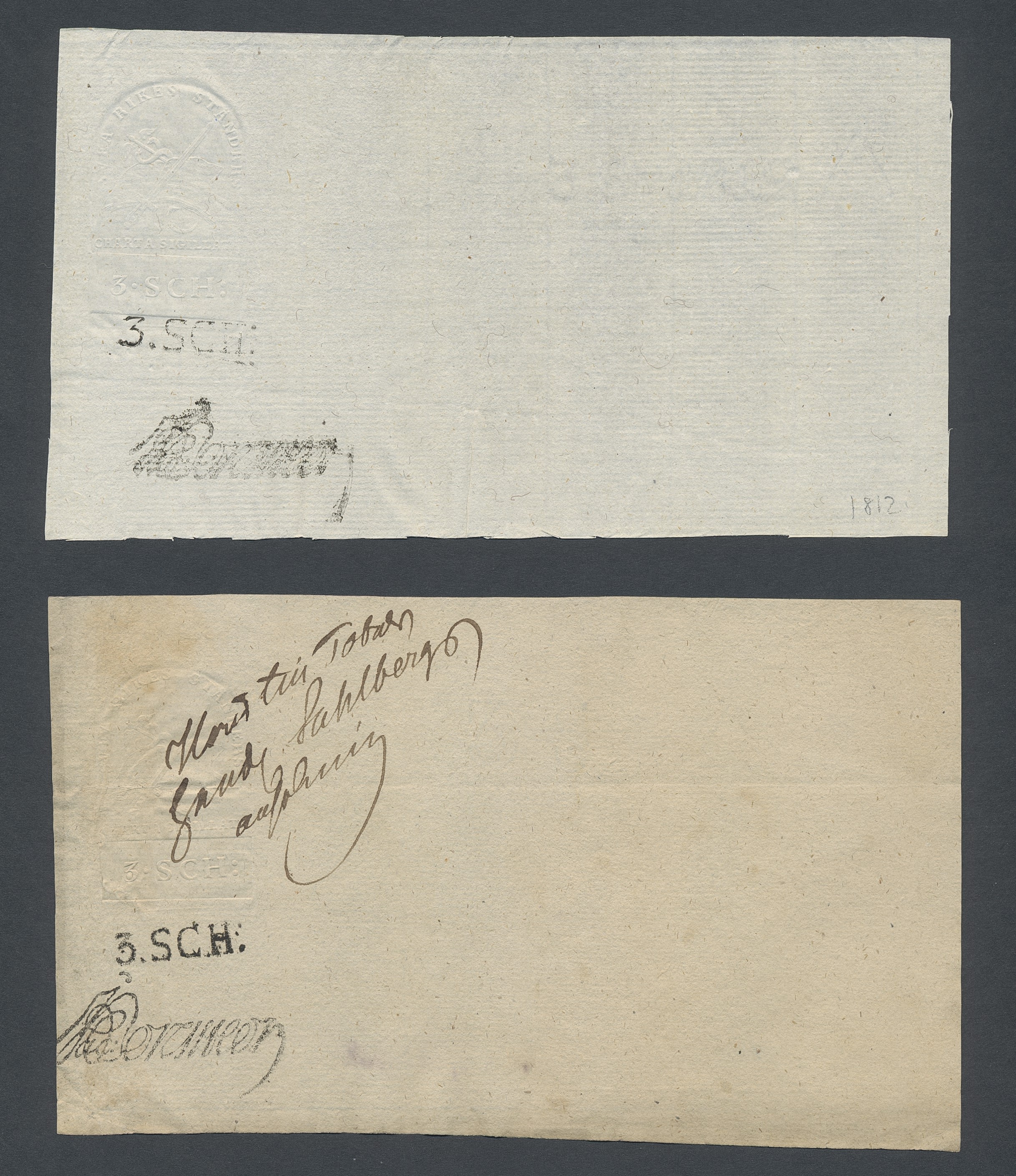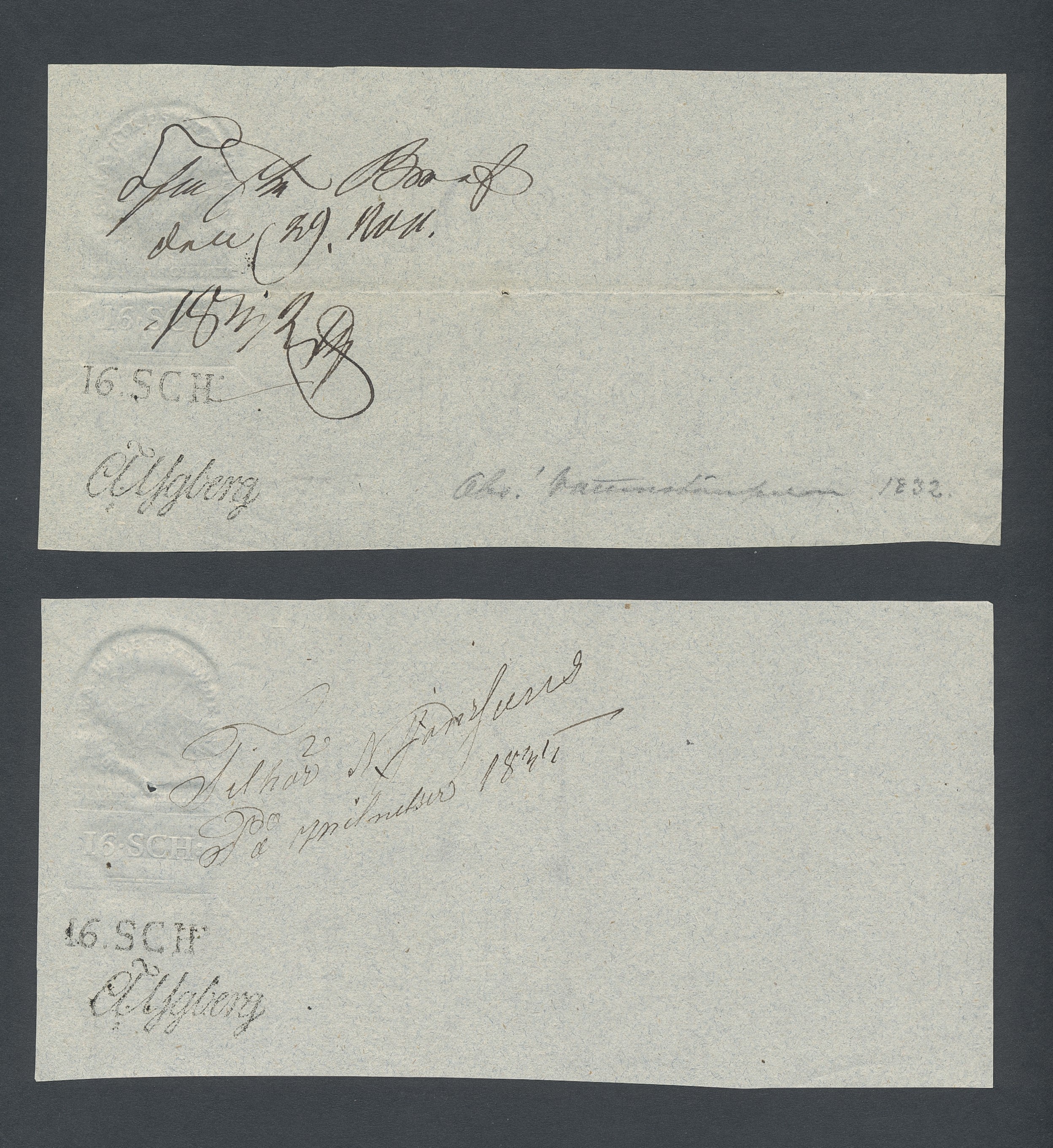 Sweden. Revenues, collection 1811–1844 in two albums. Documentary stamp, 1811 edition. Ygberg nameprint. Extensive collection 3 sch–50 Rd, just missing four denominations (32 sch, 1 1/3, 1 2/3 and 4 Rd). Specialized on watermark and paper with a large number of rare variants, e.g. mirror positions. 176 items in total incl 15 denominations graded as 'R' in Facit 2015. A compilation nearly impossible to obtain. The cat. value exceed 40000 SEK with a substancial premium for the variants. A list of the content and pictures of almost the entire lot are presented at www.philea.se. Ex. Per Sundberg. (176)