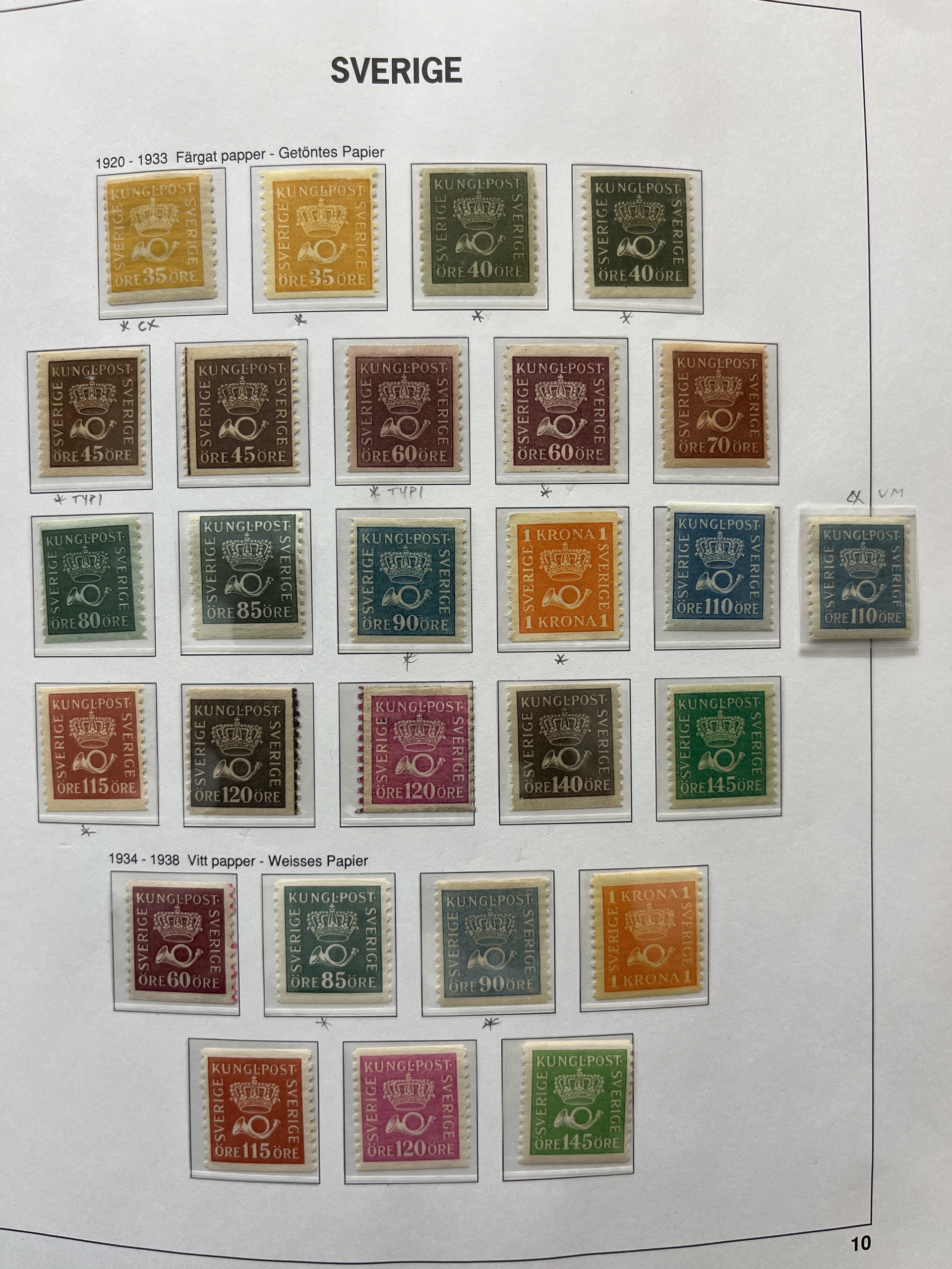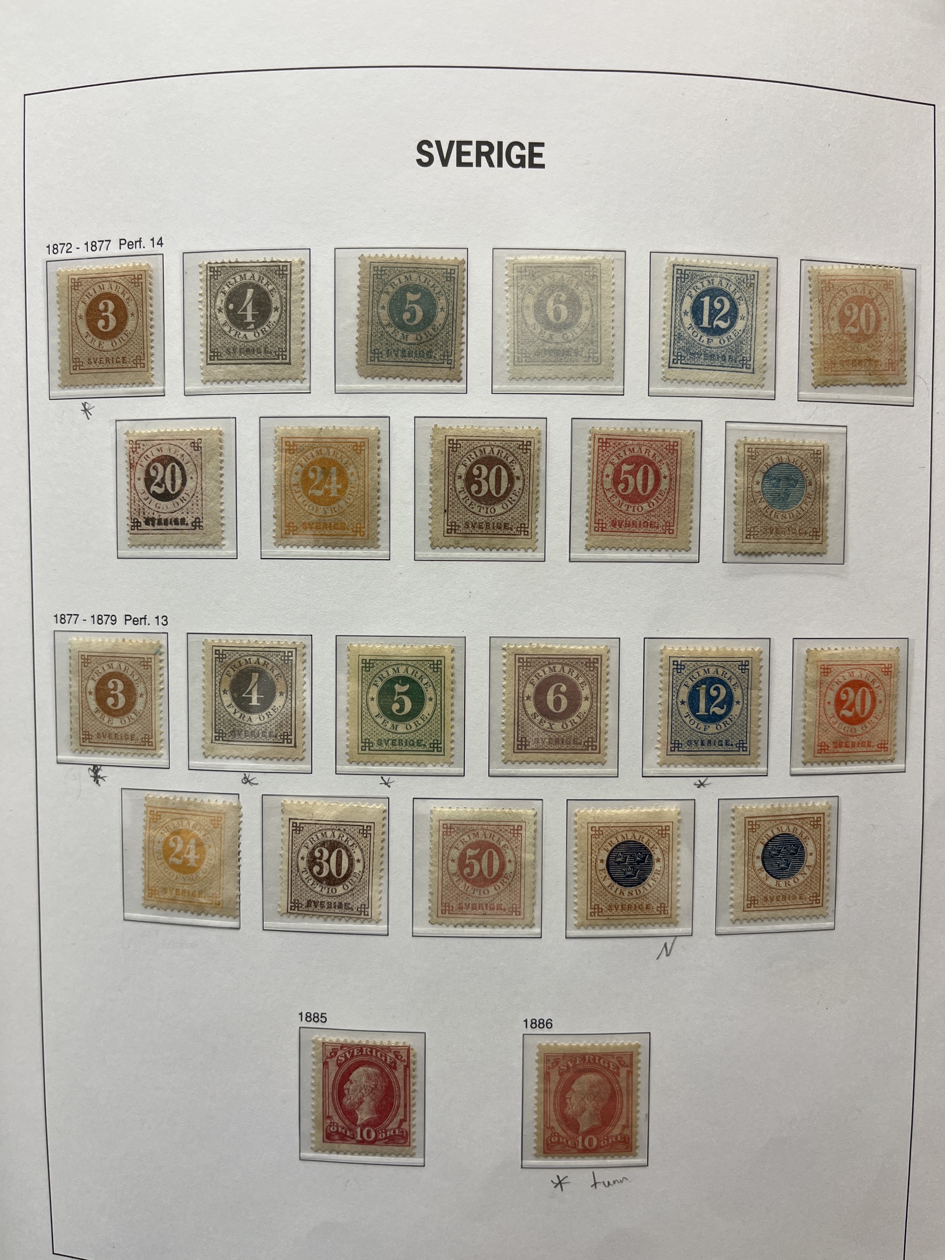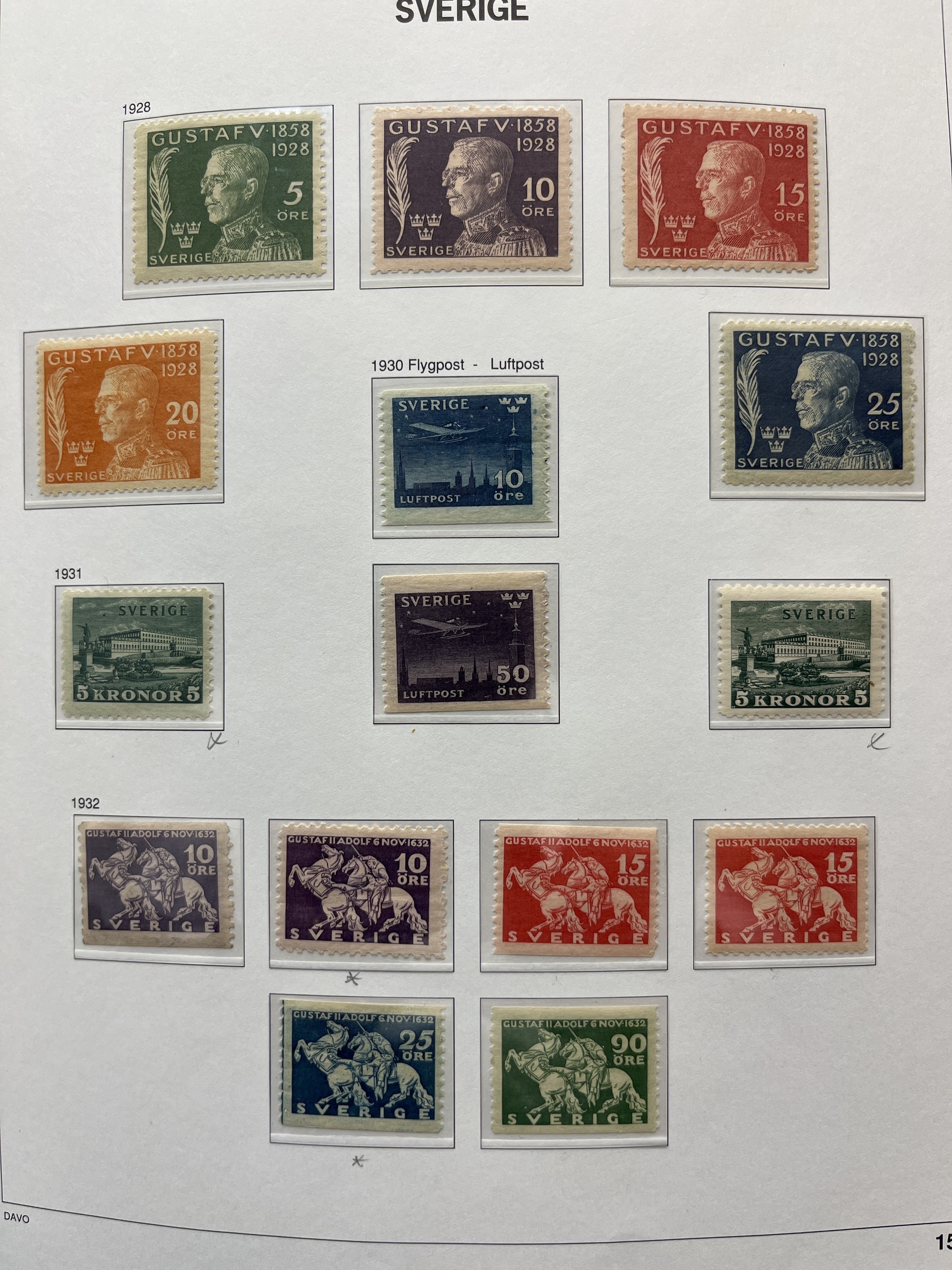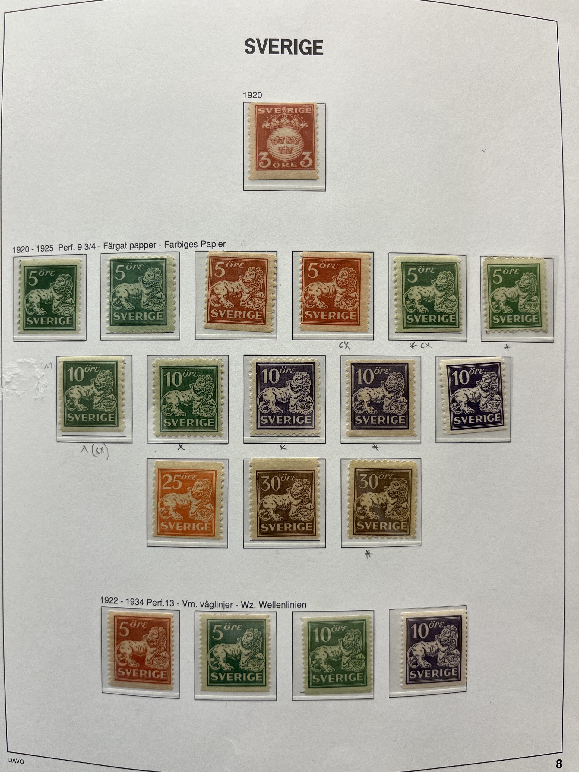 Sweden. Collection ★★/★ 1855–1969 in DAVO album with stamp mounts. Compl. collection in main types with e.g. 3–24 skill bco (incl some reprints), 55 and 80 öre with cert. the beginning are some stamps without gum. In the beginning mixed quality, later fine.