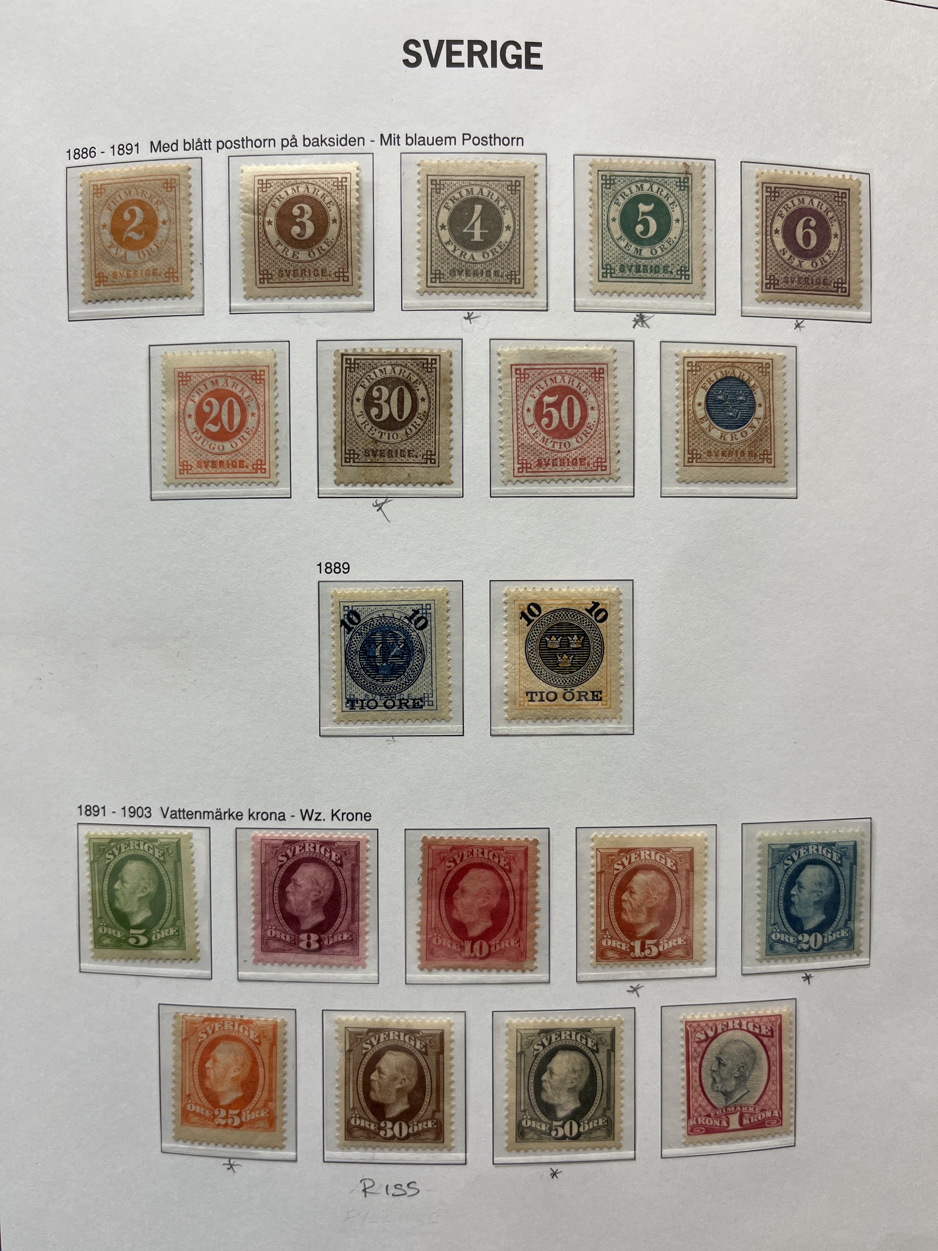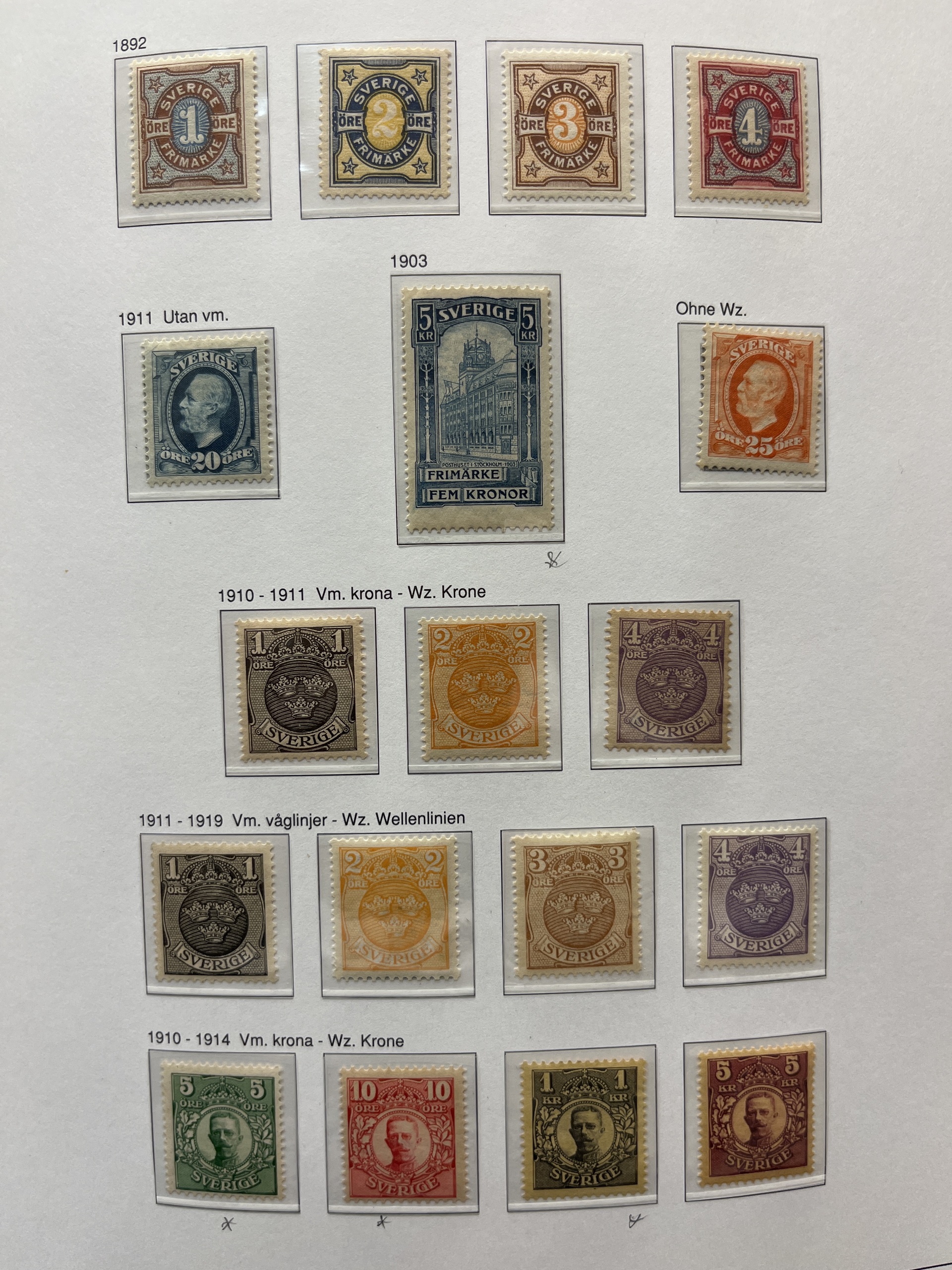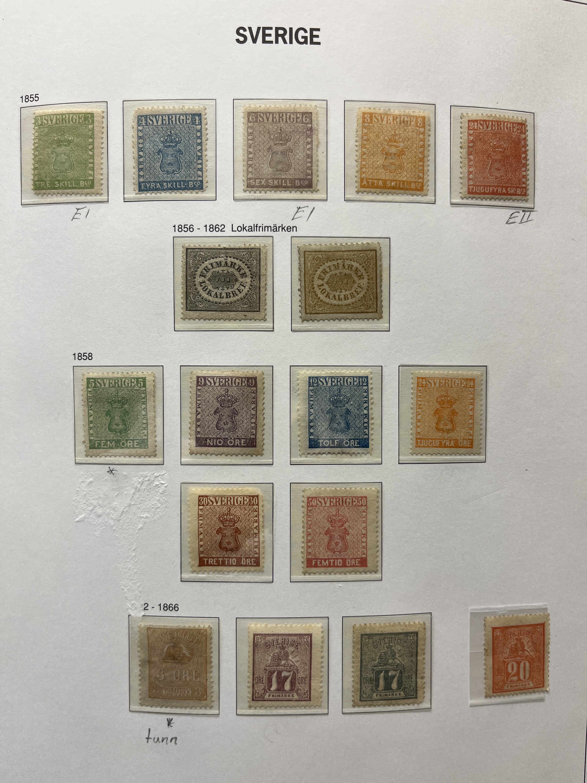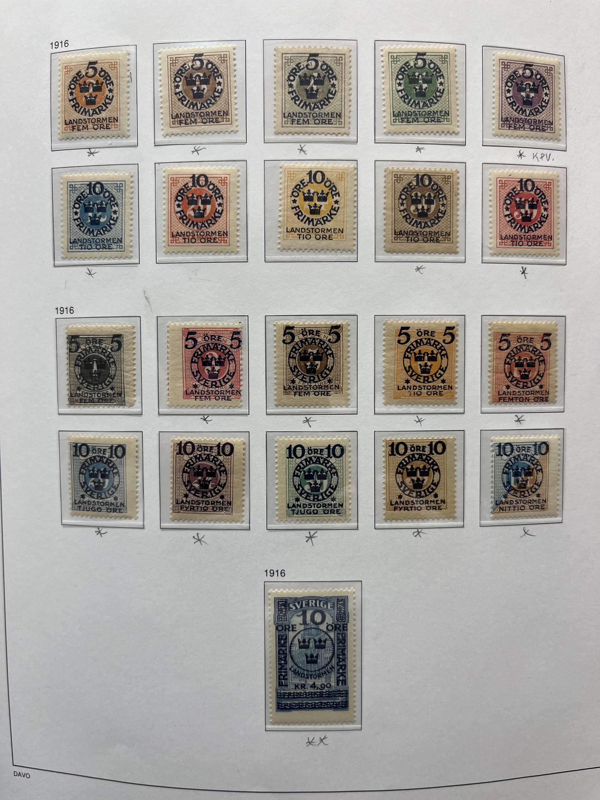 Sweden. Collection ★★/★ 1855–1969 in DAVO album with stamp mounts. Compl. collection in main types with e.g. 3–24 skill bco (incl some reprints), 55 and 80 öre with cert. the beginning are some stamps without gum. In the beginning mixed quality, later fine.