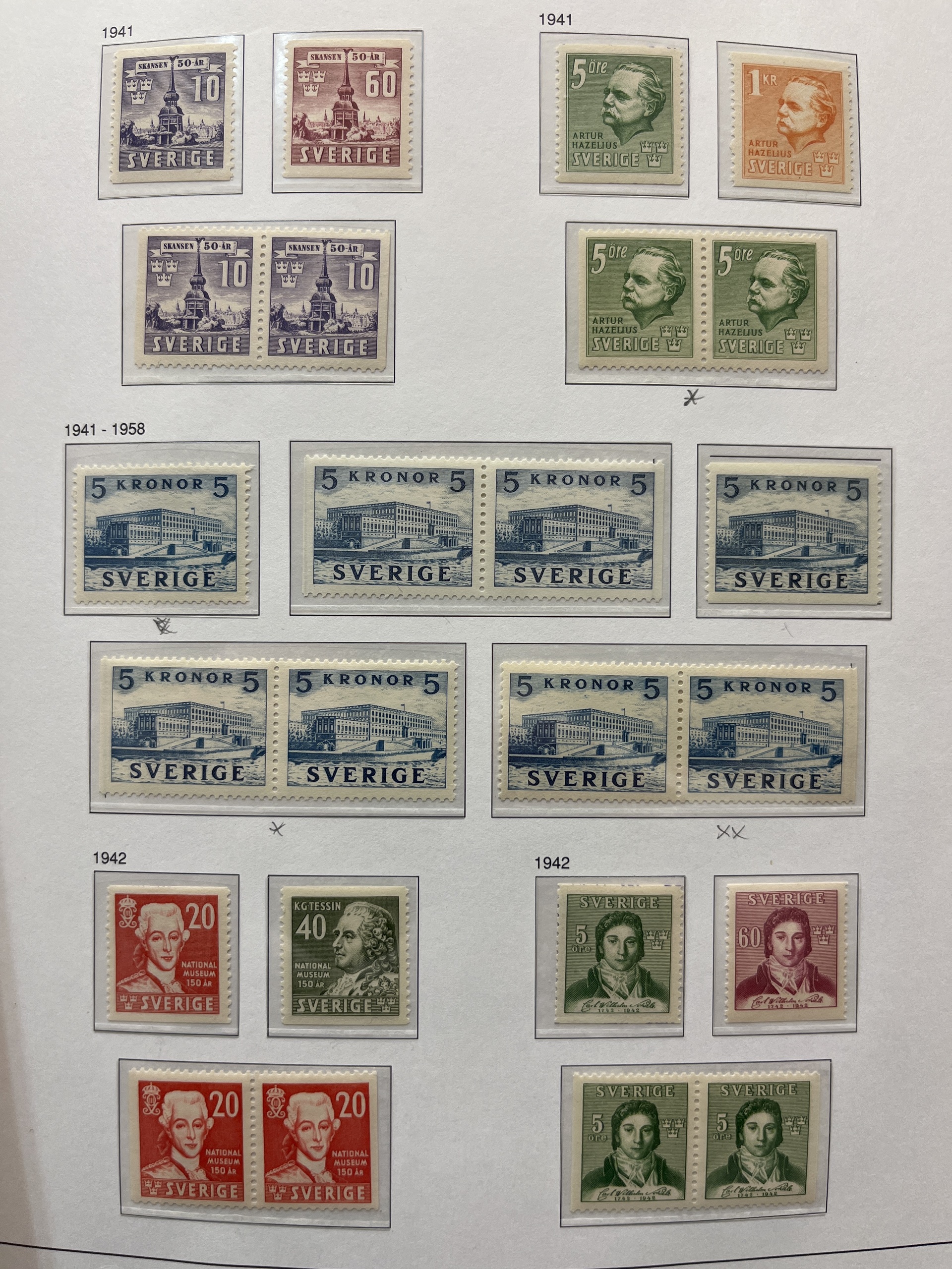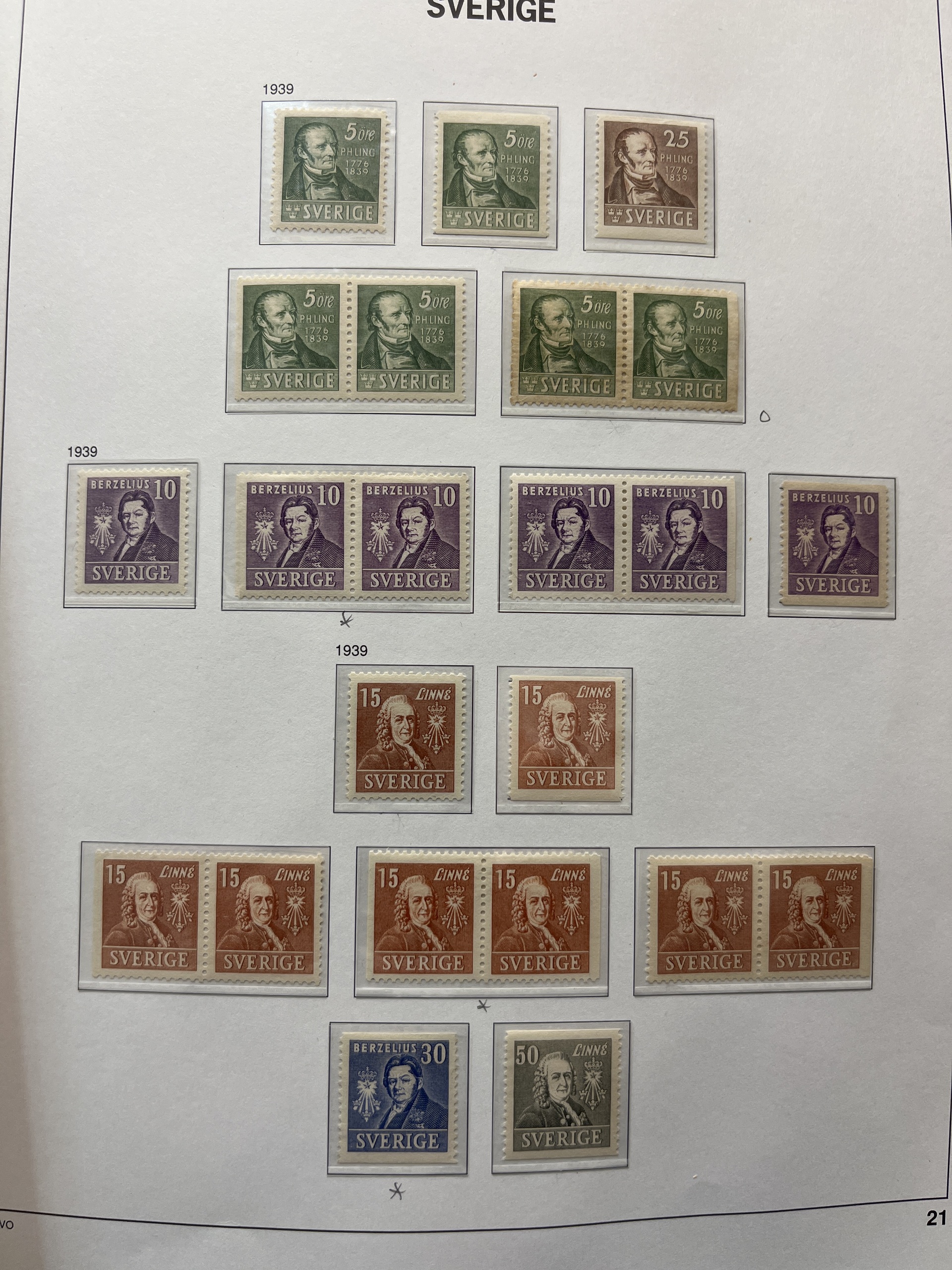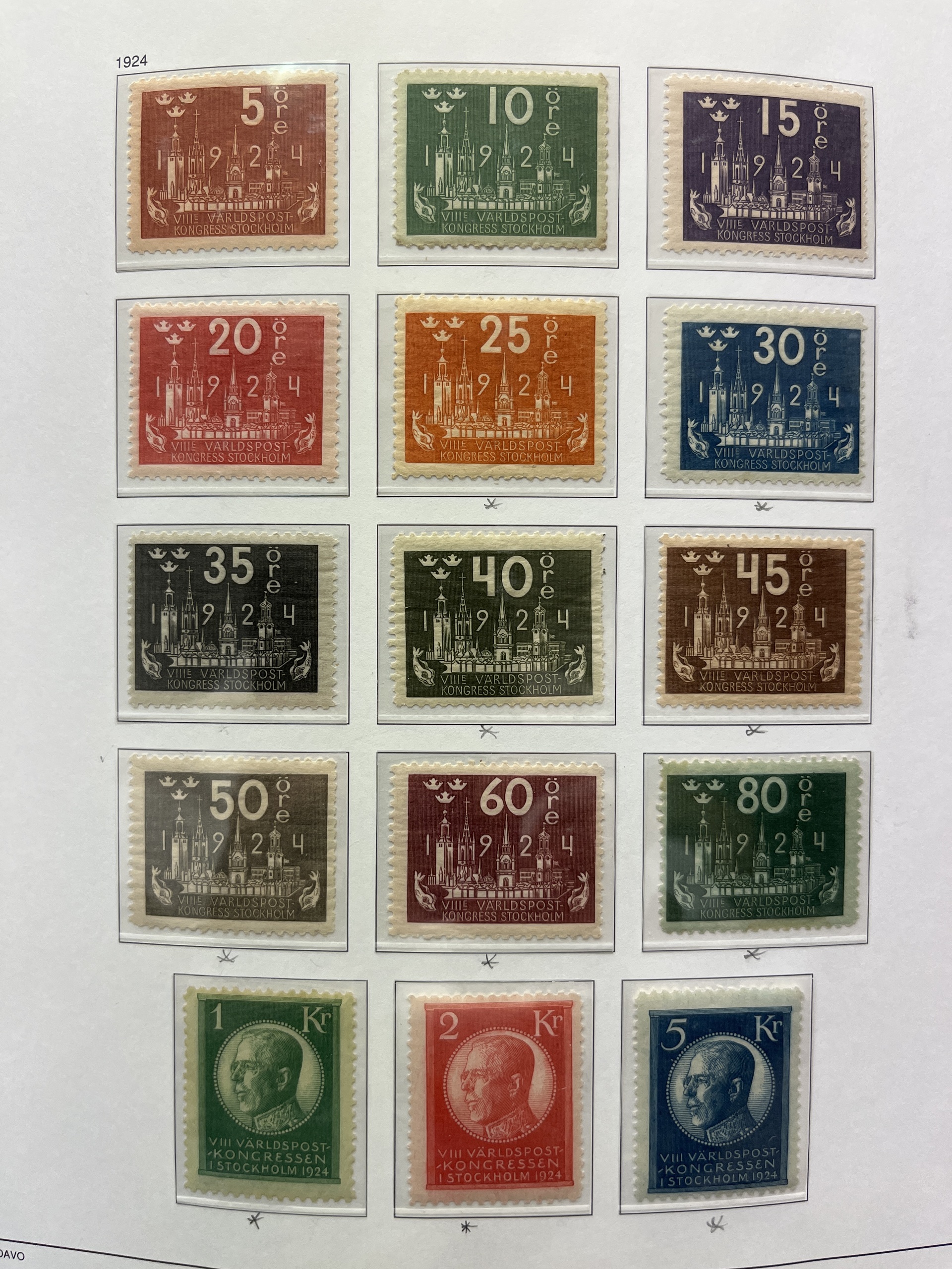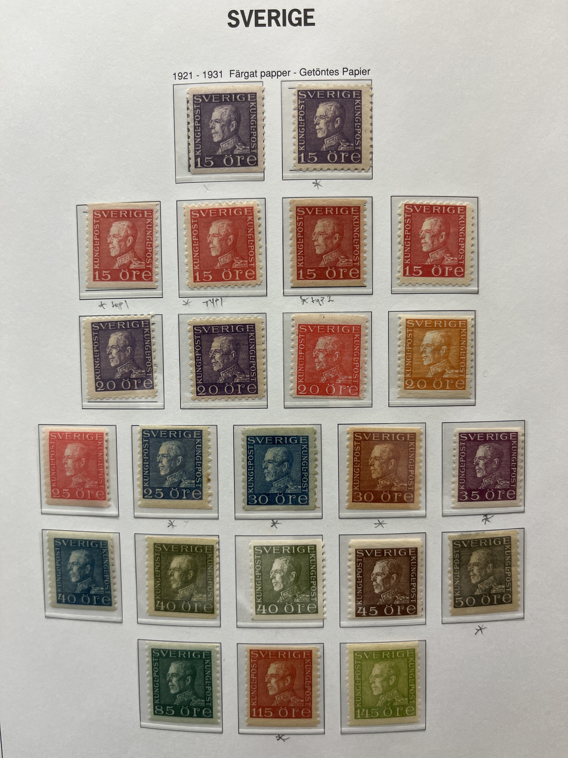 Sweden. Collection ★★/★ 1855–1969 in DAVO album with stamp mounts. Compl. collection in main types with e.g. 3–24 skill bco (incl some reprints), 55 and 80 öre with cert. the beginning are some stamps without gum. In the beginning mixed quality, later fine.