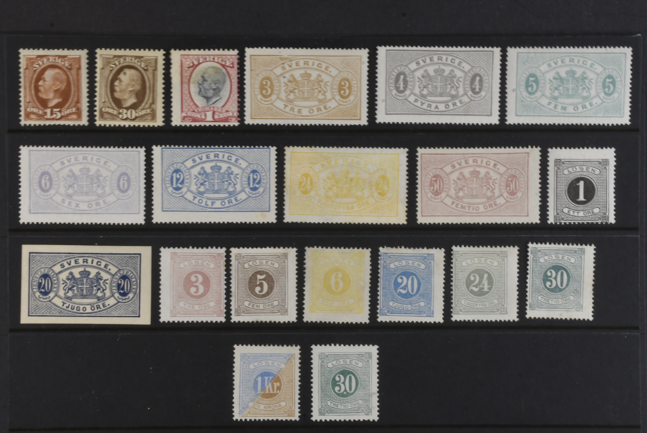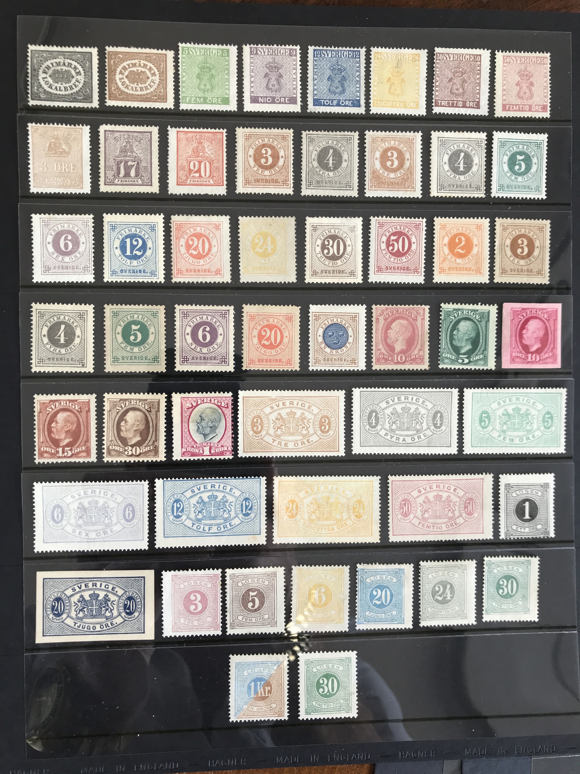 Sweden. ★. Selection with 52 different 1858-Oscar incl. F6+13N1, cpl Coat-of-Arms, nice Circle types, officials and postage due stamps. F15 with short perf., otherwise mostly fine quality. Facit > 96000:-. The entire lot is presented at www.philea.se.