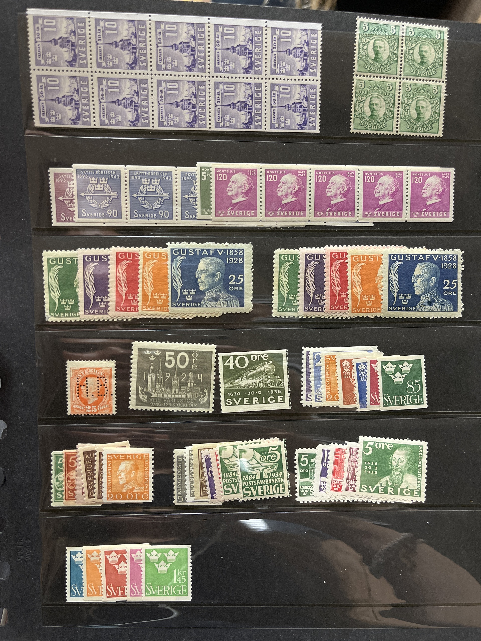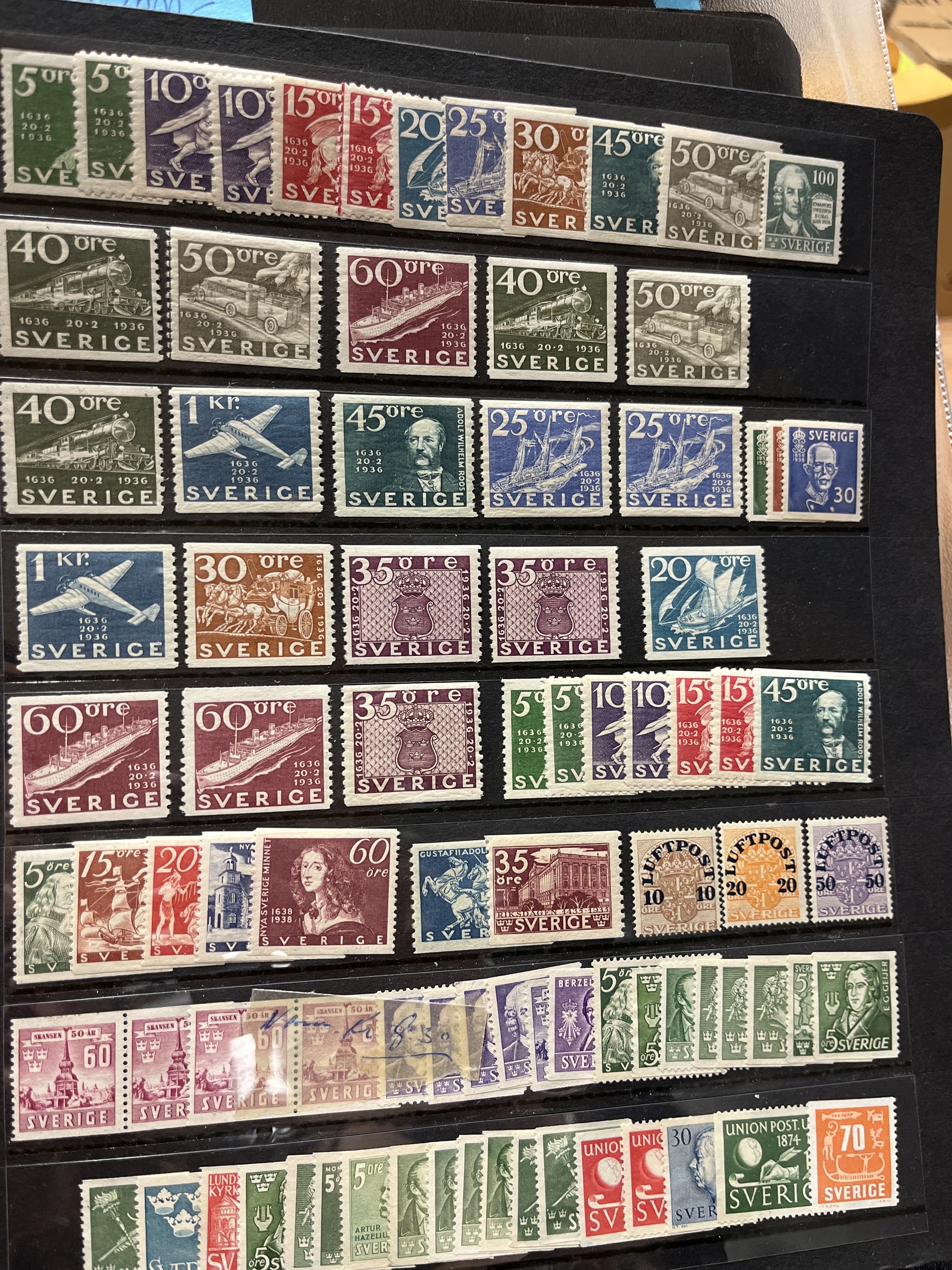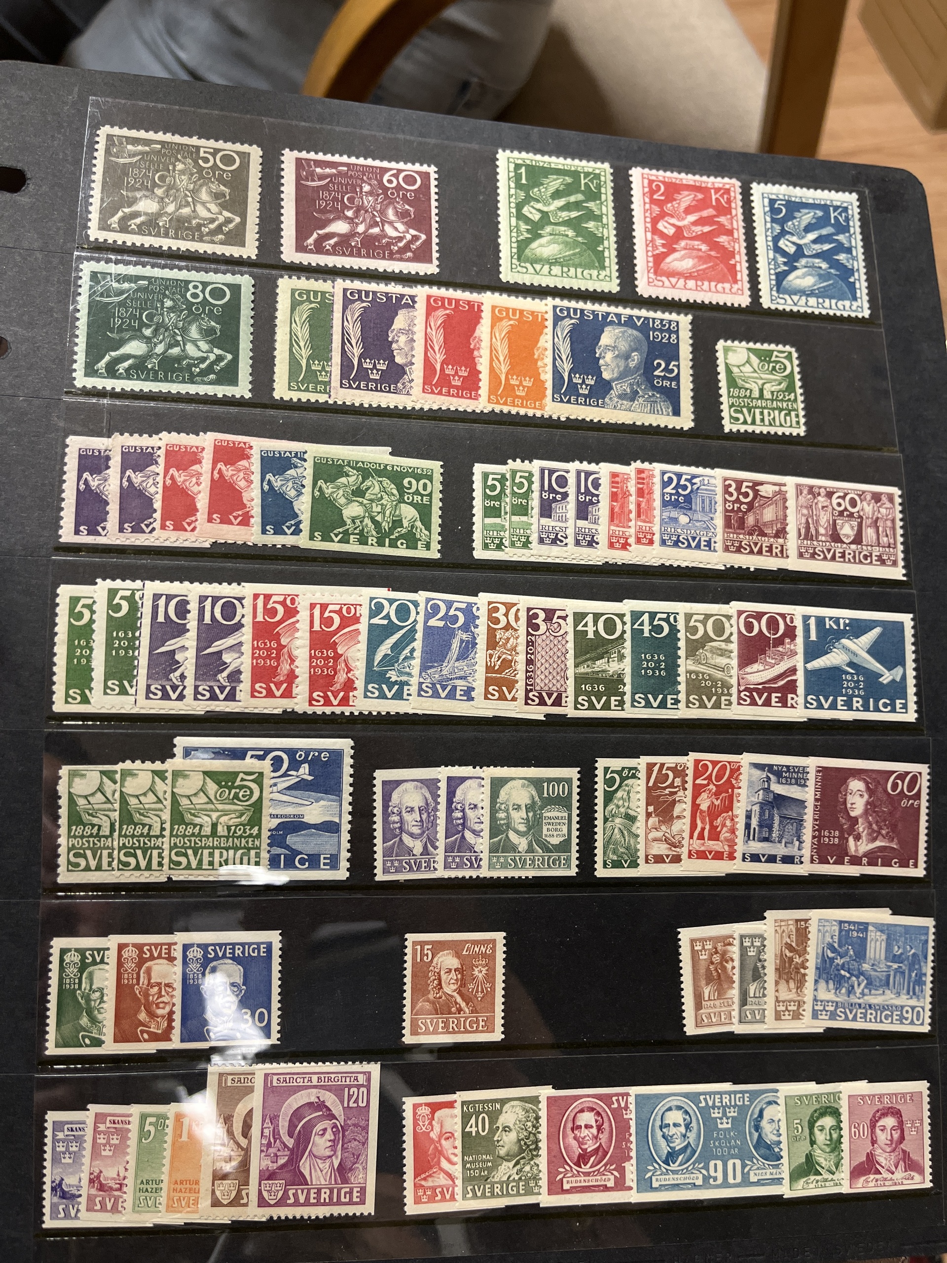Sweden. Accumulation ★★/★ 1880–1960s on visir leaves. somewhat messy and no order at all, but carefull inspection should be rewarding with better stamps here and there. Please see a selection of scans at www.philea.se. Mostly good quality. (ca. 400)