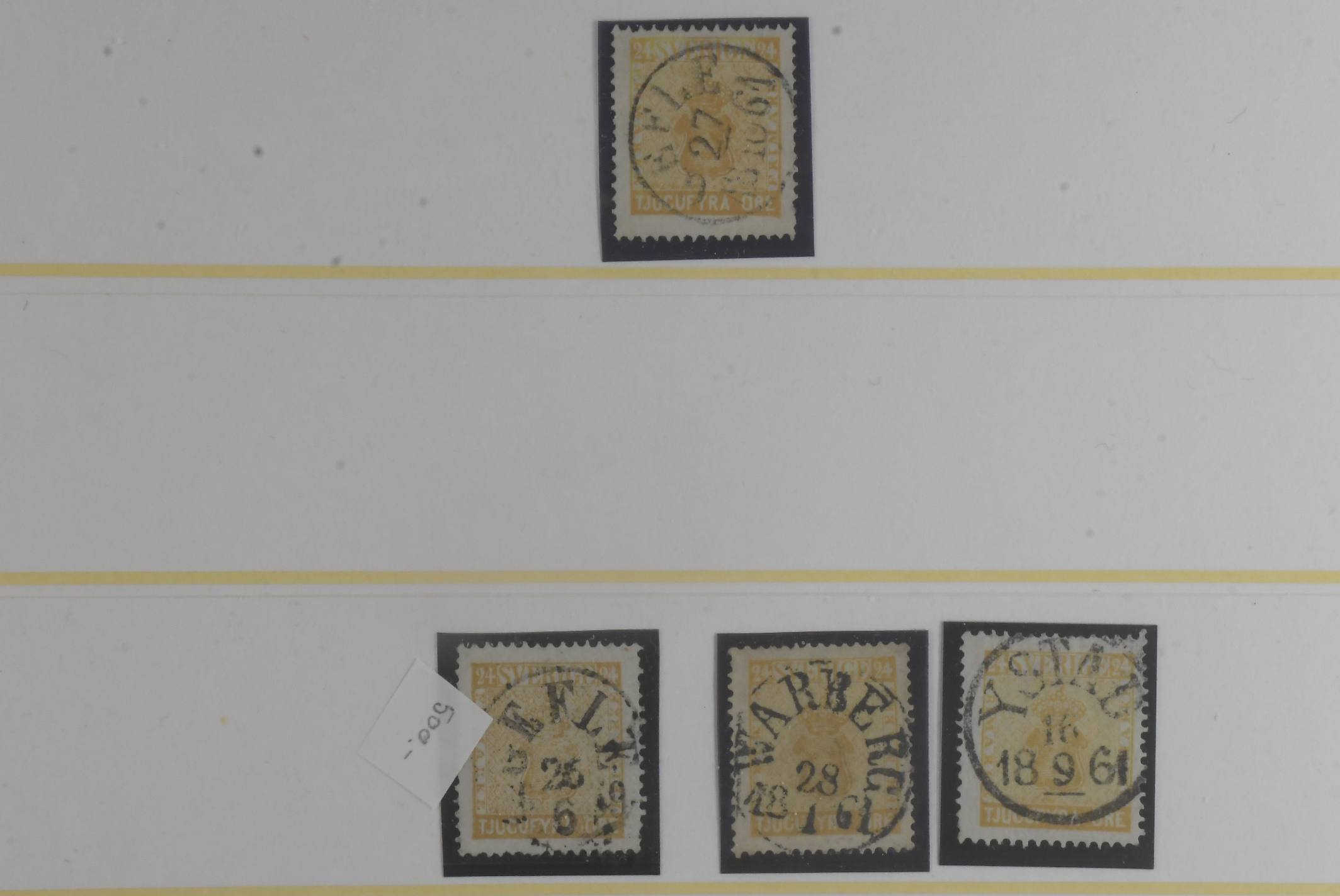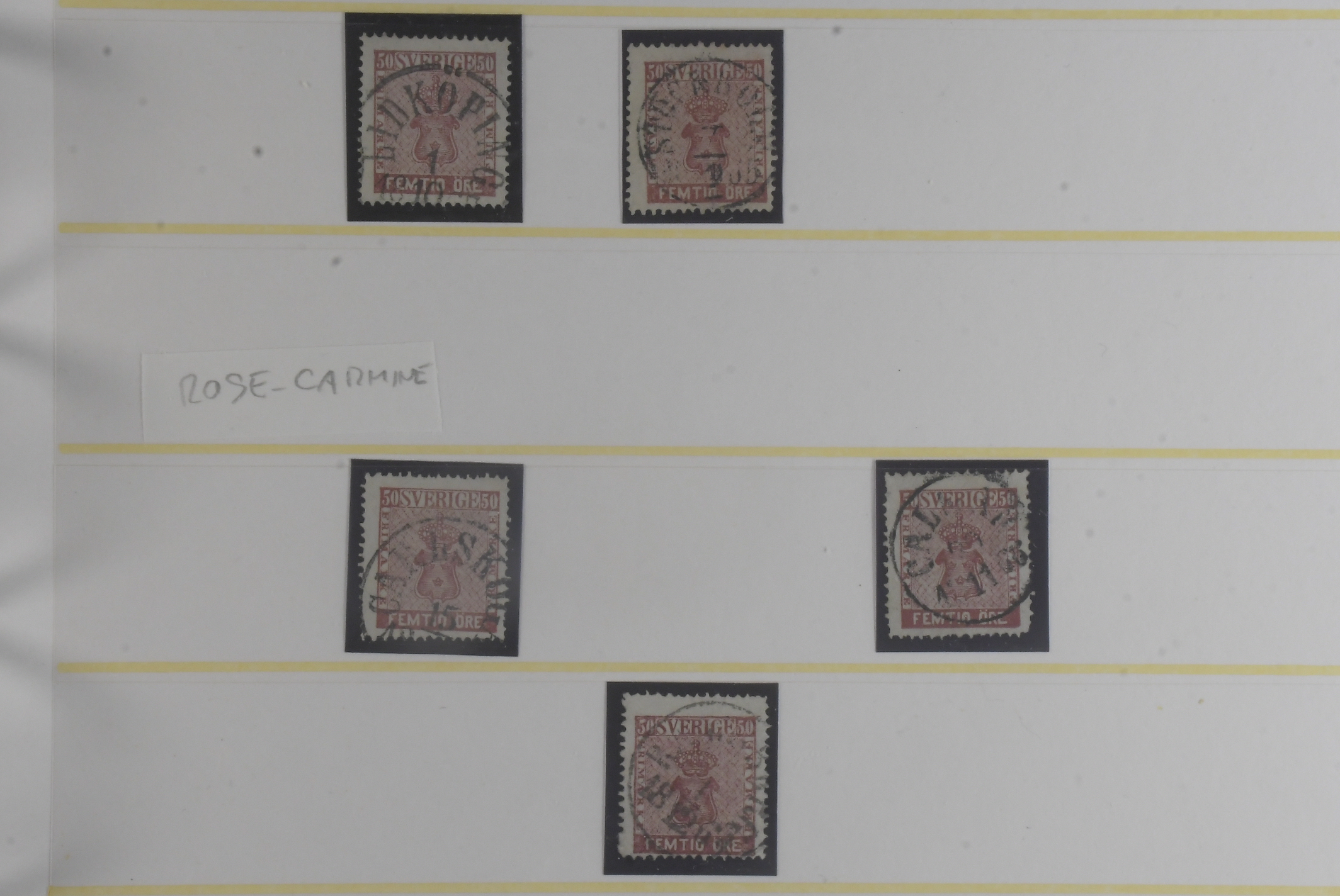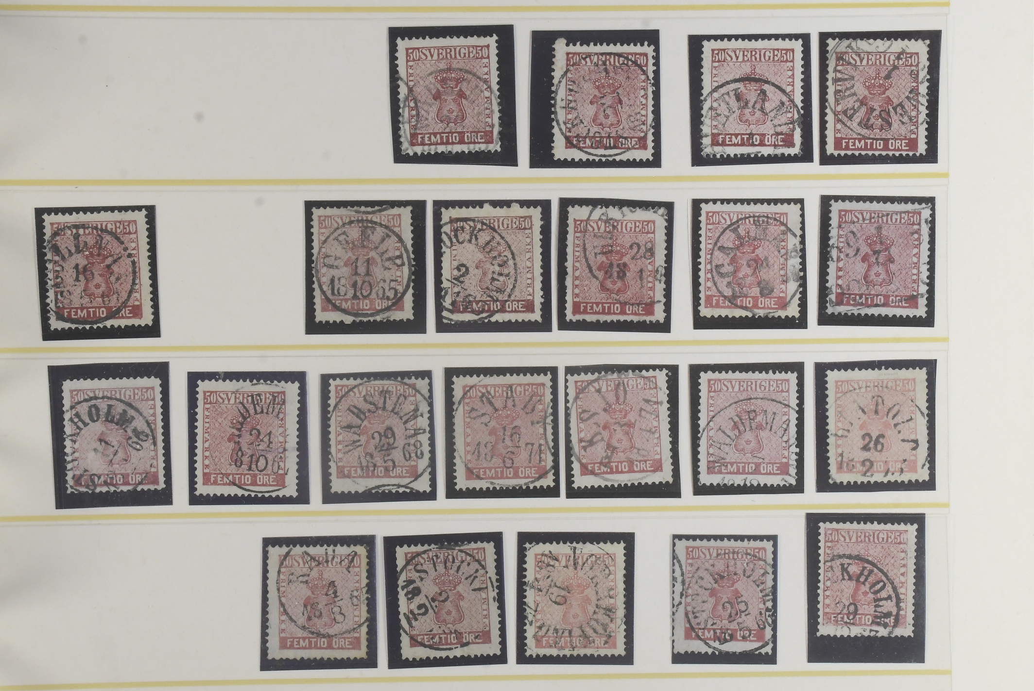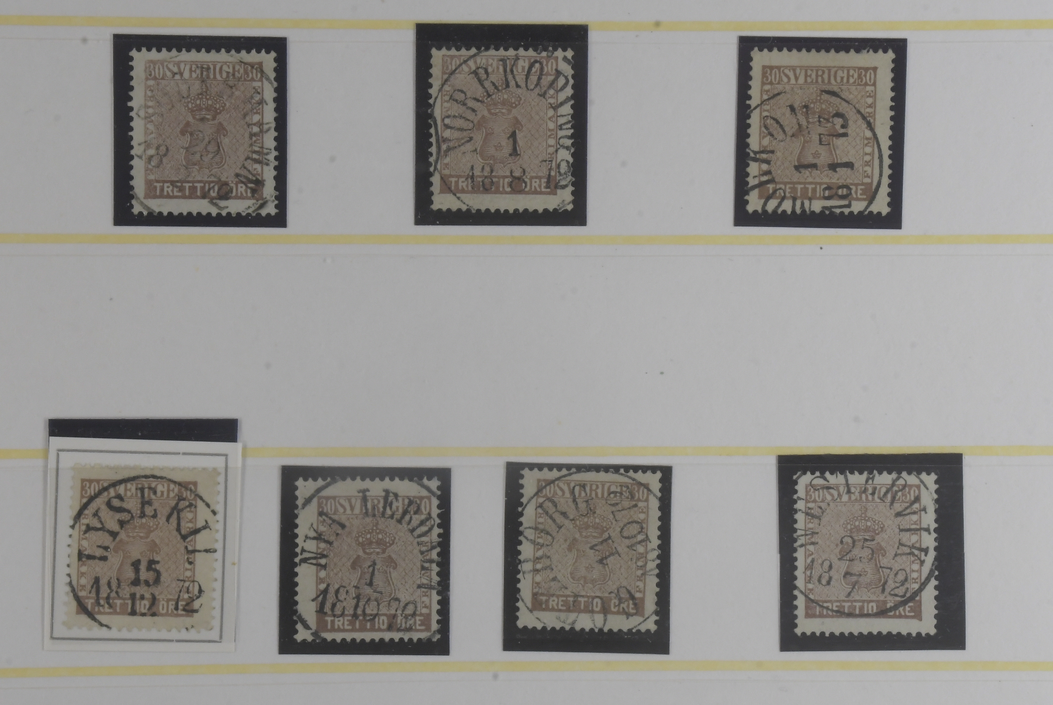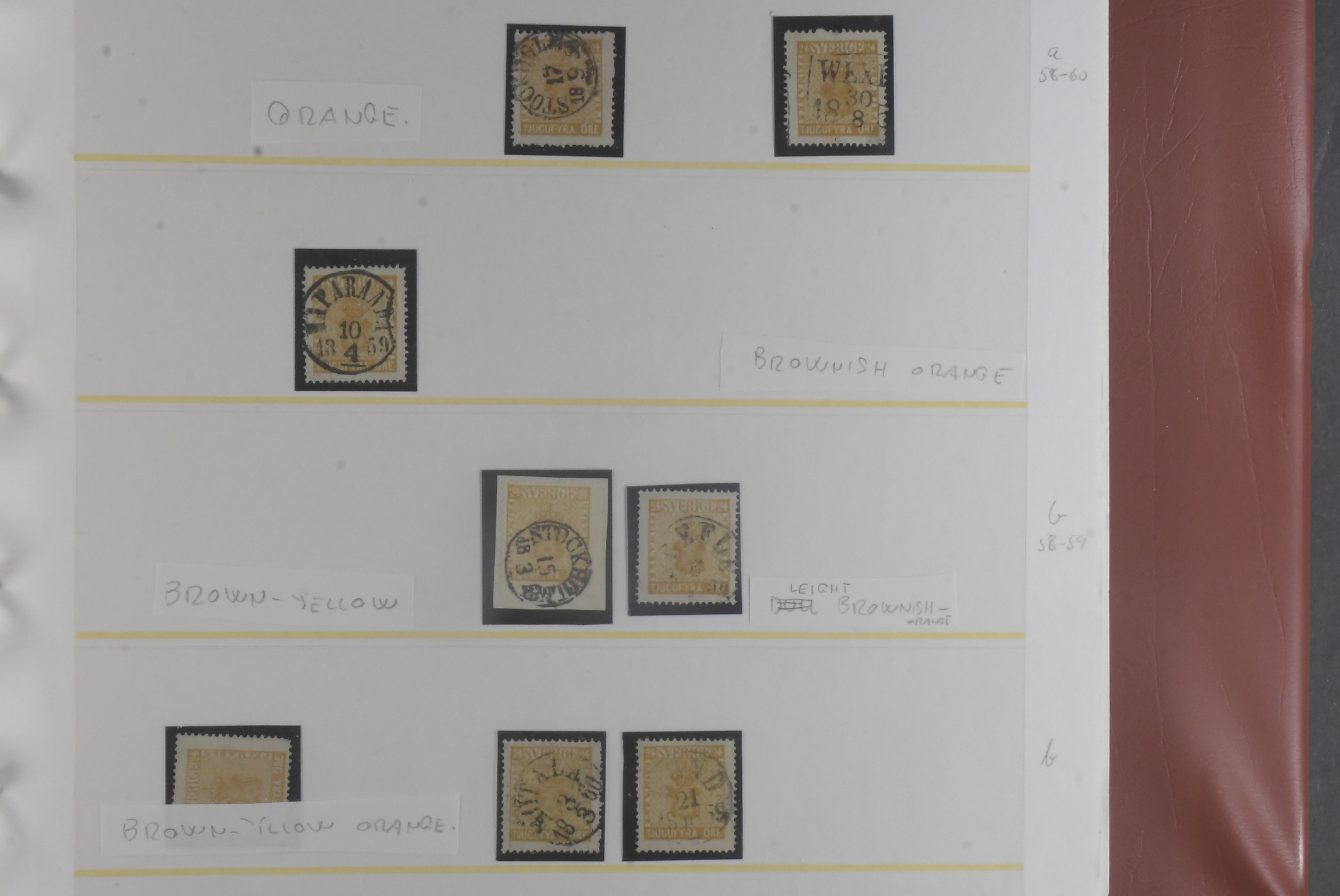Sweden. Collection used COAT-OF-ARMS on visir leaves. Study of shades plus some non-identified duplicates. Selected stamps with readable–superb cancellations, incl. e.g. 14×9 and 40×50 öre (but no 5 öre denominations). The entire lot is presented at www.philea.se. Mostly fine quality. (280)