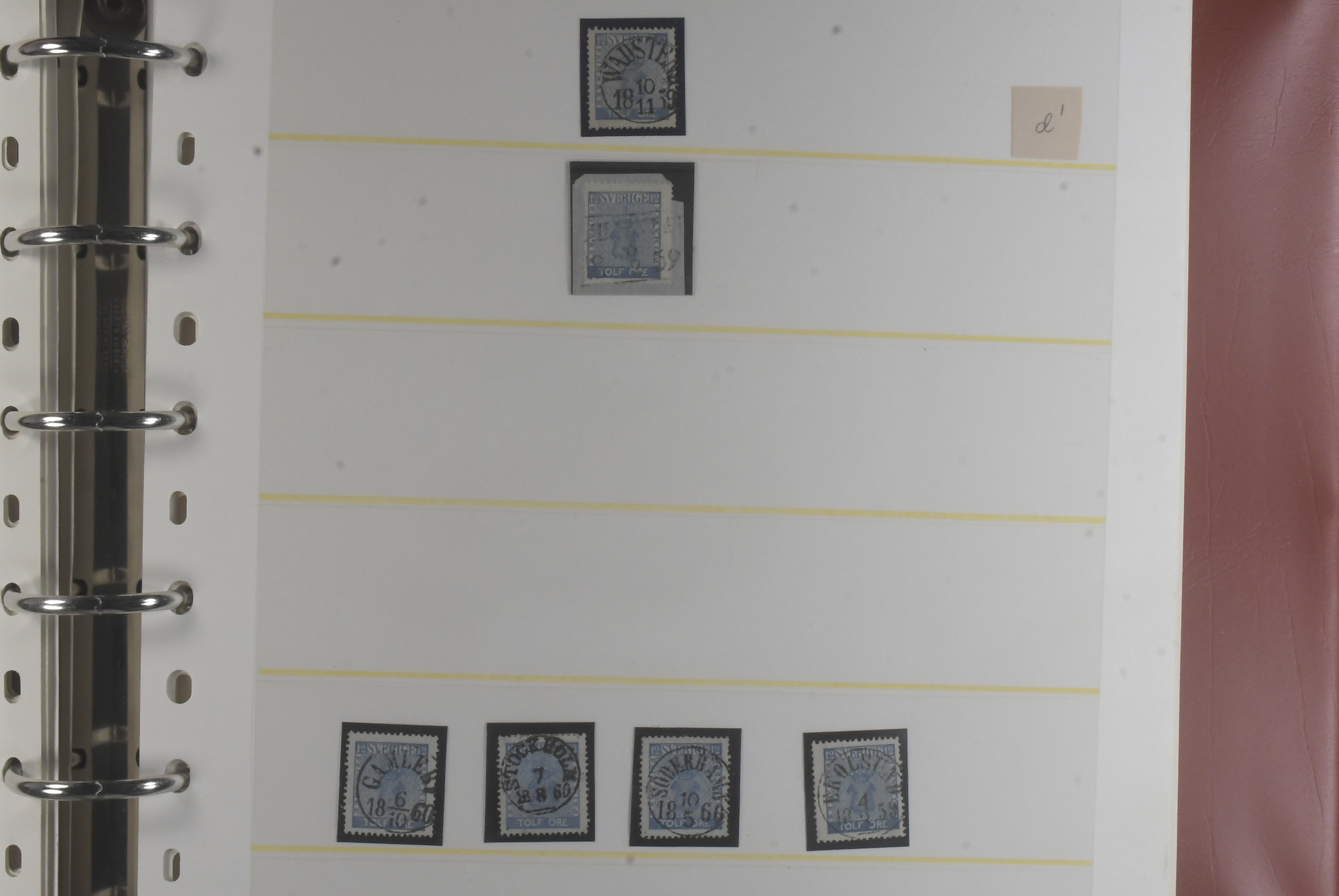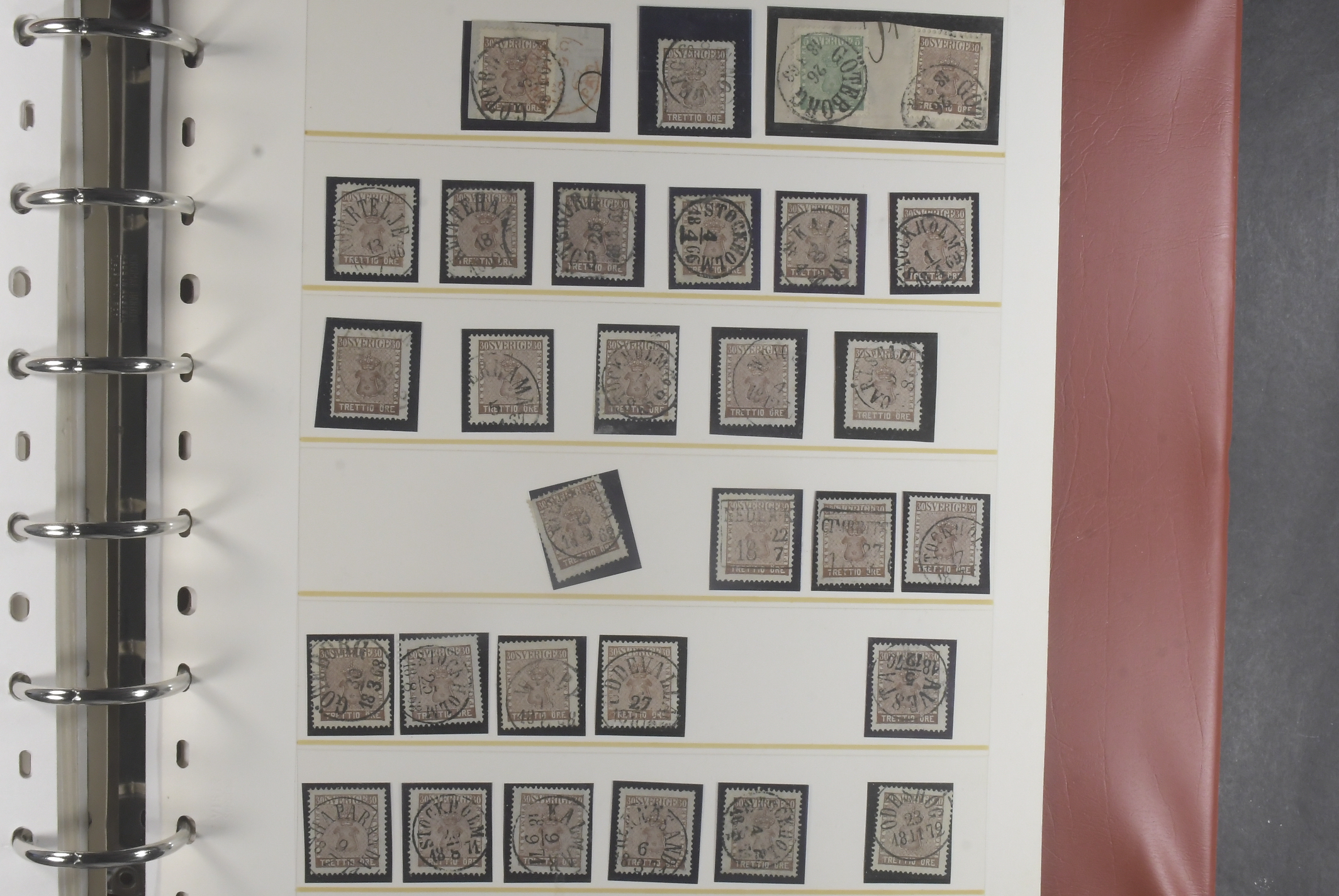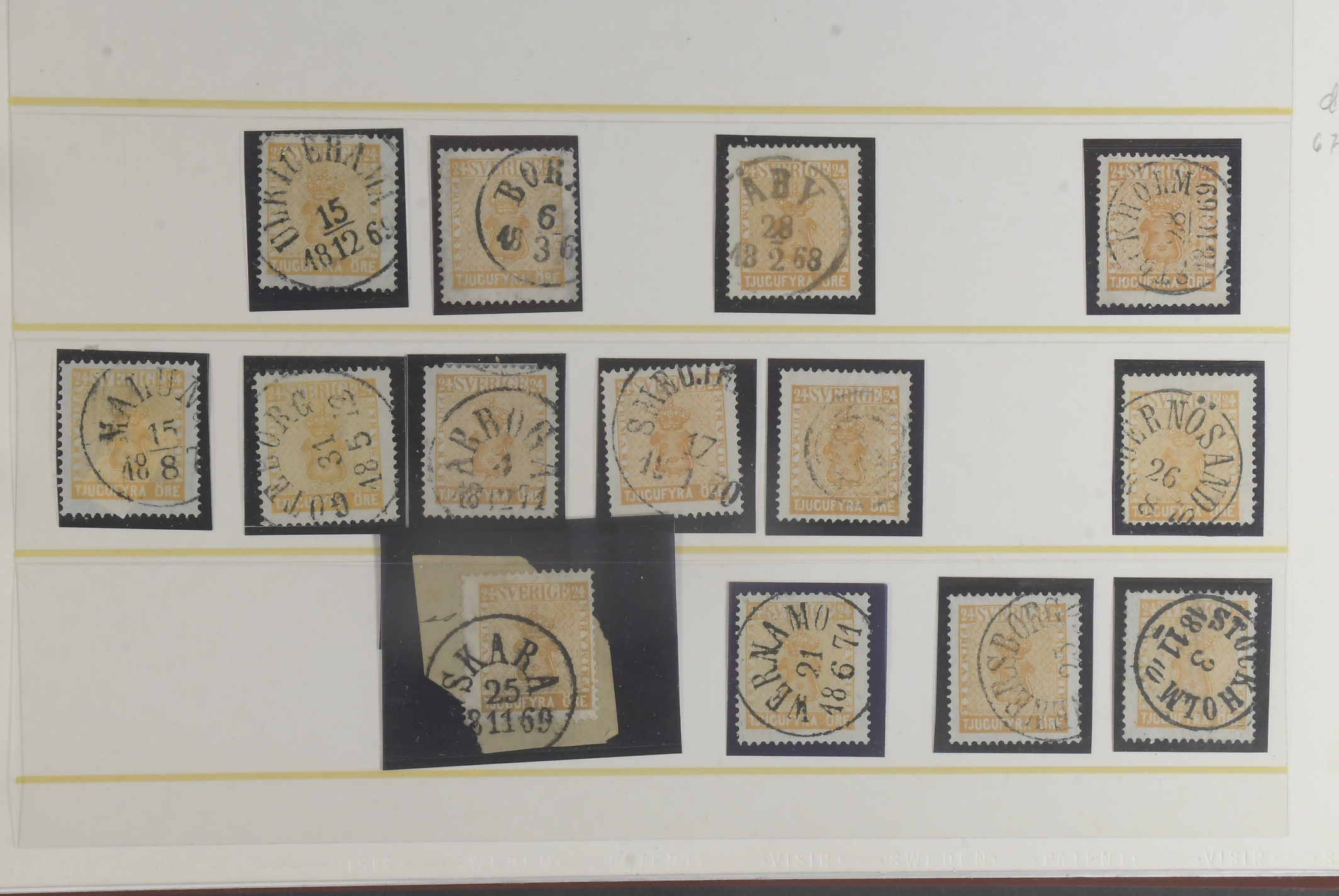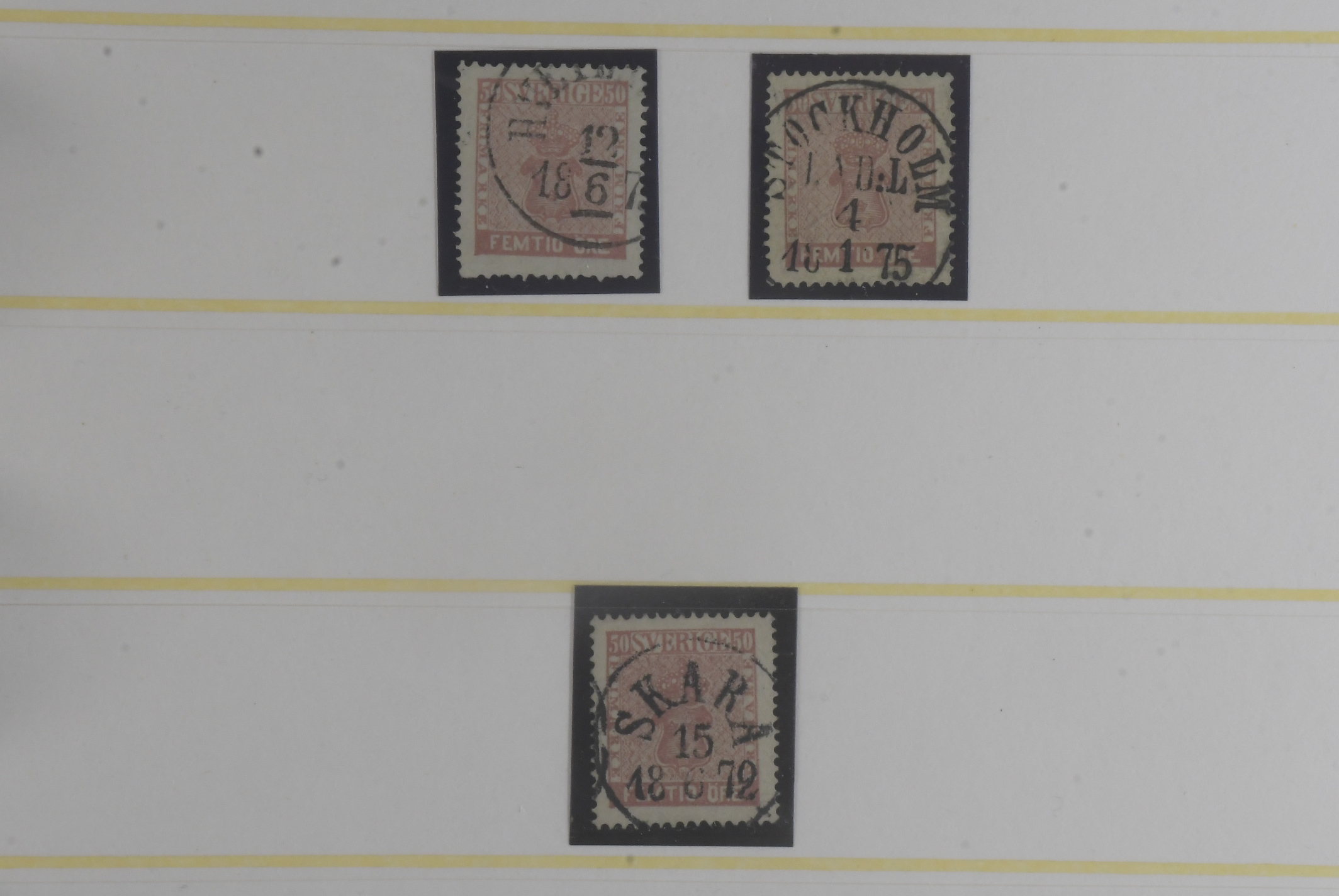 Sweden. Collection used COAT-OF-ARMS on visir leaves. Study of shades plus some non-identified duplicates. Selected stamps with readable–superb cancellations, incl. e.g. 14×9 and 40×50 öre (but no 5 öre denominations). The entire lot is presented at www.philea.se. Mostly fine quality. (280)