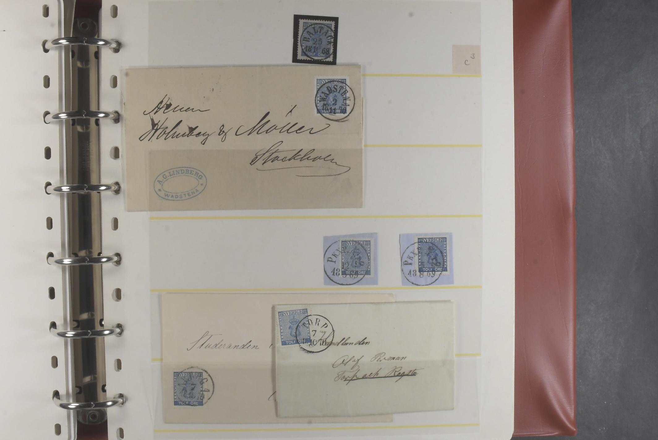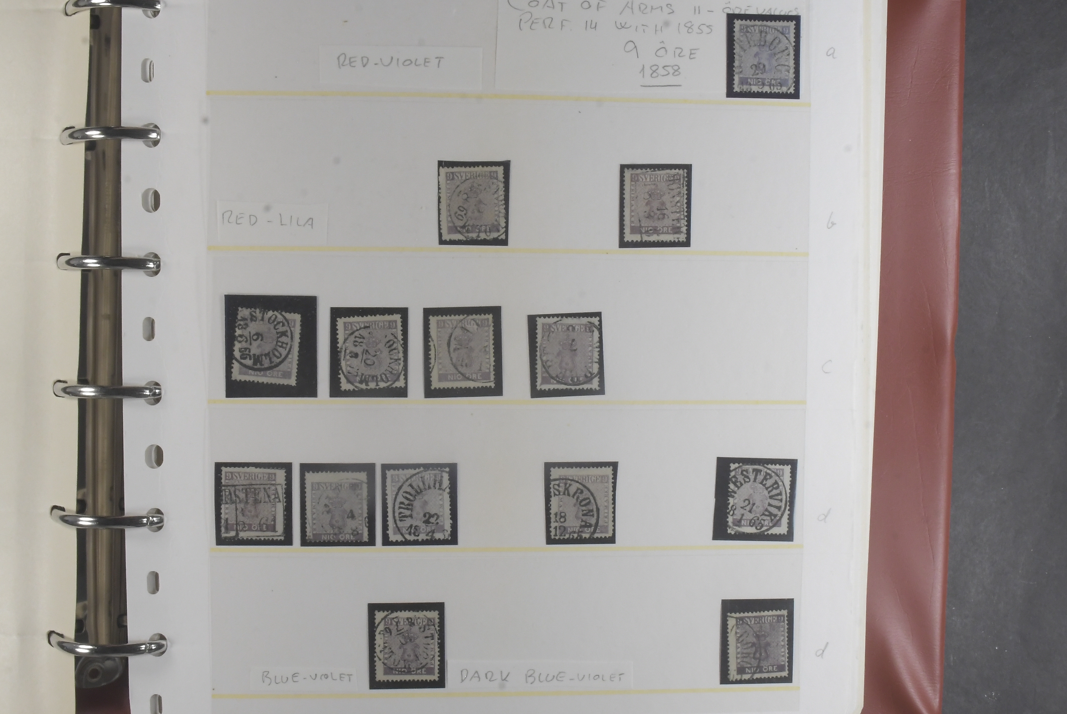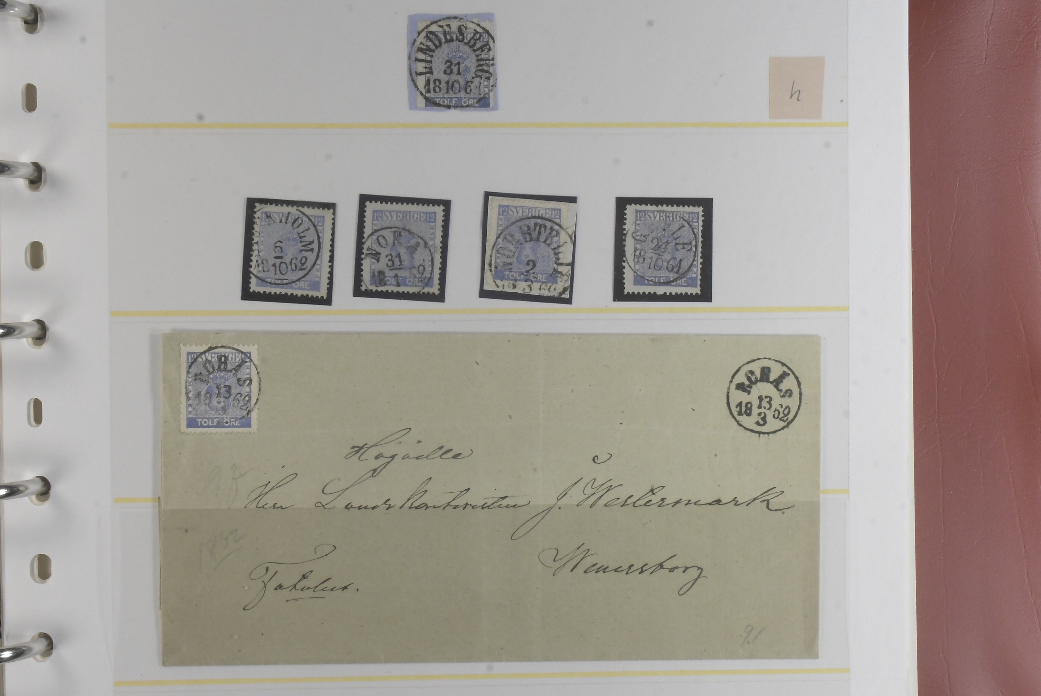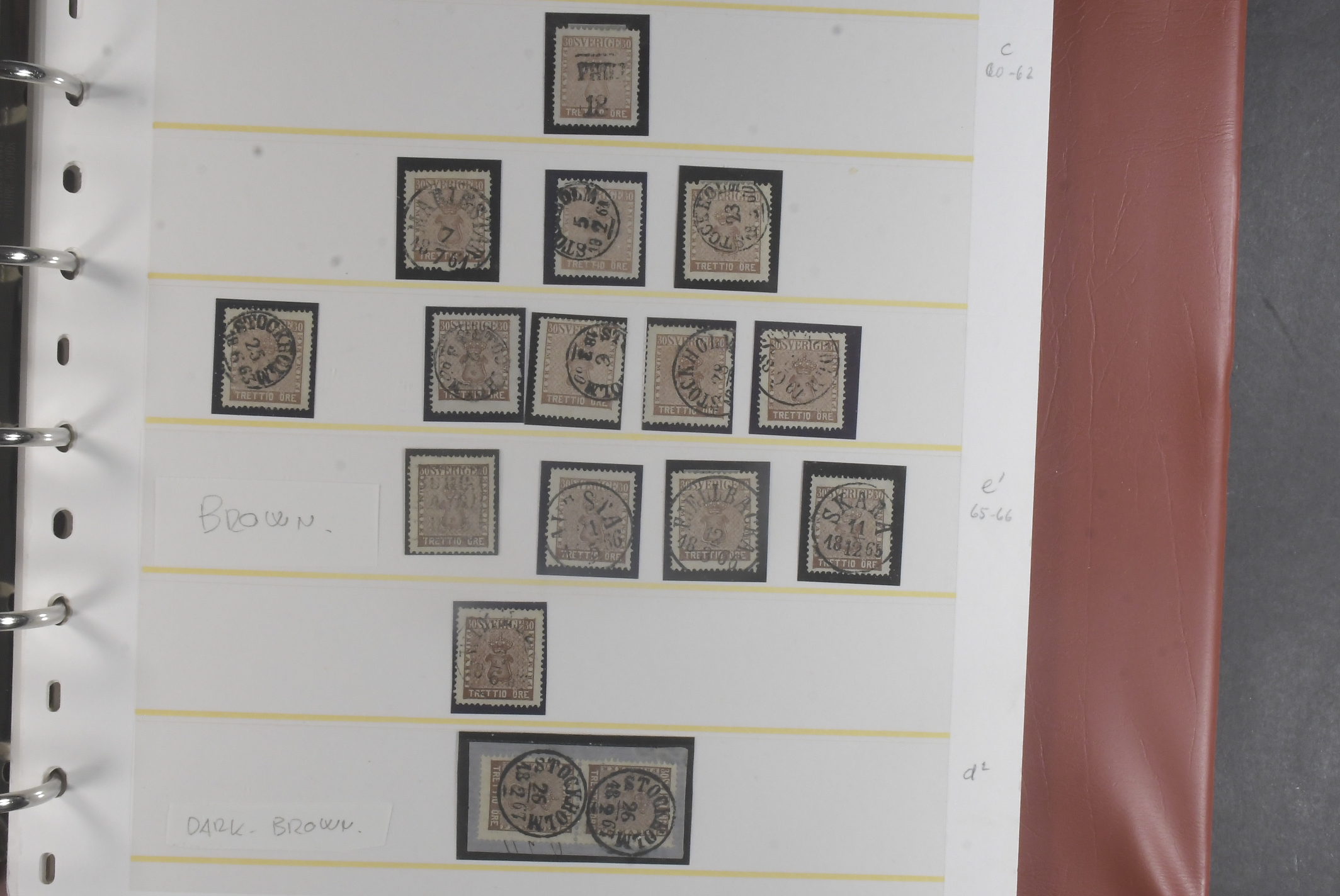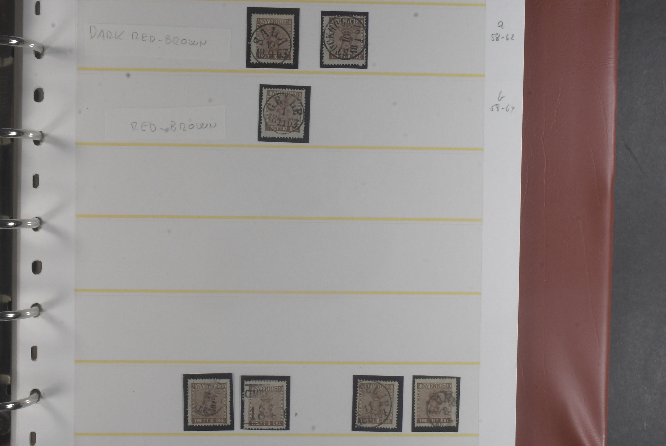 Sweden. Collection used COAT-OF-ARMS on visir leaves. Study of shades plus some non-identified duplicates. Selected stamps with readable–superb cancellations, incl. e.g. 14×9 and 40×50 öre (but no 5 öre denominations). The entire lot is presented at www.philea.se. Mostly fine quality. (280)