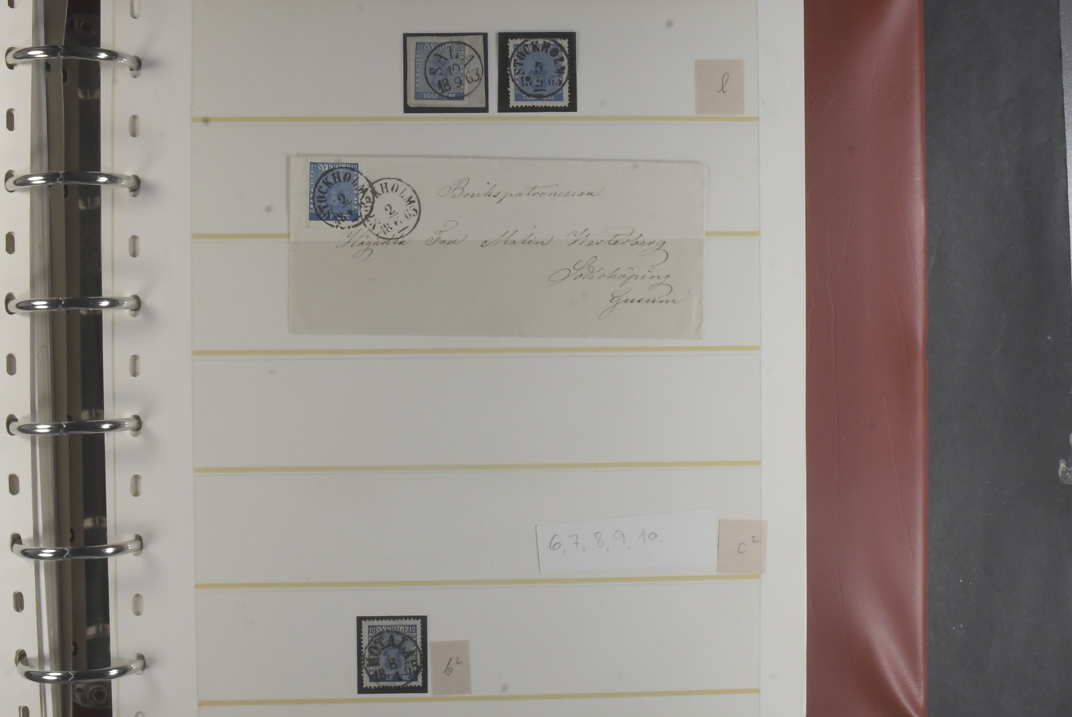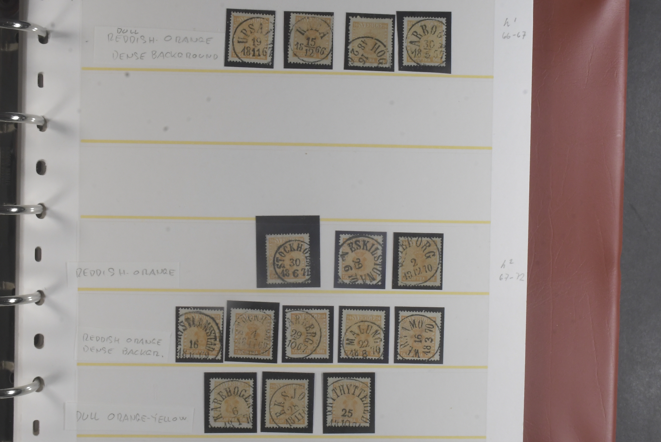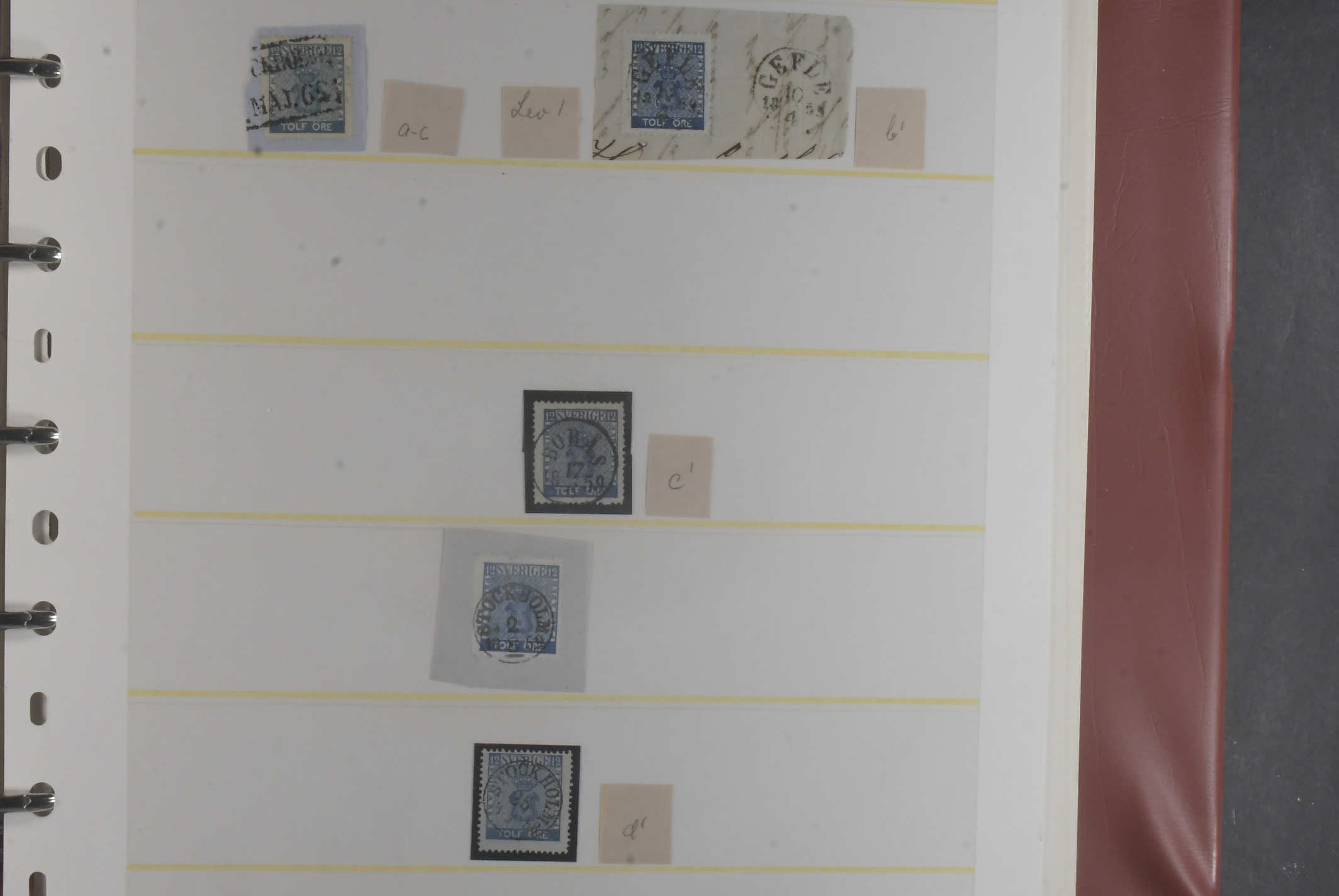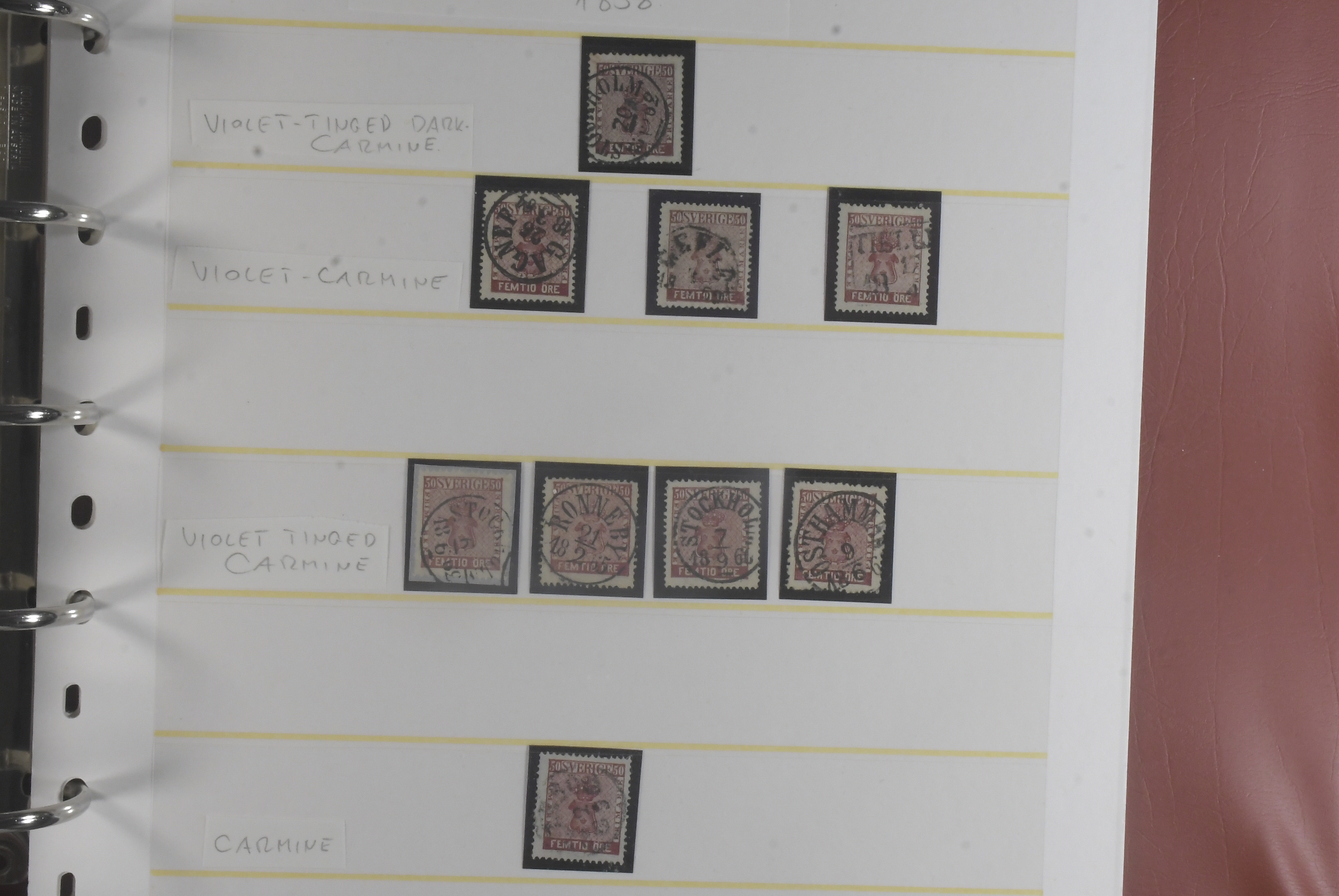 Sweden. Collection used COAT-OF-ARMS on visir leaves. Study of shades plus some non-identified duplicates. Selected stamps with readable–superb cancellations, incl. e.g. 14×9 and 40×50 öre (but no 5 öre denominations). The entire lot is presented at www.philea.se. Mostly fine quality. (280)