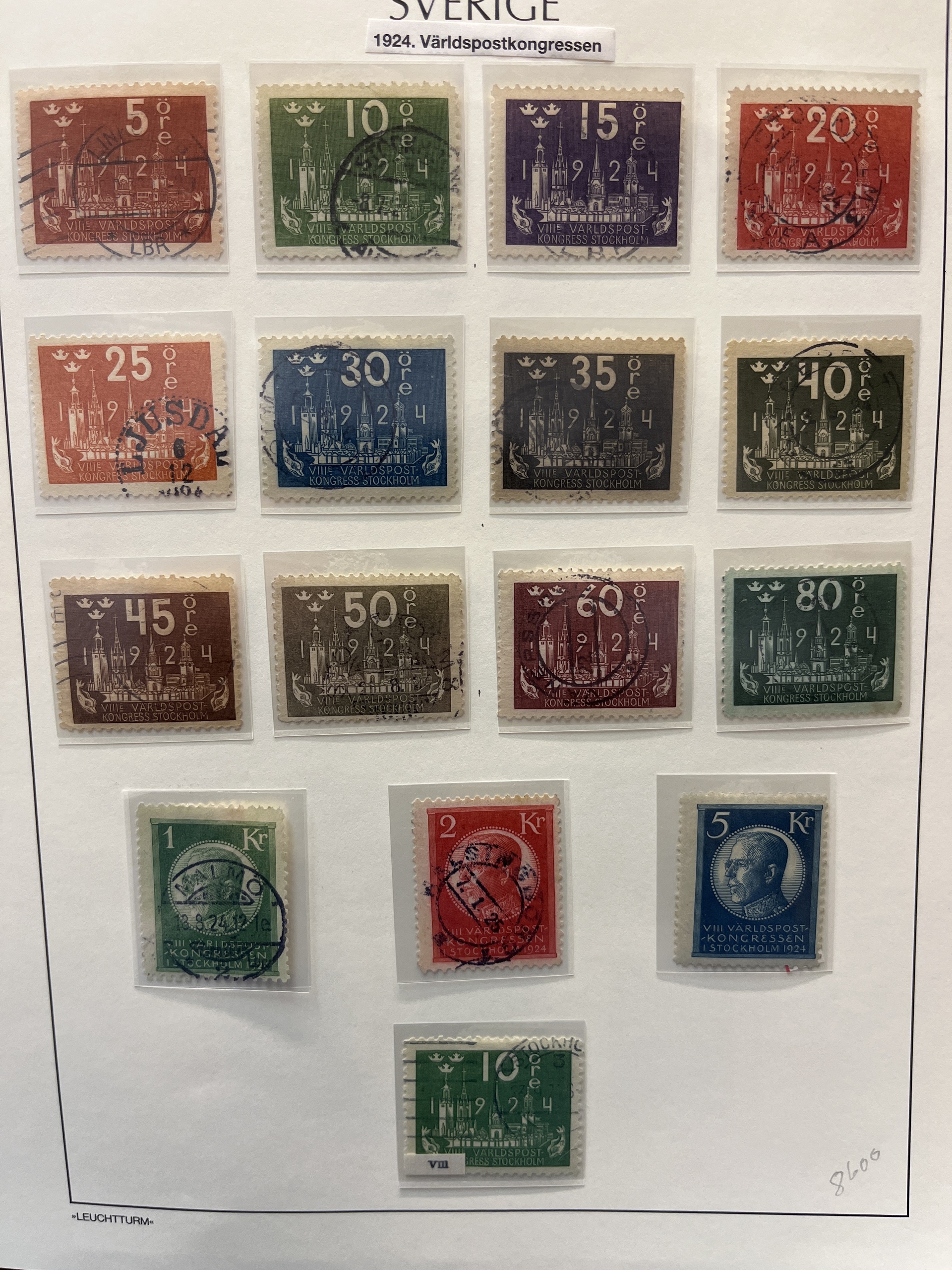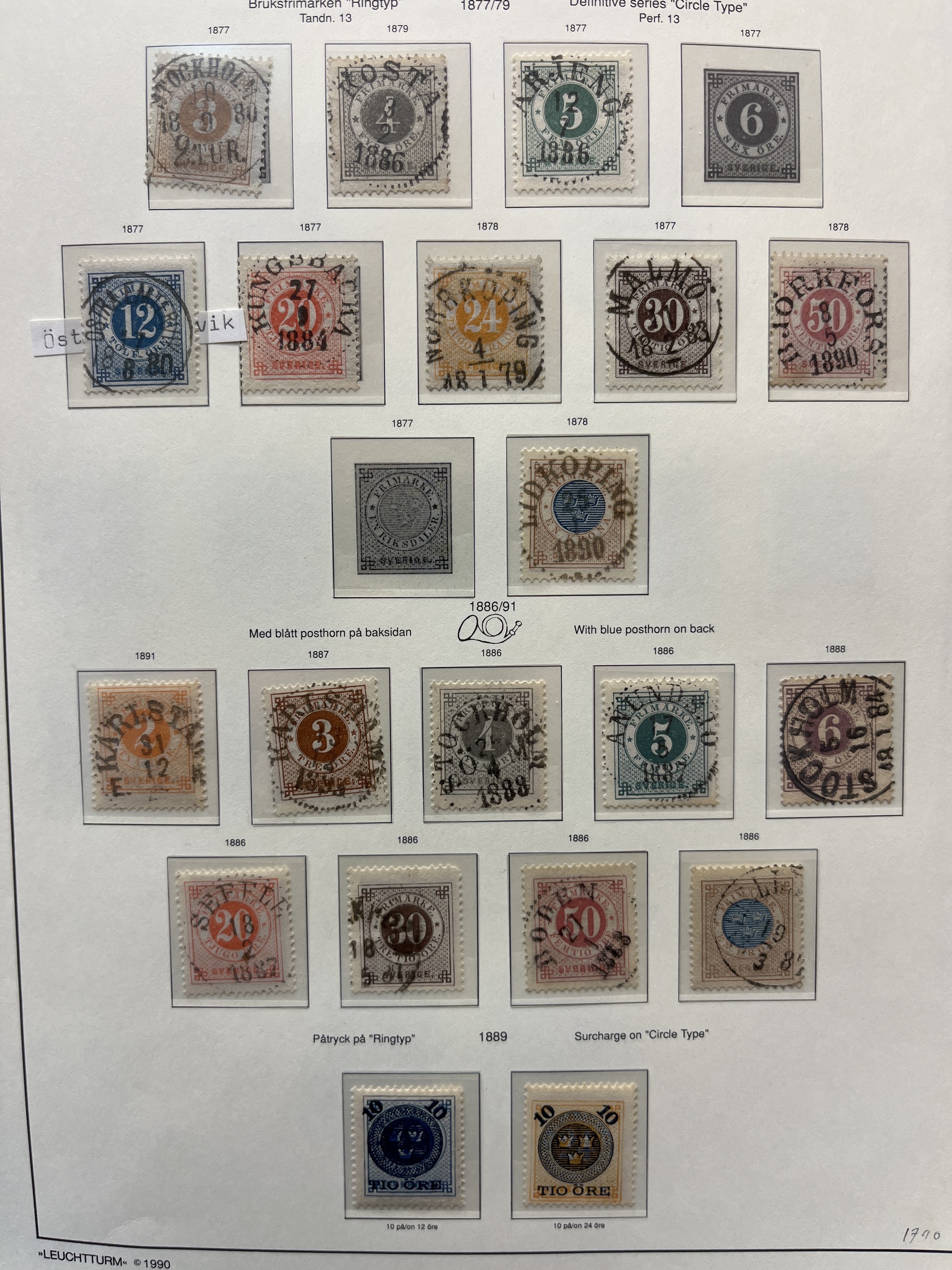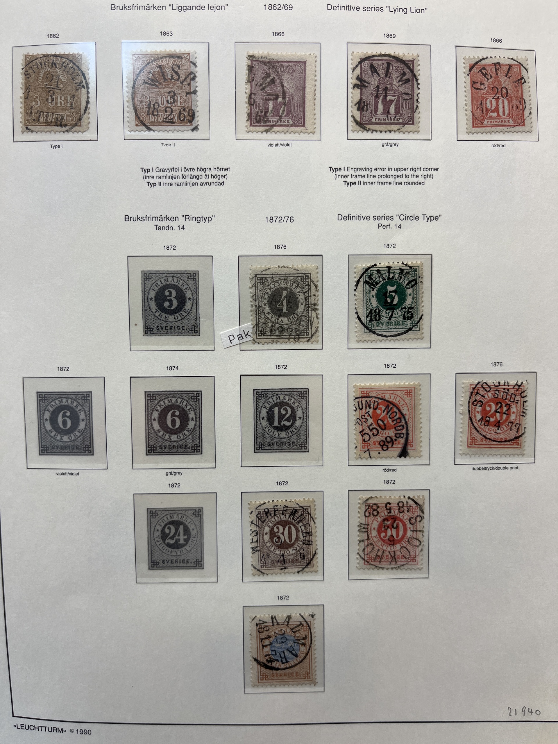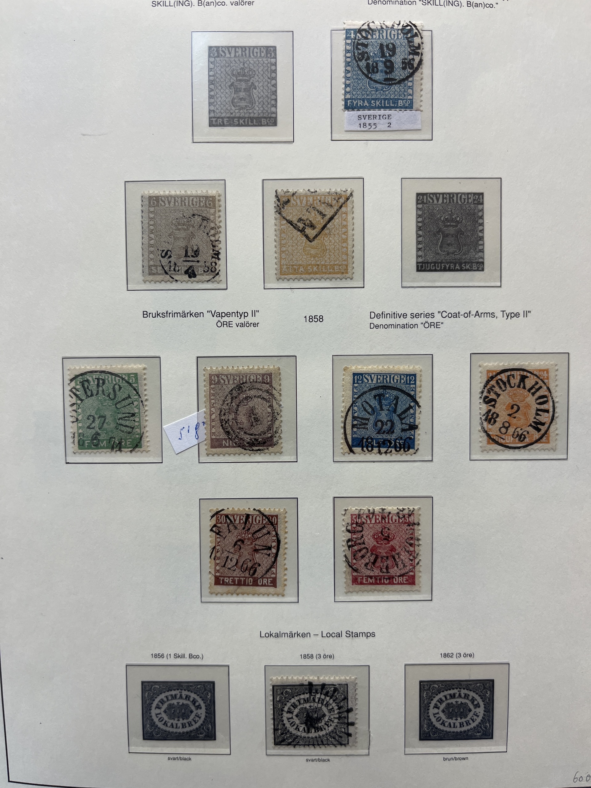 Sweden. Collection used 1855–1936 on leaves. Several with nice canc. on the 1800s, WPC 1924 compl. Please see a selection of scans at www.philea.se. In the beginning mixed quality, later fine.